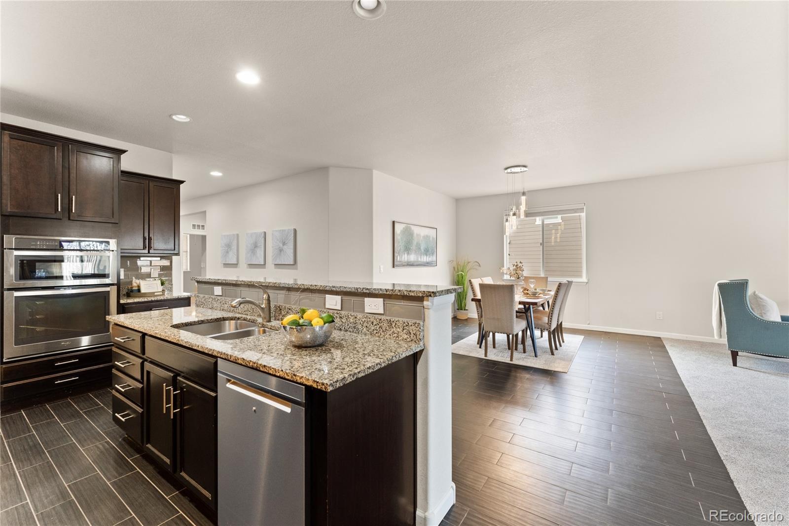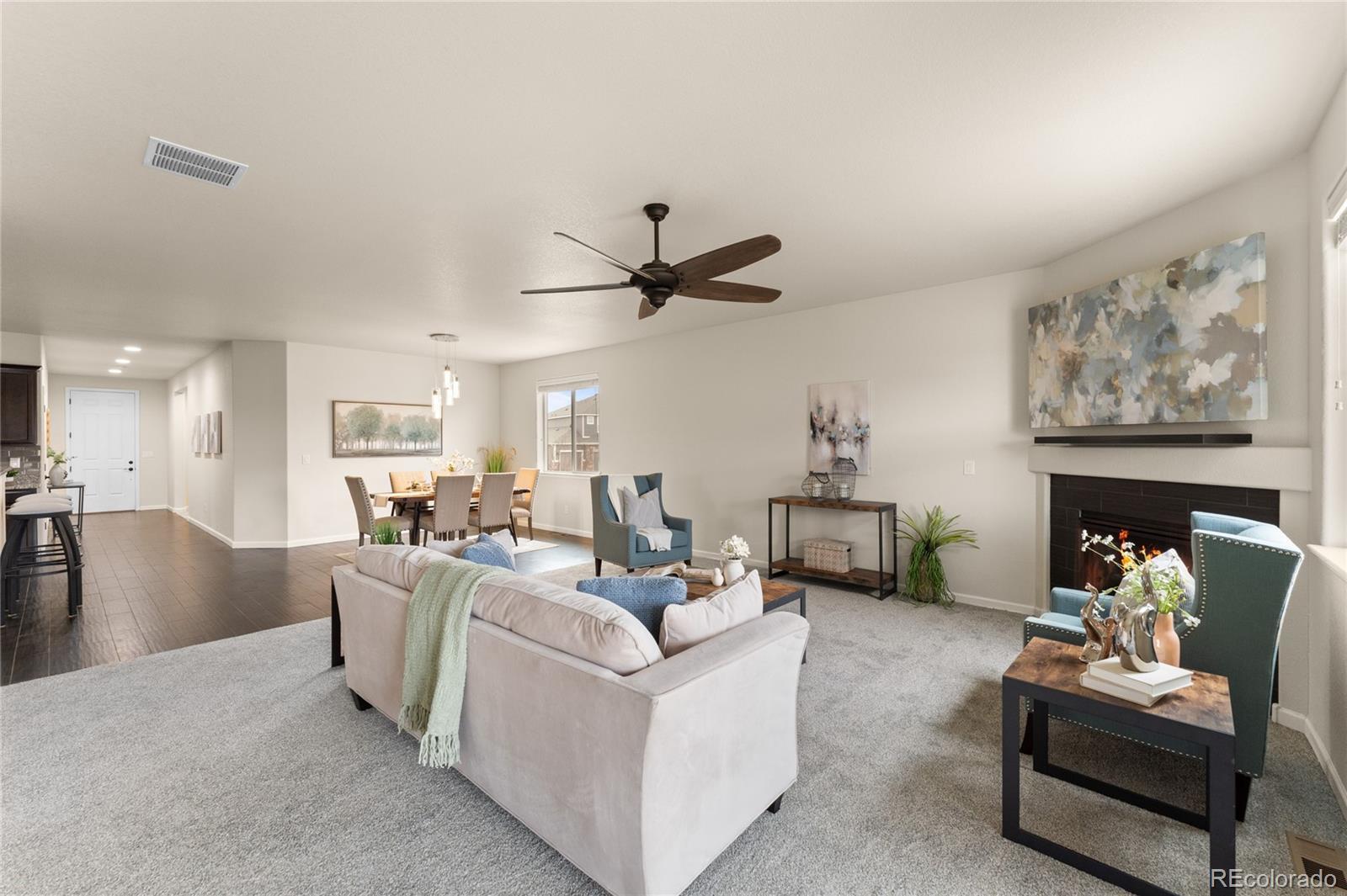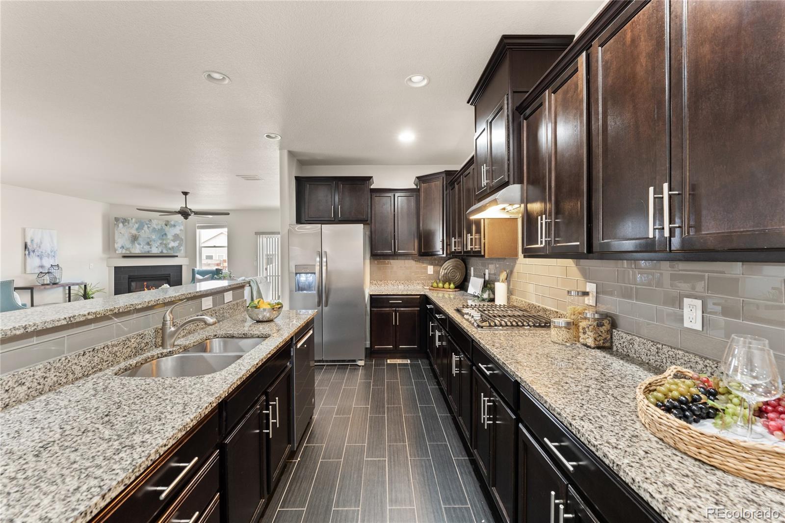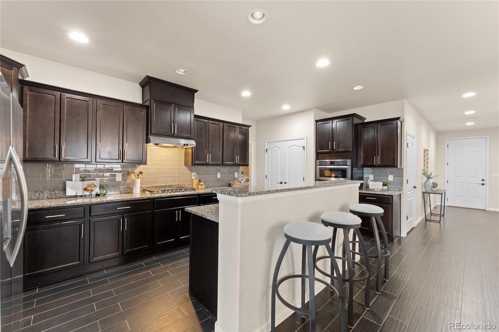 Tucked into the quiet golf course community of Spring Valley Ranch in Elizabeth, 5509 Harbor Town Dr is one of the very few ranch style homes with a fully finished basement and a three-car garage! When you enter, you'll be greeted by warm, wood-look ceramic tile floors, and brand new carpet, both spreading across the main level in exactly the places you'd want them, and providing a beautiful contrast of color that gives this home a welcoming atmosphere. The kitchen has rich espresso colored cabinets, a sleek grey glass tile backsplash, and a brighter granite that beautifully ties in the colors of the home, and provides a pop of contrast to make the kitchen visually exciting! The stainless steel appliances, gas cooktop, coffee bar, and bar seating will make this kitchen the central hub where everybody WANTS to hang out! The primary suite has an en-suite bathroom with granite counters, a standup shower with oiled bronze surrounds, a soaking tub, and a generously sized walk-in closet. And off the 3-car garage is the laundry room, meaning this home can truly be used for main-level-living. Head downstairs, and you'll find an absolutely CAVERNOUS finished basement! The family room is legitimately massive, and your imagination is your only limit down here. Game room, movie theater, golf simulator...there is SO MUCH ROOM FOR ACTIVITIES! There's also another bedroom and modern bathroom, making this space perfect for older kids, or even a multi-generational living situation. The Spring Valley Golf Club is an absolute hidden gem! With 18 challenging holes of golf, and an incredible clubhouse with a great restaurant and a friendly atmosphere, this is the ideal neighborhood for somebody who wants to live in a golf course community, and be away from the hustle and bustle of a bigger city, but without being in the middle of nowhere. Come take a look today!