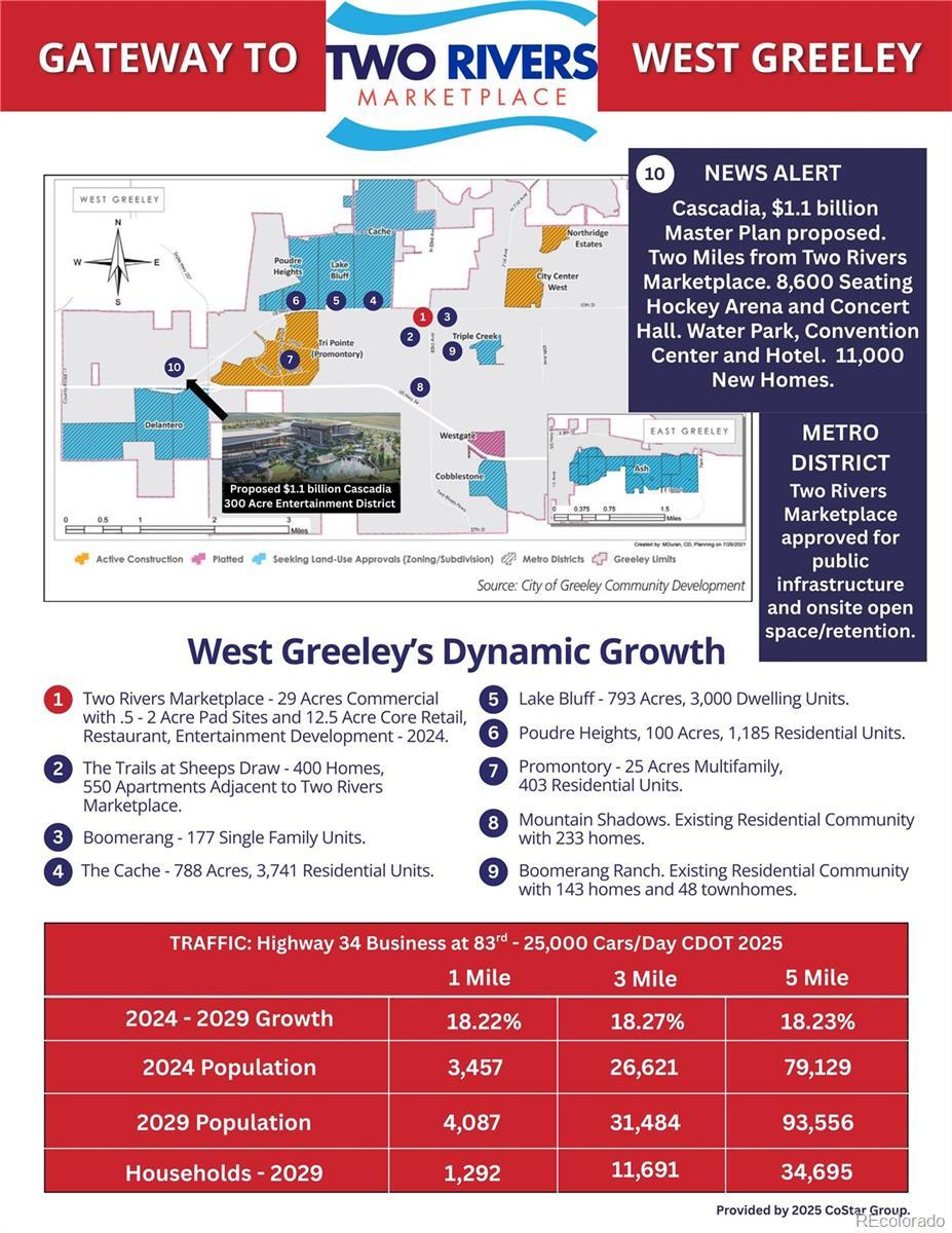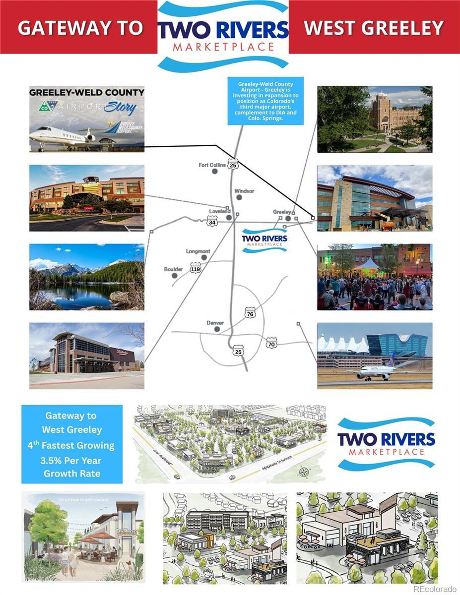LOT 18 - PERFECT 40,000 SQ. FT. GROCER OR BIG BOX IN STRONG, QUICKLY EXPANDING WEST GREELEY. TWO RIVERS MARKETPLACE IS AT THE GATEWAY. UP & COMING DYNAMIC COMMERCIAL COMMUNITY ON THE HIGHWAY (East/West Corridor into Greeley) AND 83RD (Key North/South Transportation Corridor). Perfect for Grocer with 40,000 sq. ft. on 3.46 acre/150,718 sq. ft. Lot. Ease of Access and Interconnection to the entire commercial community, restaurants and so much more. So Much Residential Growth - Huge Need for Commercial Businesses. Twelve (12) Highway and 83rd Lots are designed for "Quick and Easy Access" with 9 Lots with DRIVE THRUS. CENTER CORE is envisioned for "Stay and Play" features with Hotel, Grocer, Brew Pubs, Restaurants. Restaurants encouraged to emphasize Rooftop decks with mountain views and east Facing Outdoor Patios on permanent open space with community features. The highway generates approx. 25,000 cars per day and growing. The site is surrounded by existing single family and multifamily developments, and many new large scale residential developments under way - approx. 15,000 new homes on their way. The property totals 29 acres and is zoned C-H, Commercial High. Grocer/Big Box will have many easy Access Points: 86th Ave., 12th/83rd. Roundabout, and New 11th Street. The entire loop road and 11th Street entrance is completed - allowing opportunities for Center Core Lots in 2026. City of Greeley is development friendly and encourages end user submittals early on for quicker development turnarounds. Two Rivers Marketplace Metro District and Association are up and running. Metro District currently covering majority of expenses. Please contact listing agents for more details. Co-Listed with Brad Pech, RE/MAX Commercial, 303-504-3444.