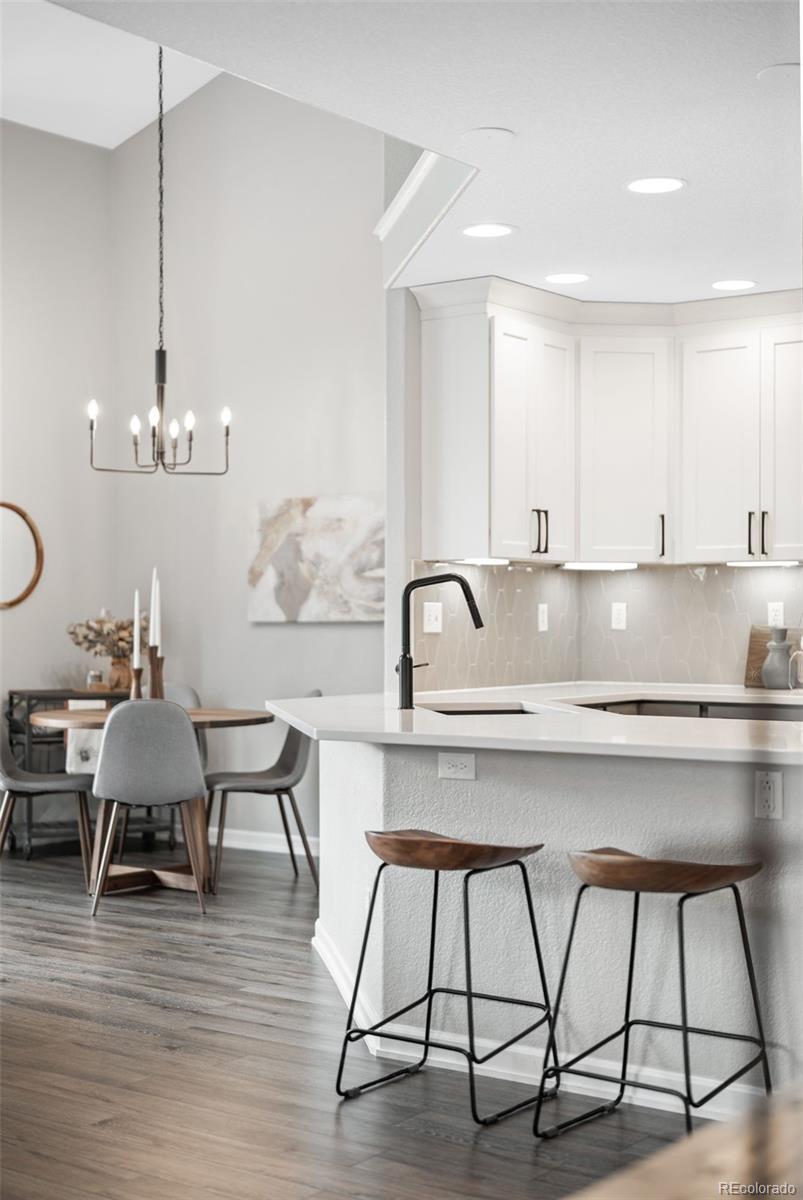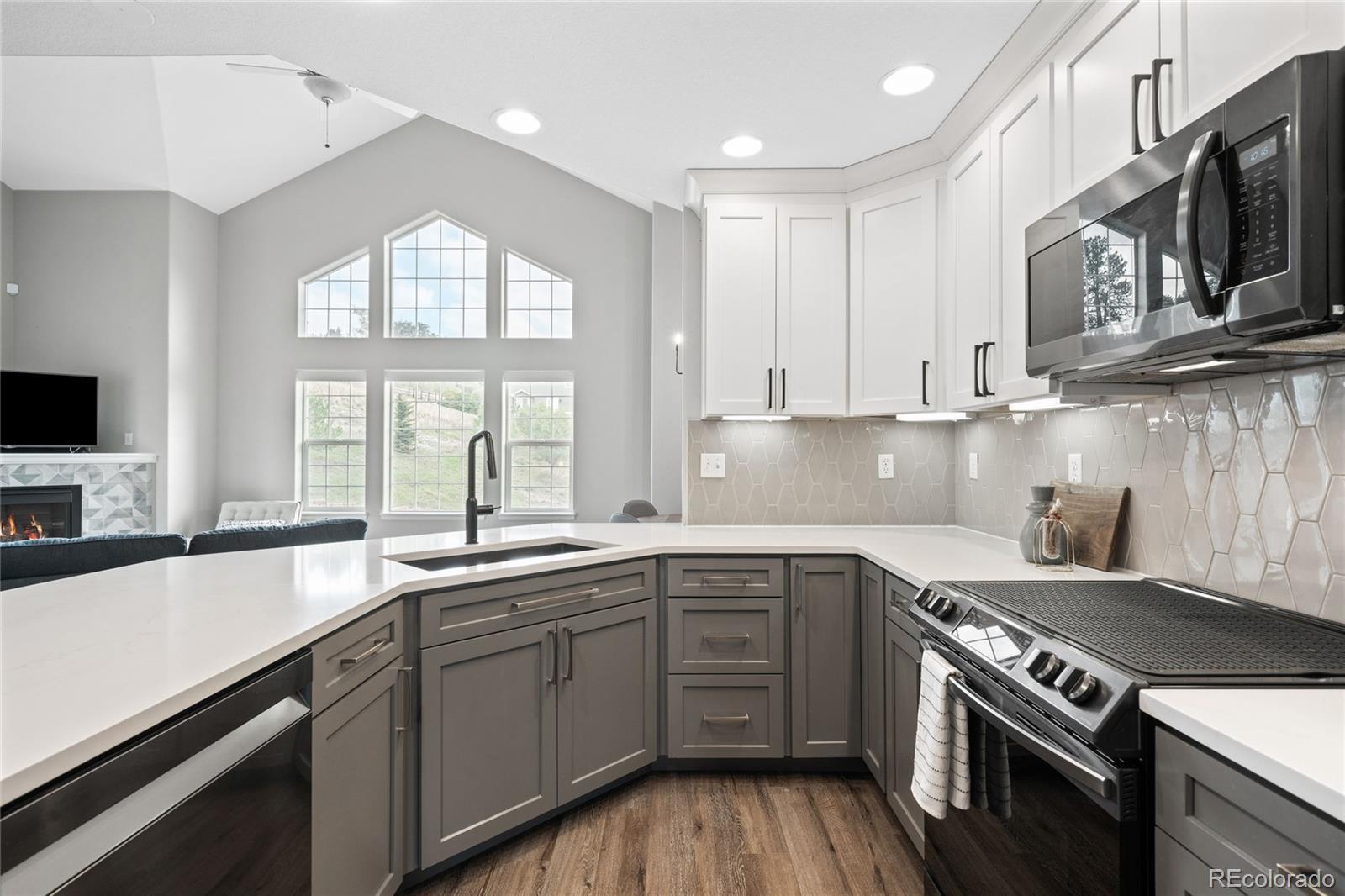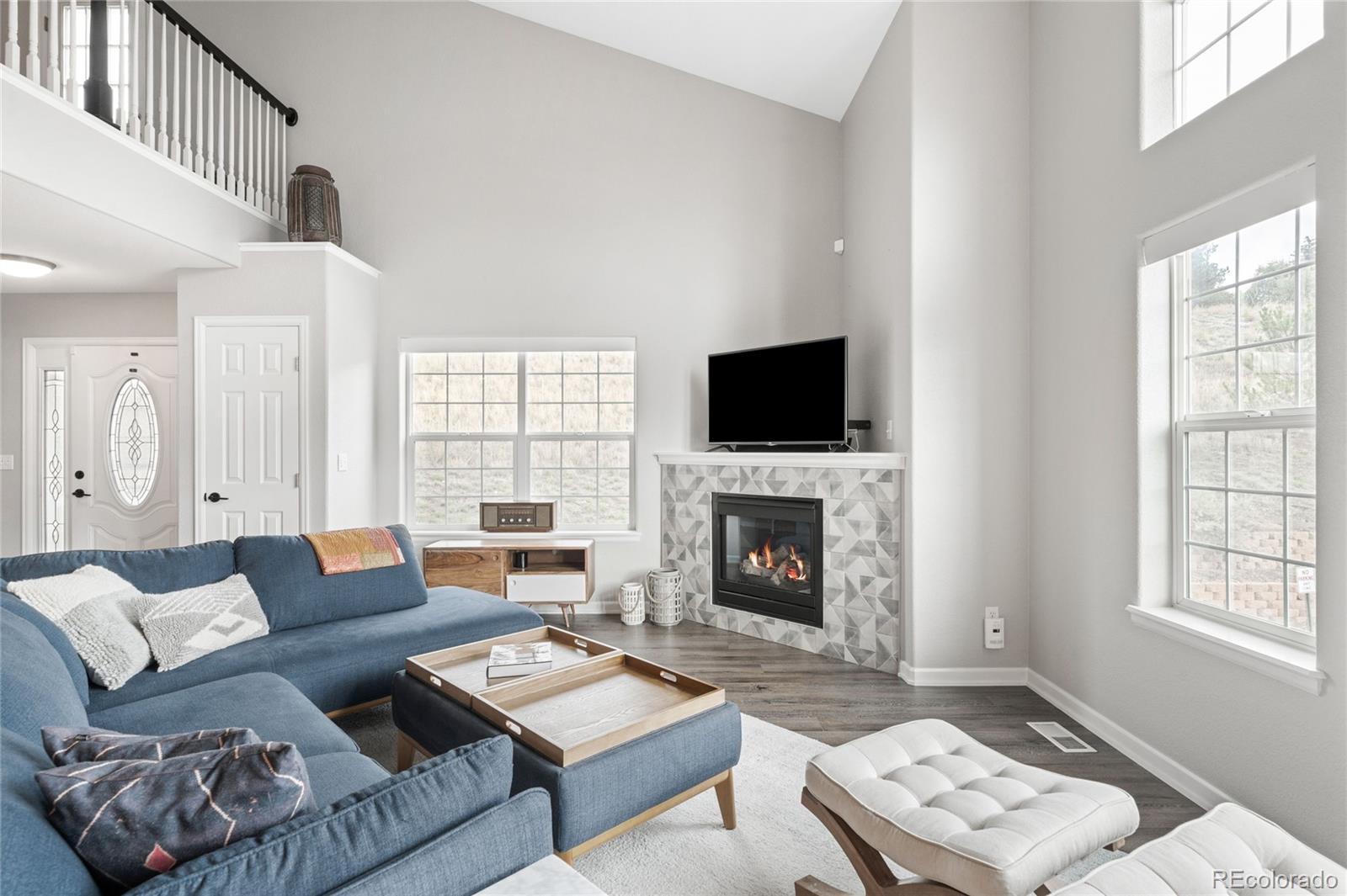 Beautifully reimagined with elevated design and serene surroundings, this end-unit townhome in Bear Valley showcases gorgeous views throughout. Vaulted ceilings and expansive windows fill the open-concept living area with natural light, highlighting a fireplace with updated tile, luxury vinyl flooring, and updated finishes throughout. The remodeled kitchen boasts new quartz countertops, a designer tiled backsplash, and gorgeous new cabinetry — ideal for both everyday living and entertaining. On the main level, a serene primary suite offers views of the adjacent meadow and a luxurious, fully updated bath. Upstairs, a versatile loft with a private balcony provides the perfect space for work or relaxation. The finished lower level adds flexibility with a rec room, guest suite, or a home gym, complete with a full bath, laundry, and access to the large two-car garage. Nestled in a peaceful setting with a trail leading to Peak View Park just beyond the backyard and less than a mile to the Bear Valley Park trail system, this residence offers privacy and a refined connection to Colorado’s natural beauty.