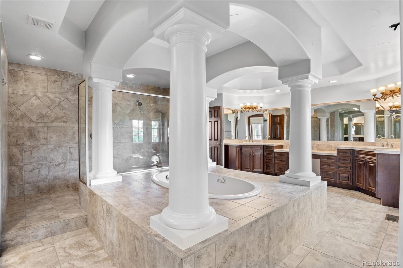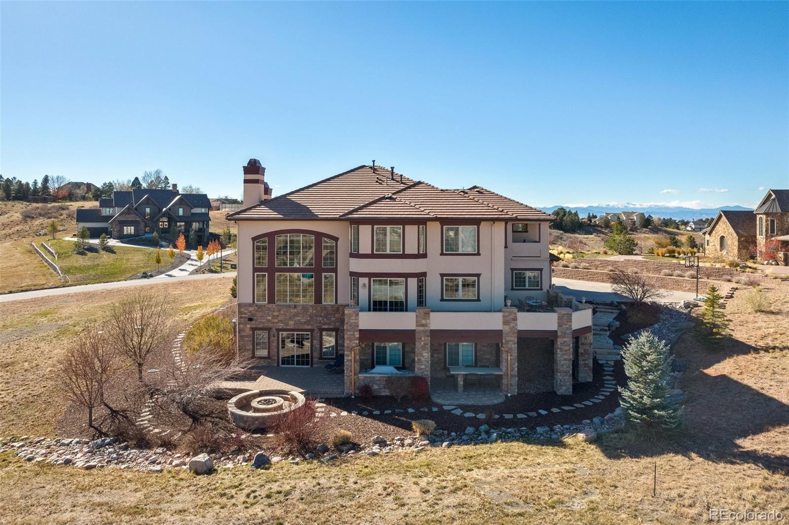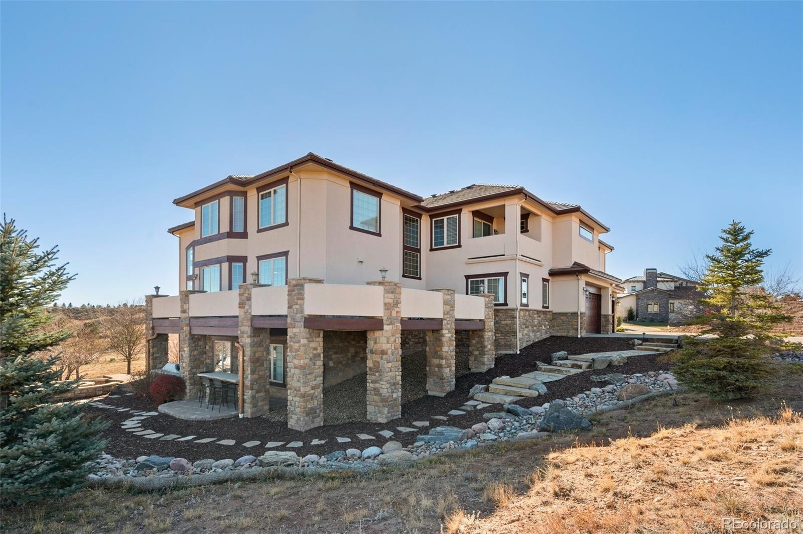 The ultimate sanctuary within one of the most prestigious and desirable neighborhoods in the Denver metro area, Estancia, is available for a 6 month lease and immediate move in. This Tuscan-inspired home boasts dramatic ceilings, large windows, refined finishes, and an incredible layout, perfect for hosting family and entertaining guests. Step inside the two-story foyer and you’re greeted by the formal living room with fireplace, dining room with dual entrances and access from the kitchen, and a spacious home office. As you pass the floating curved iron spindled staircase you enter the large family room showcasing floor to ceiling windows and a stacked stone fireplace. The gourmet kitchen offers plenty of cabinet space, granite countertops with a large eat-in island, stainless steel appliances, and separate eating area that provide access to the wraparound deck. Completing the main level and you will find a large bedroom, en-suite bath, powder room, and laundry/mud room with entrance to the oversized 4 car garage. Head up the second set of stairs to the magnificent primary suite offers a covered private patio with beautiful views, a 3-sided fireplace separates the sleeping quarters from the sitting area with wet bar. The spa-like primary bathroom is just over 1,000 sq/ft and features double vanities, double water closets, stand-alone tub, double walk-in shower, spacious walk-in closet, a steam shower, and the tucked away workout room. There are three additional bedrooms, each with walk-in closets and en-suite bathrooms on the second level. The finished lower walk-out level includes an extravagant entertainment area with home theater, full bar/kitchenette, pool table area, gaming space, 3/4 bath, and storage room. Enjoy the outdoor private oasis entertaining all season with the covered patio outside the lower-level rec room with dual heaters, built-in stone dining table, gas grill, and fire pit for al fresco dining or a chilly night by the fire.