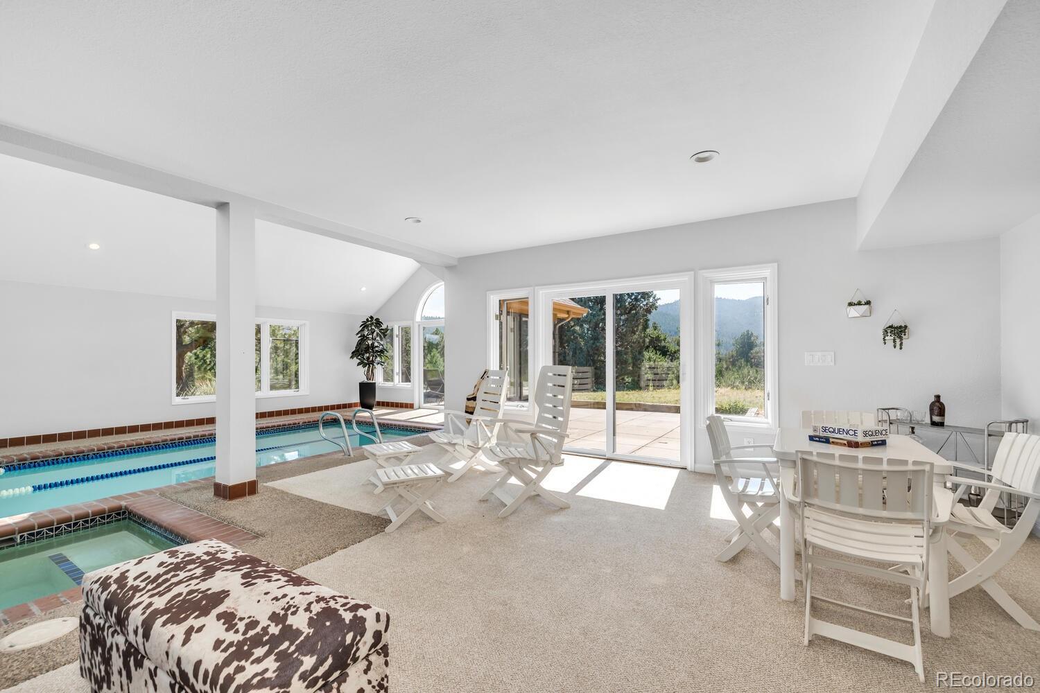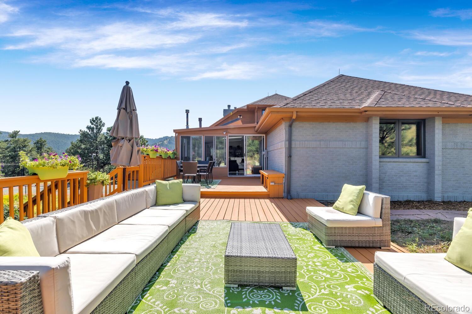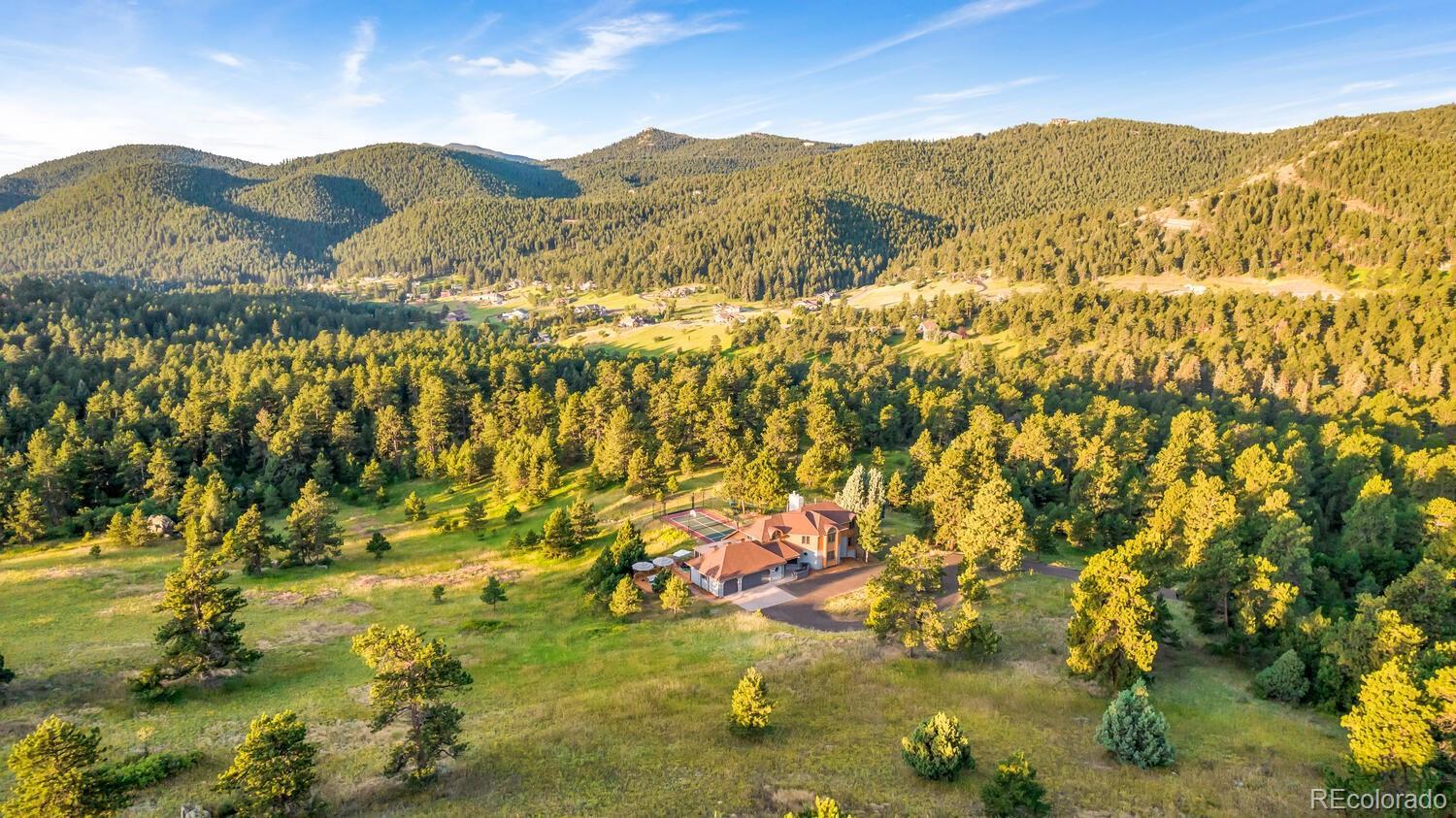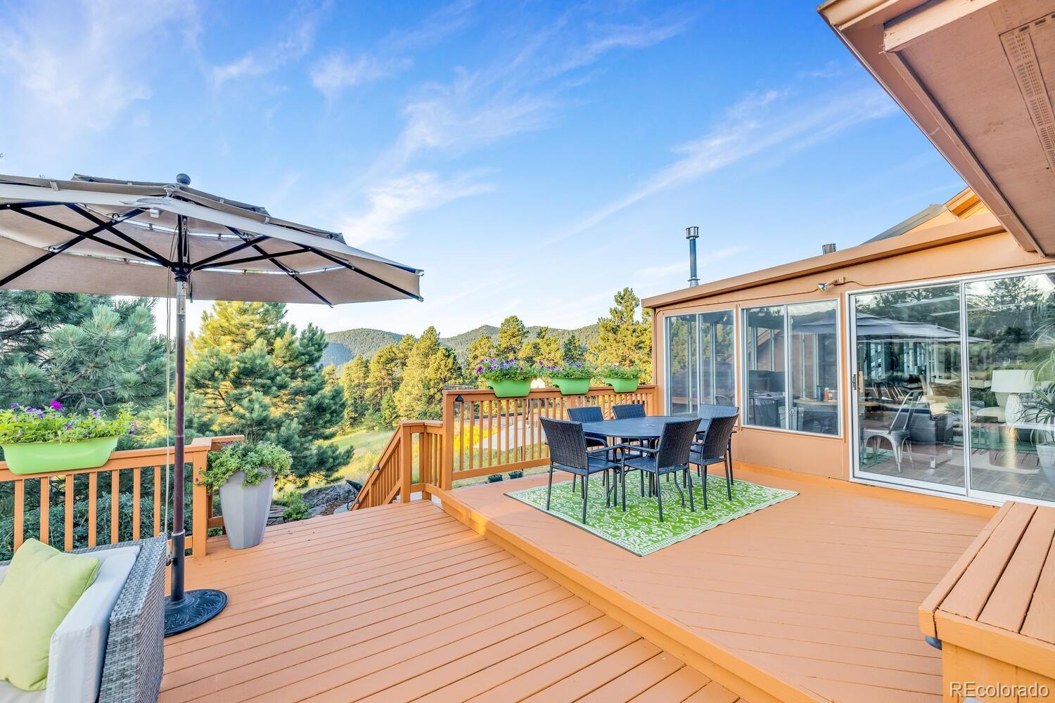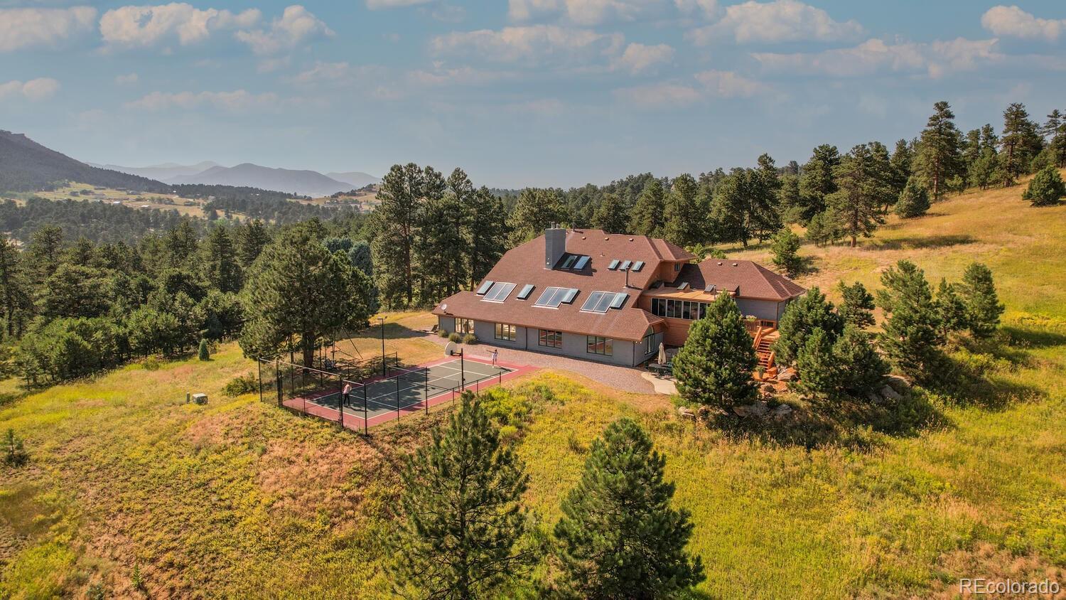 Imagine living in a home with resort amenities on 17 plus private acres, in a gated enclave of 3 homes, within 1 mile of world class hiking, mountain biking and horseback riding trails on Mount Falcon or Pence Park. Enjoy tennis, pickle ball, basketball and shuffleboard in your back yard. Your own private pool, hot tub and kiddie pool will also provide hours of entertainment. The views and privacy will be savored while you relax on the one of the three outdoor decks, one featuring a multi-level cascading water feature while watching wildlife pass through your property. The home has beautiful updates including two water systems (well and public), a newer roof, air conditioning, wood and gas fireplaces, new flooring, remodeled bathrooms, new stainless steel appliances and a newly painted exterior. Great location only 10 minutes from Evergreen and 10 minutes from Hwy. 285 and access to Denver. The home and land have 2 PIN numbers 455491 and 455492. No HOA or covenants, with frequent wildlife guests such as deer, elk, and turkeys. Adjacent to Mount Falcon Park which provides miles of hiking, biking, and horseback riding trails. Other local attractions include Red Rocks Amphitheater, Tiny Town, and endless parks and wildlife areas.
