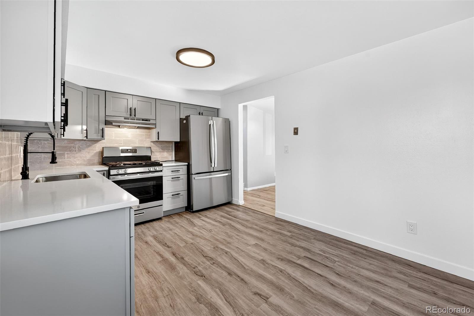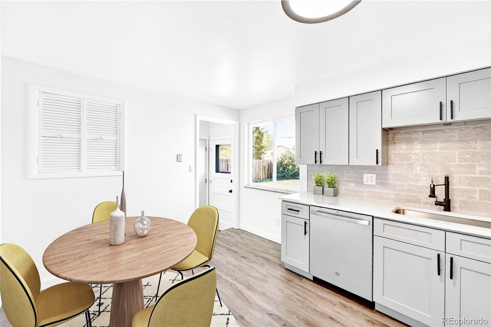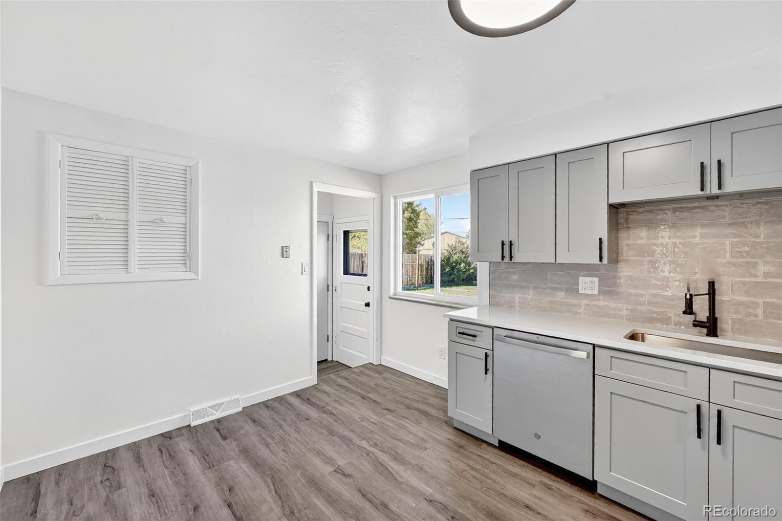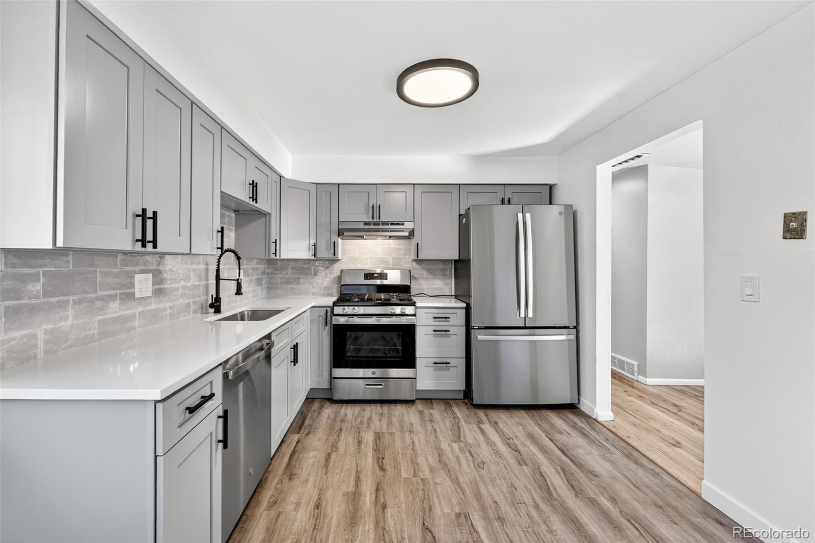 This thoughtfully updated Arvada home offers a winning combination of modern upgrades, flexible living space, and an expansive quarter-acre lot. The oversized backyard, one of the largest in the area, opens the door to endless possibilities, including potential for a future ADU, making this an appealing option for both homeowners and investors alike. Inside, the bright living area welcomes you in and flows effortlessly into the fully renovated kitchen, featuring new cabinetry, countertops, sink, stainless steel appliances, and a contemporary backsplash. Two bedrooms and a beautifully remodeled full bathroom are located on the main level, complemented by refinished hardwood floors and new LVT that add both warmth and durability. The finished basement provides additional living space with a generous family room, two non-conforming bedrooms, a 3/4 bathroom, and a convenient laundry area, ideal for guests, hobbies, or a home office setup. Fresh interior paint and new carpet throughout give the home a clean, move-in-ready feel. Outside, the sprawling backyard offers ample space for entertaining, gardening, or future expansion. RV and boat parking is easily accessible alongside the garage and through the gate, adding extra convenience for outdoor enthusiasts. Located close to parks, shopping, and local amenities, this home delivers comfort, versatility, and room to grow all in a desirable Arvada setting.