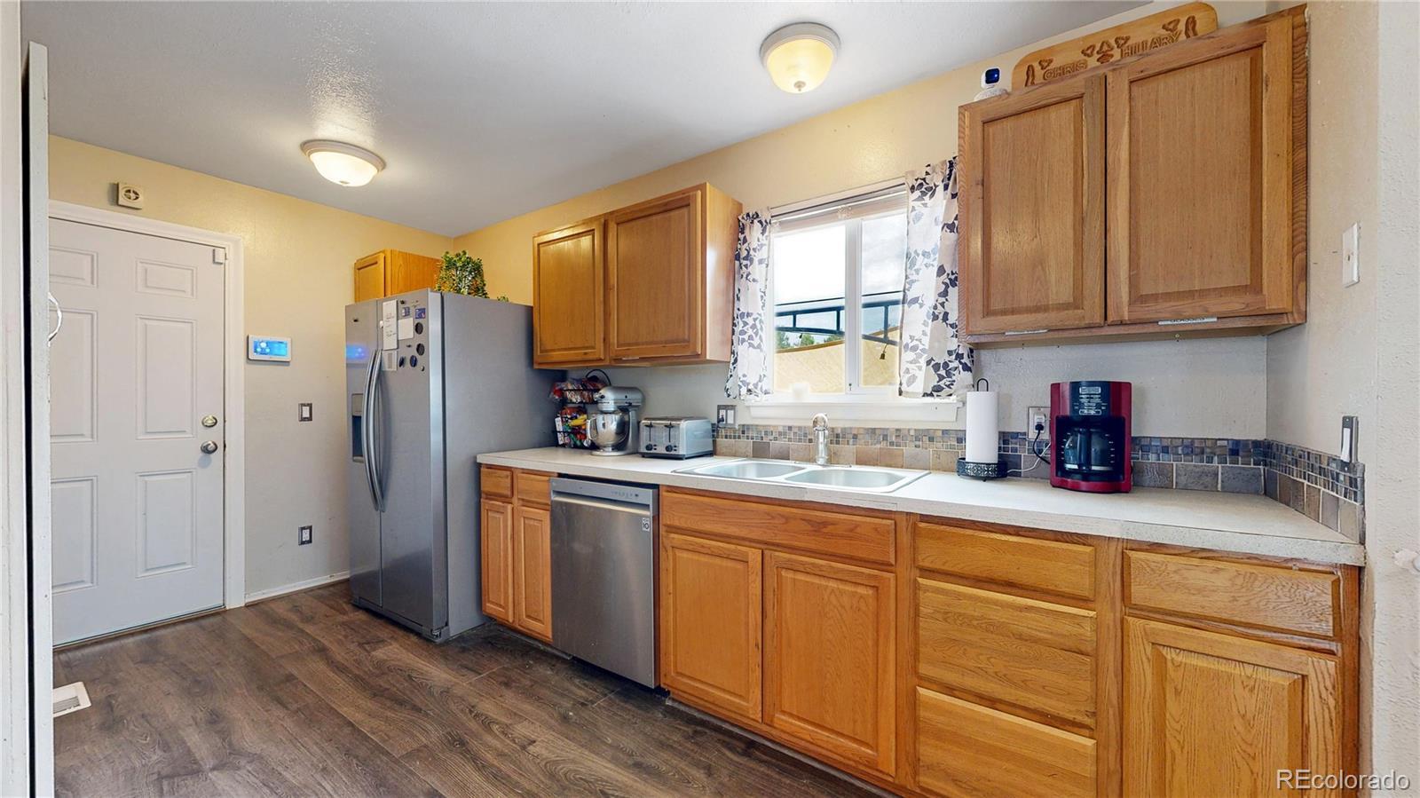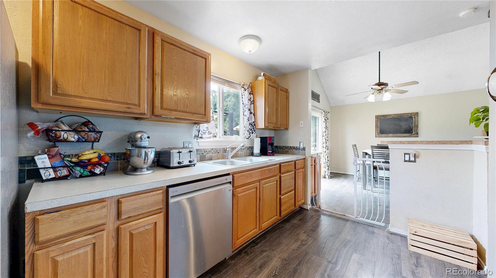 Welcome to 6327 S Johnson St, a charming and functional home located in the heart of Littleton with no HOA. The main level offers laminate vinyl plank floors, a cozy family room with a wood-burning fireplace, a full updated bathroom, and a convenient main floor bedroom ideal for guests or multi-generational living. The kitchen features stainless steel appliances, a pantry, and opens to a dedicated dining room with glass sliding doors that lead to the backyard. Outdoors, enjoy a spacious yard with a wood deck perfect for entertaining, along with a shed for extra storage. Upstairs, you'll find two comfortable bedrooms and a full updated bathroom. The finished basement provides valuable additional living space with a large rec room or flex area, a dry bar, a bathroom, and another bedroom—great for hosting or relaxing. Additional highlights include an attached 1-car garage, an RV pad, and included washer and dryer. With the flexibility to keep backyard livestock and enjoy nearby parks, schools, and shopping, this home offers the perfect blend of comfort and convenience.
