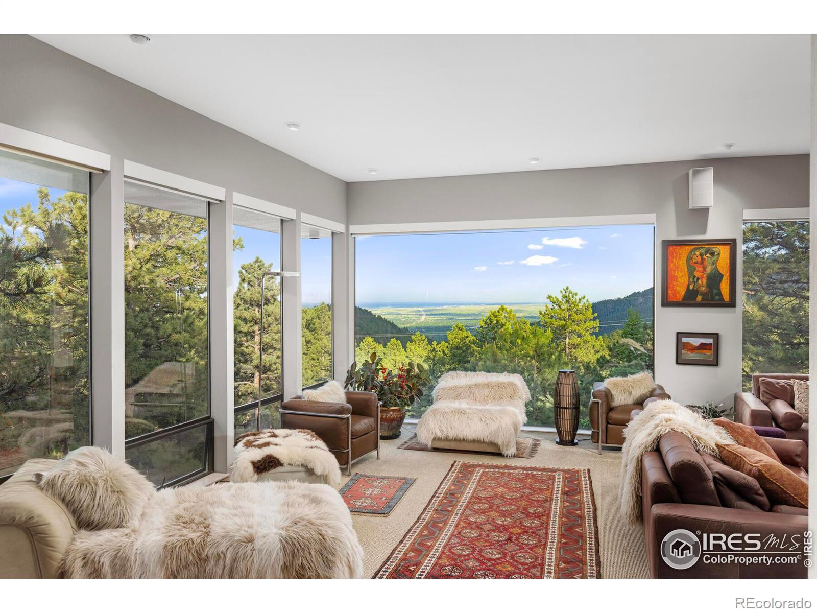 LOCATION! Situated at the bottom of Sunshine Canyon, just above Mapleton, this beautiful Mid-Century Modern has it all: Walk/run to downtown, main-level primary suite, 4 bedrooms, 40 very private acres, yet only 4-5 minute drive to downtown Boulder and the Pearl Street Mall area. The clean Bauhaus-style mid-century modern architecture is a Mid-Century aficionado's dream home. The form-follows-function simplicity of design, construction quality, and clean lines make this home a very rare find. Its location makes it even more exceptional. The floor-plan lives like a single-story ranch home with two bedrooms on the main level, with sunlight walk-out lower level with an additional 2 bedrooms and a full bath, for additional family members or guests. Wake-up to silence and inspiring views. One of the lower-level bedrooms is currently being used as an office. The window placement, and the placement of the home in general, takes into account the weather, the natural setting, and the extensive views to the Boulder-Denver corridor to Denver. The home is thoughtfully and carefully placed with its back into the forest, into the North West, with the large view windows facing South-East. The home is flooded with natural sunlight during the daytime. The solid construction structure is built to last many generations, smooth level 5 drywall throughout, minimalist window frames and commercial-grade construction and structural techniques used throughout. This home is a gem. Move-in ready. It is priced to allow you customize finishes to your own personal taste.
