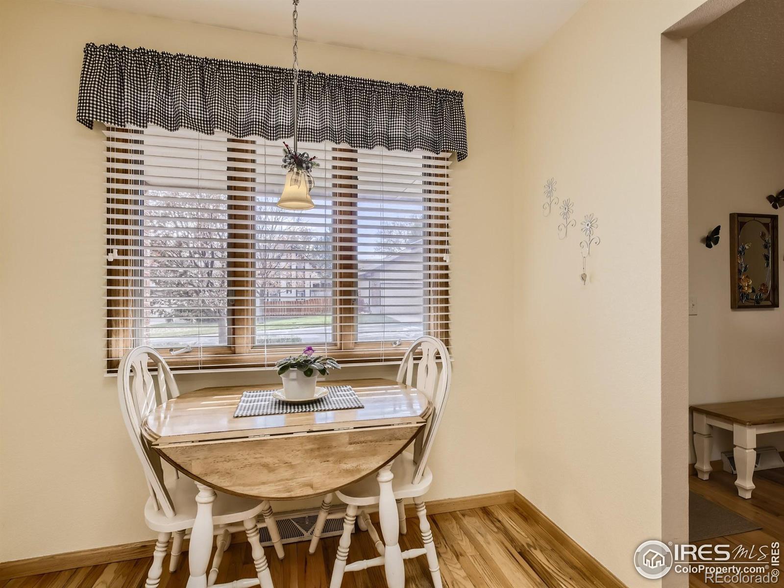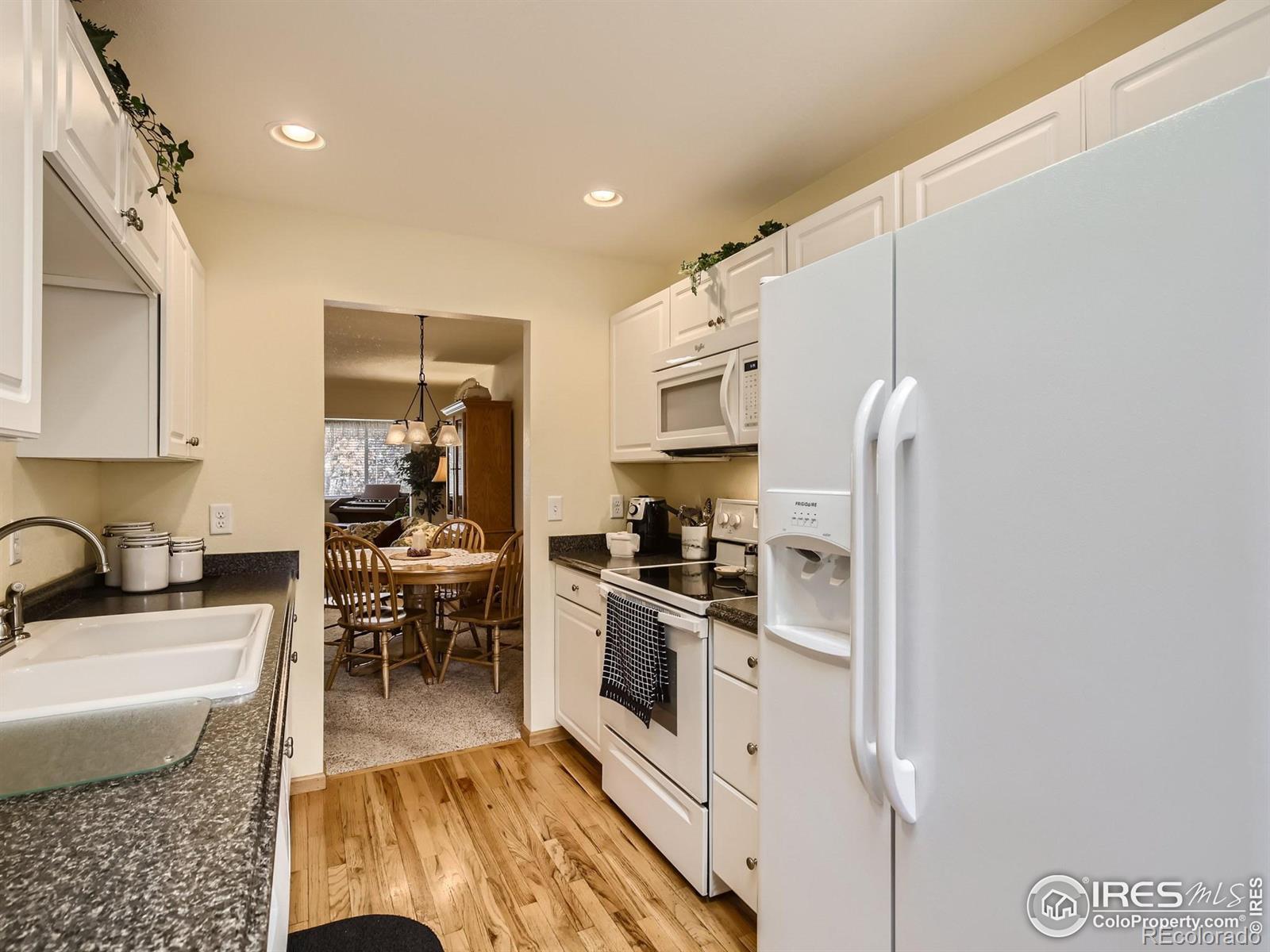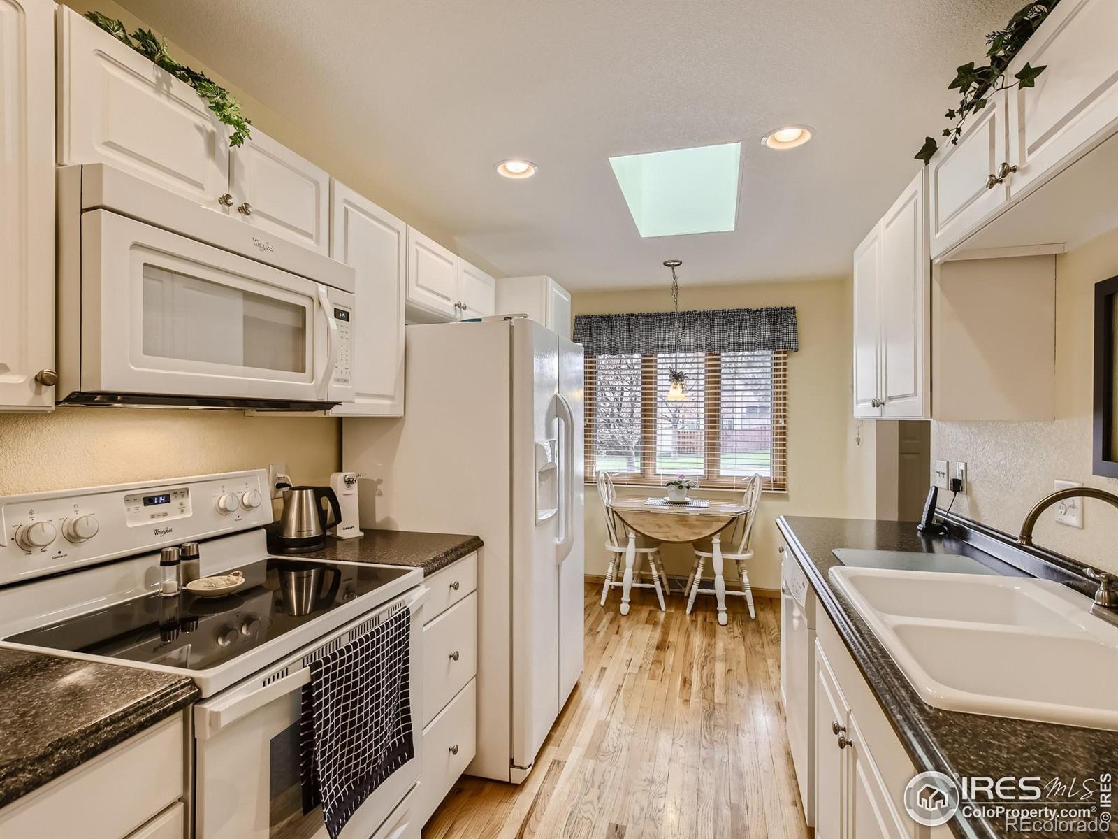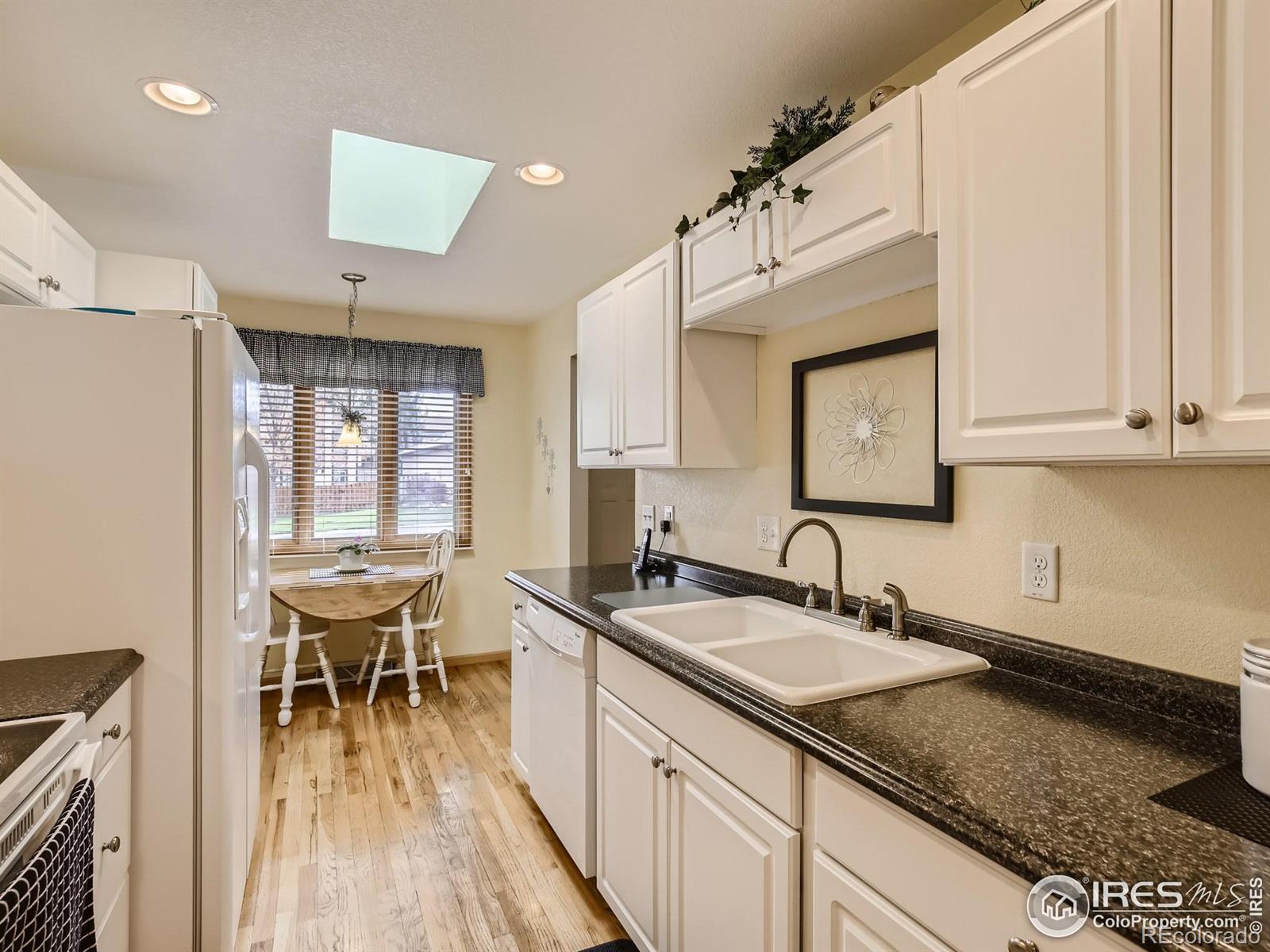 Back on the market -no fault of the property. Can't do FHA. This inviting 2-bedroom, 2-bath patio home in the serene Country Club Maples community offers the perfect balance of space, comfort, and modern updates. Upon entering, you'll notice the beautifully refinished wood floors in the entry and kitchen, which enhance the home's warmth. The bright living room flows seamlessly into the dining area, creating an ideal setting for gatherings. The well-equipped kitchen features white cabinetry, appliances, and a charming breakfast nook. The primary suite boasts dual closets and a private 3/4 bath with double sinks and updated fixtures. A second bedroom, a full bath, a cozy family room, and a convenient laundry closet add to the home's functionality. Upstairs bedrooms now feature new fan lights with remotes for added comfort. The partially finished basement offers flexible space for additional living or recreational use. A covered front porch and peaceful greenbelt views enhance outdoor living. New exterior light fixtures add to the home's curb appeal, while the attached 2-car garage features a brand-new overhead door for convenience and security. This meticulously maintained home also includes new exterior paint, a newer roof, and a skylight. Located near the Greeley Country Club, this home offers tranquility with easy access to leisure and recreation.