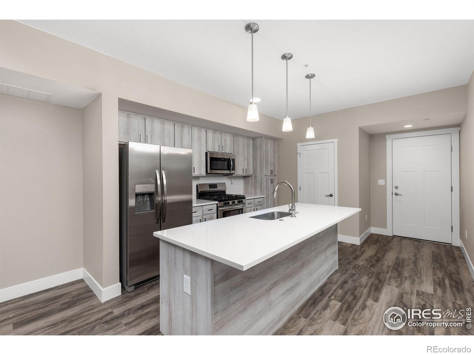 You don't want to miss this unit in desirable Cherrywood Condos. This brand new spacious 2-bedroom condo that boasts open concept living and dining areas. The kitchen has state of the art stainless steel appliances and sizable quartz countertop island for cooking and entertaining. Oversized windows and large patio The unit also includes high grade laminate floors, stackable washer. Taxes and HOA dues are estimated. photos of a similar unit