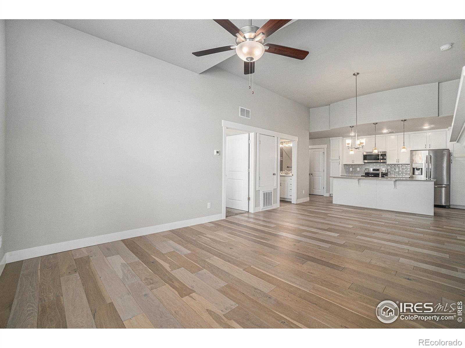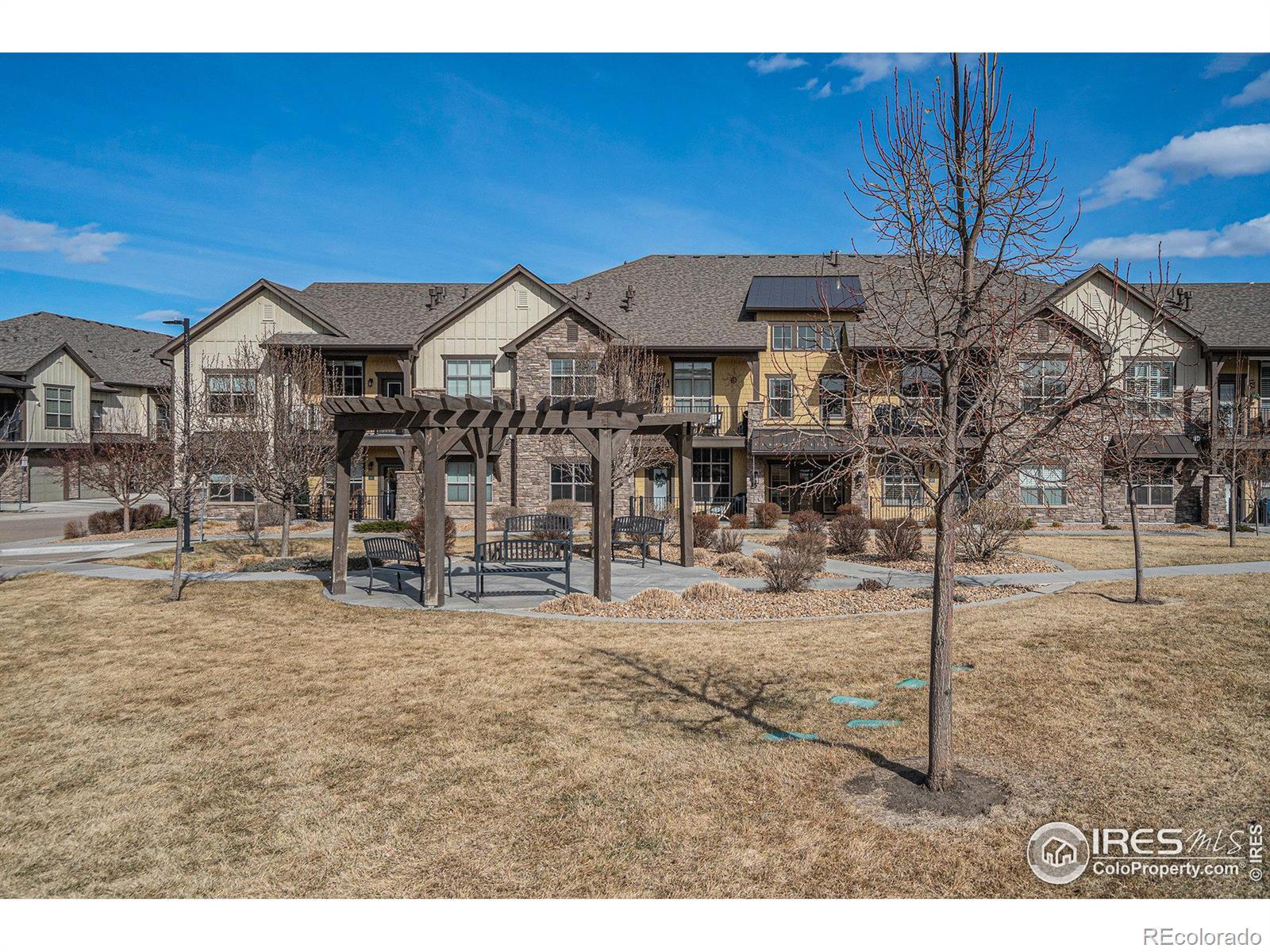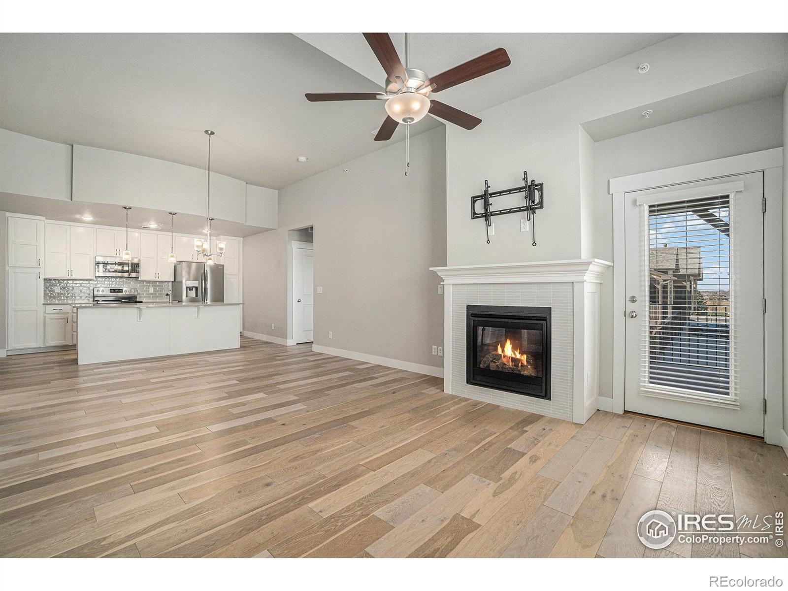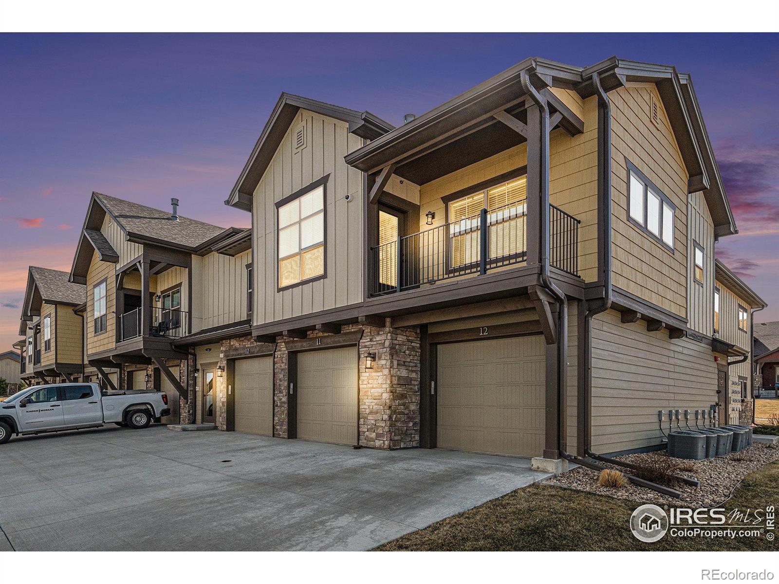 Welcome to this beautiful 2-bedroom, 2-bathroom condo located in the desirable Portofino Flats at La Riva, within Highland Meadows and built by Landmark Homes. The rustic craftsman-style exterior offers great curb appeal, while the secured entry and elevator-served access provide both comfort and convenience.Inside, you'll find premium finishes throughout, including an open-concept kitchen with white cabinetry, quartz countertops, engineered hardwood and tile flooring, stainless steel appliances, a cozy fireplace, and solid core doors. This home also features an oversized attached garage, a high-efficiency furnace, and a tankless water heater.Enjoy an active Colorado lifestyle in this amenity-rich golf course community featuring tennis courts, a swimming pool, and a new clubhouse, plus a resort-style hot tub, BBQ area, and firepit.