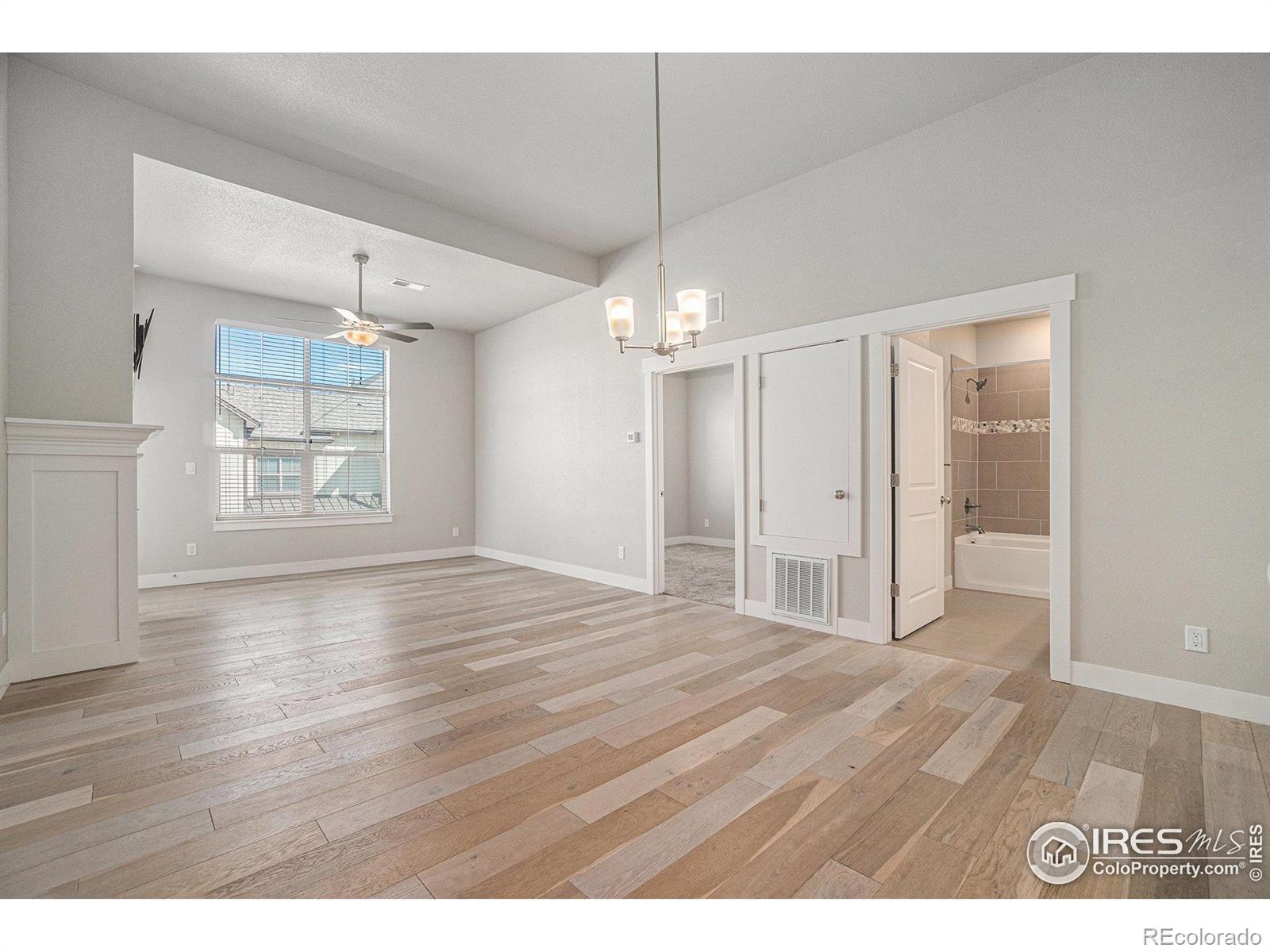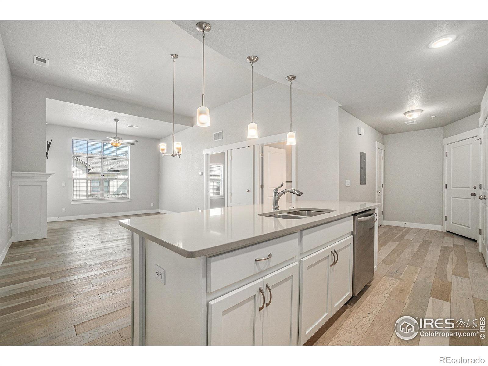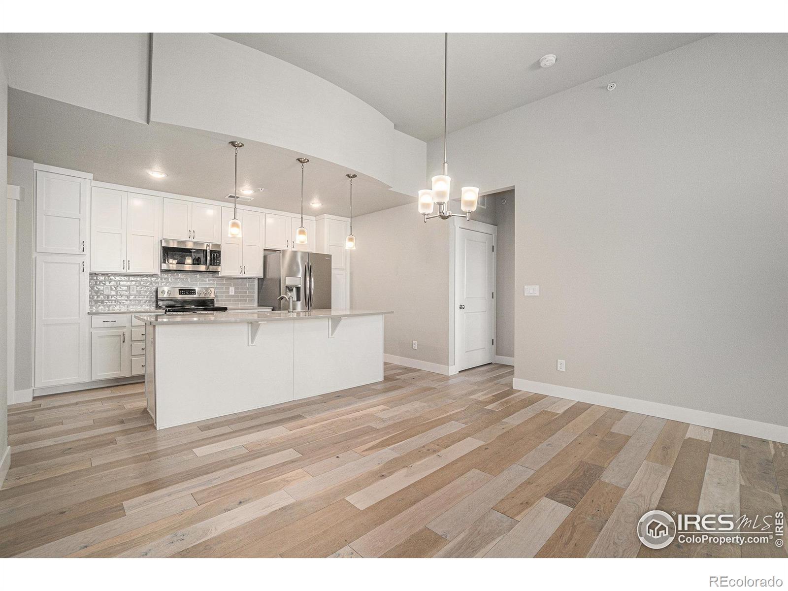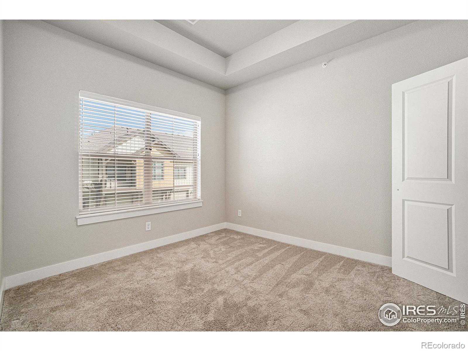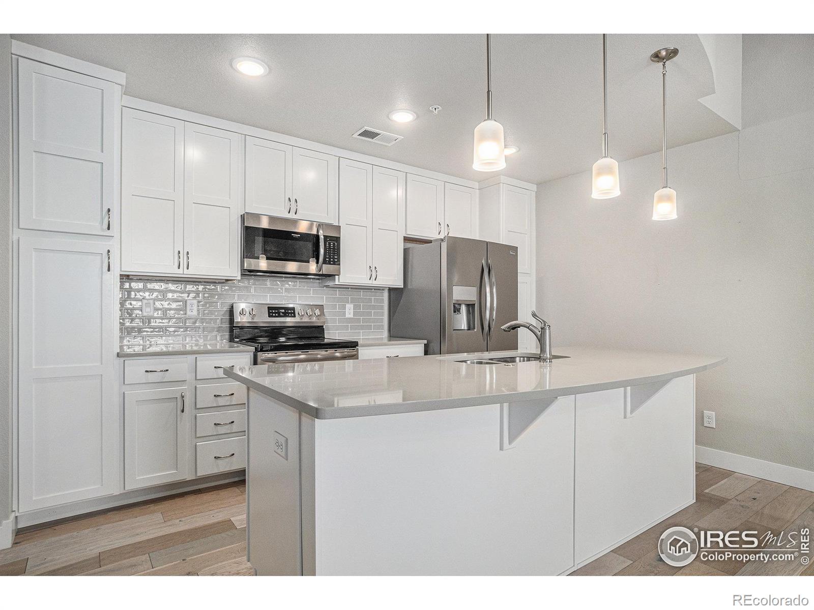 Welcome to this beautiful 2-bedroom, 2-bathroom condo located in the desirable Portofino Flats at La Riva, within Highland Meadows and built by Landmark Homes. The rustic craftsman-style exterior offers great curb appeal, while the secured entry and elevator-served access provide both comfort and convenience.Inside, you'll find premium finishes throughout, including an open-concept kitchen with white cabinetry, quartz countertops, engineered hardwood and tile flooring, stainless steel appliances, a cozy fireplace, and solid core doors. This home also features an oversized attached garage, a high-efficiency furnace, and a tankless water heater.Enjoy an active Colorado lifestyle in this amenity-rich golf course community featuring tennis courts, a swimming pool, and a new clubhouse, plus a resort-style hot tub, BBQ area, and firepit.