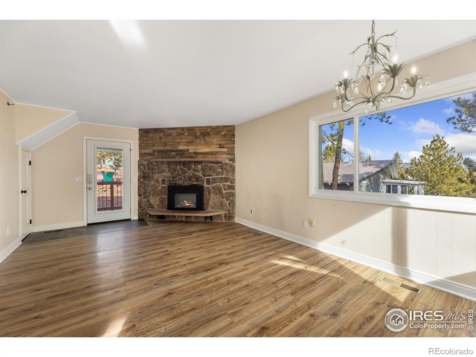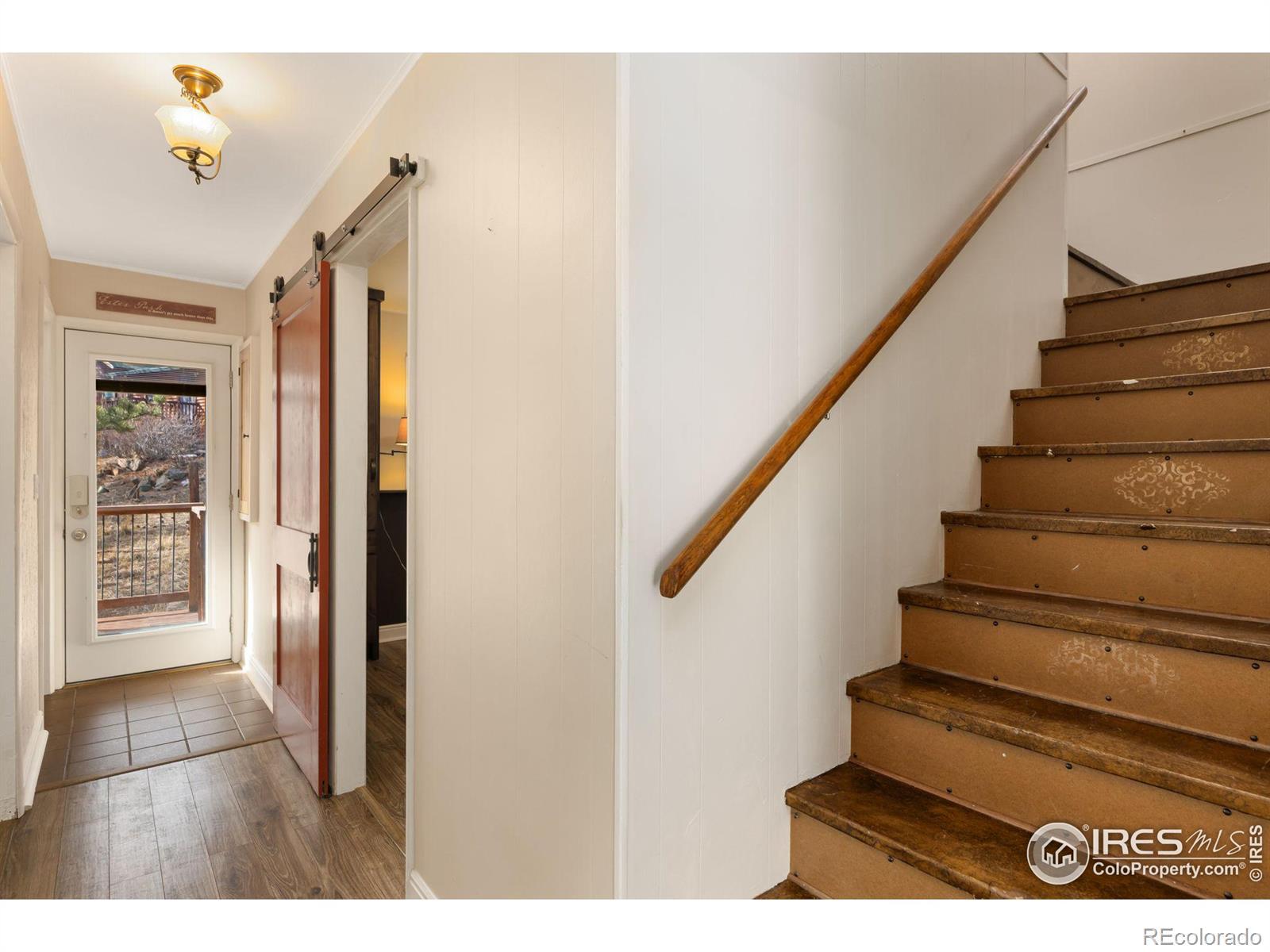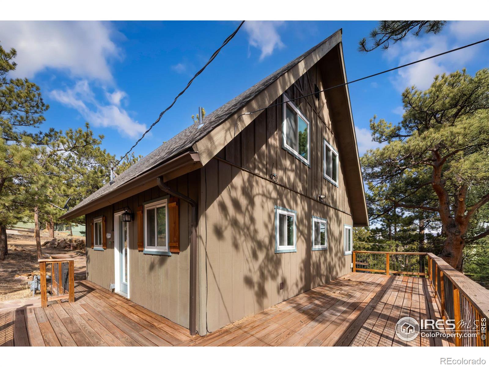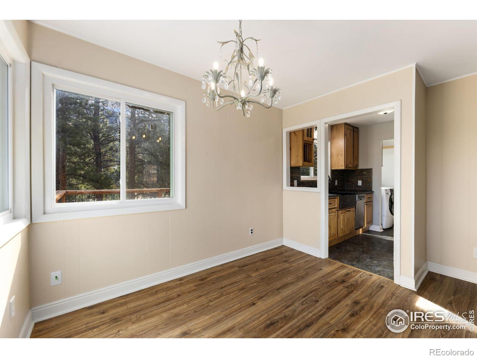 Discover this inviting 3-bedroom, 1.5-bathroom mountain cabin located on a peaceful cul-de-sac in Carriage Hills. Perfect as a full-time residence or mountain getaway, this home sits on a .4-acre wooded lot and offers the tranquil sound of Fish Creek from the spacious back deck. Inside, enjoy comfortable living space, updated in 2022, featuring an electric fireplace, updated flooring, and a warm blend of rustic charm and modern design. The light-filled living area creates a relaxing ambiance, ideal for quiet evenings. The well-appointed kitchen features custom cabinetry, black soapstone countertops, and stainless steel appliances, with direct access to an adjacent laundry area. Upstairs, two additional bedrooms offer flexible space for guests, an office, or creative studio use. Outdoor lovers will appreciate the home's proximity to trails leading to Lake Estes and its short drive to Rocky Mountain National Park. Enjoy easy access to shopping, dining, and year-round recreational opportunities. Additional features include plenty of off-street parking, a spacious deck, and a wooded setting that provides a sense of privacy and natural beauty. Don't miss the opportunity to make this charming Estes Park cabin your next home.