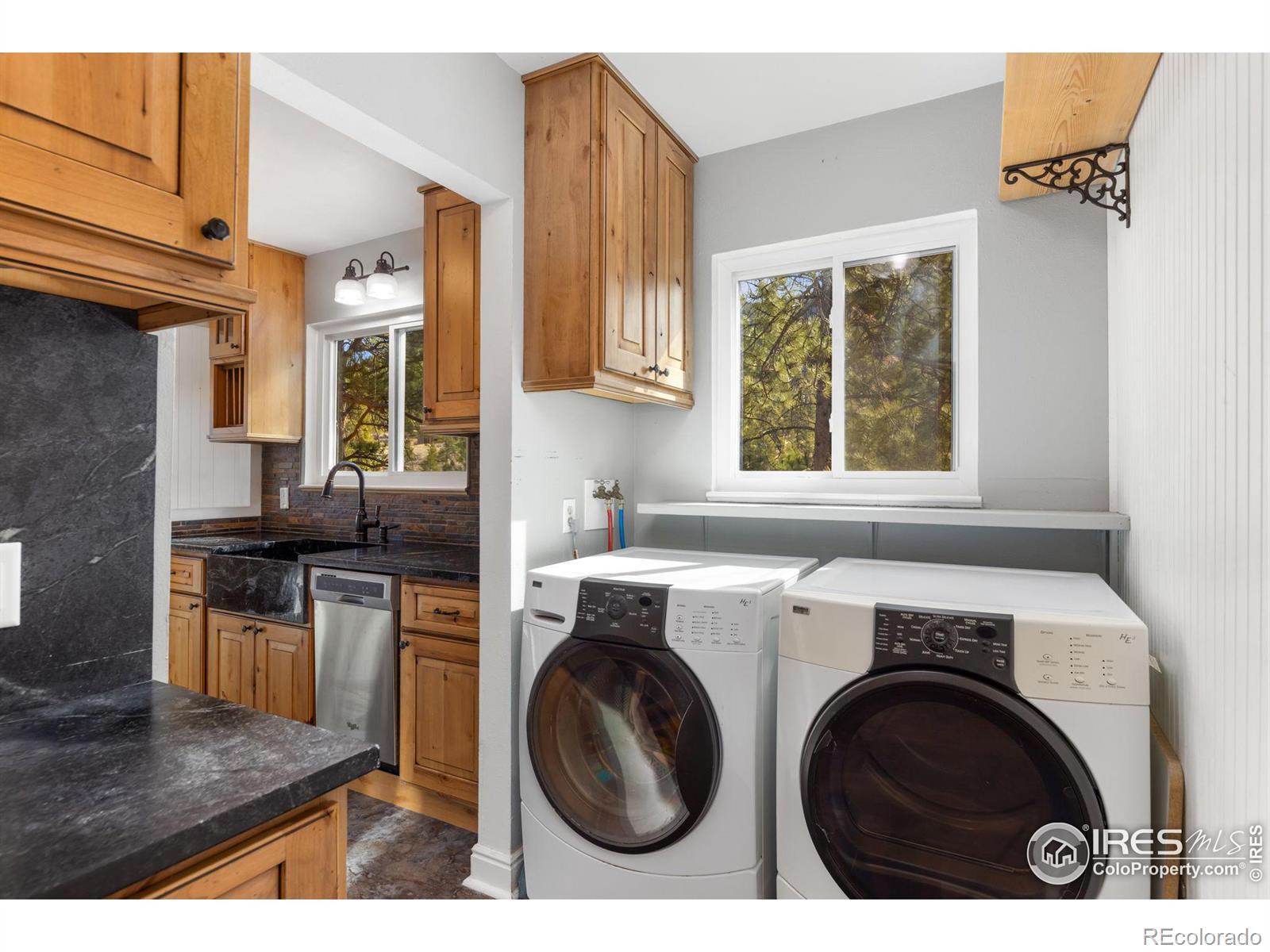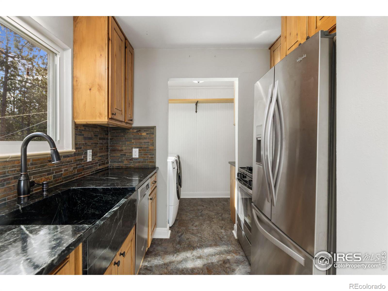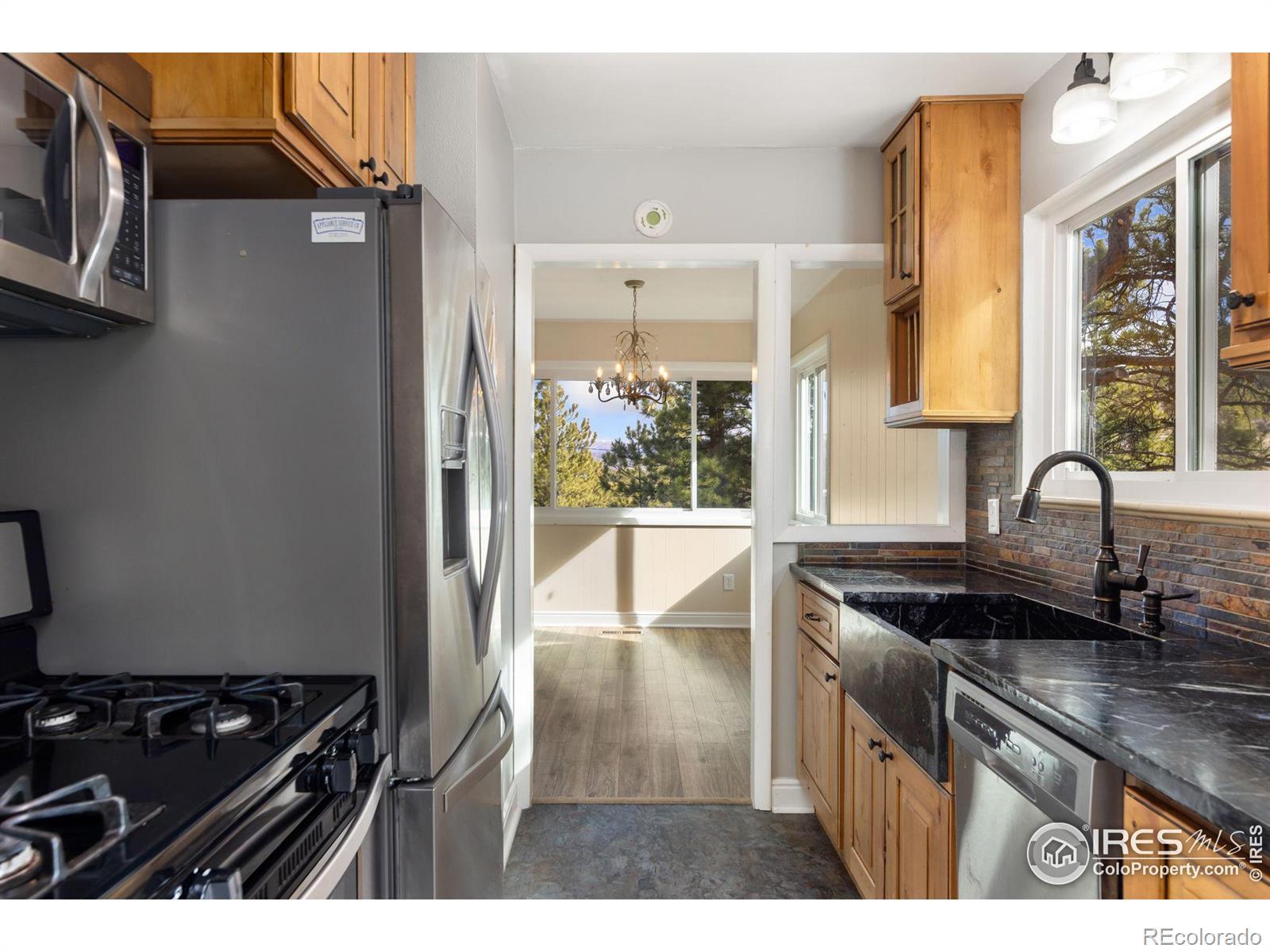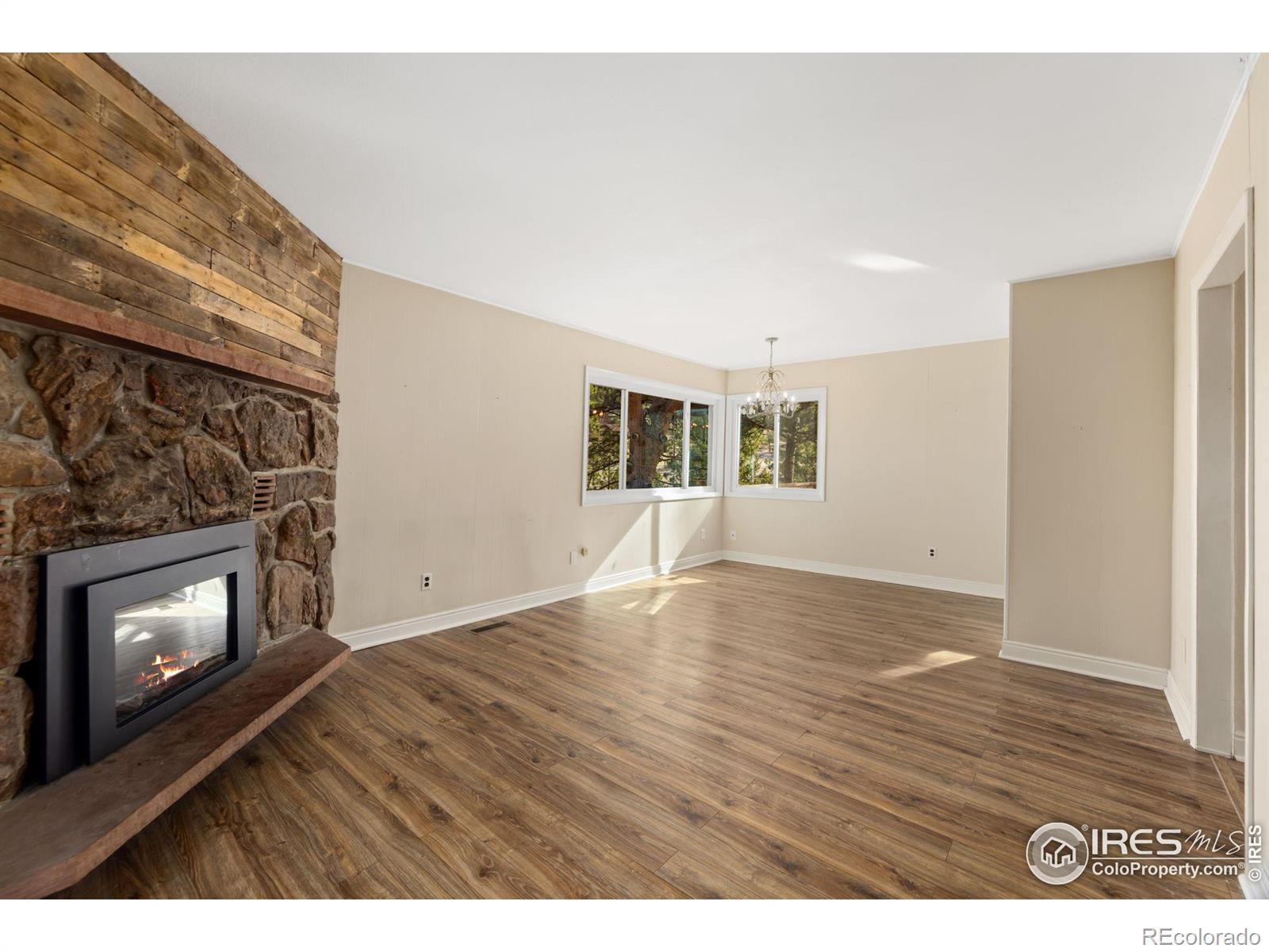 Discover this inviting 3-bedroom, 1.5-bathroom mountain cabin located on a peaceful cul-de-sac in Carriage Hills. Perfect as a full-time residence or mountain getaway, this home sits on a .4-acre wooded lot and offers the tranquil sound of Fish Creek from the spacious back deck. Inside, enjoy comfortable living space, updated in 2022, featuring an electric fireplace, updated flooring, and a warm blend of rustic charm and modern design. The light-filled living area creates a relaxing ambiance, ideal for quiet evenings. The well-appointed kitchen features custom cabinetry, black soapstone countertops, and stainless steel appliances, with direct access to an adjacent laundry area. Upstairs, two additional bedrooms offer flexible space for guests, an office, or creative studio use. Outdoor lovers will appreciate the home's proximity to trails leading to Lake Estes and its short drive to Rocky Mountain National Park. Enjoy easy access to shopping, dining, and year-round recreational opportunities. Additional features include plenty of off-street parking, a spacious deck, and a wooded setting that provides a sense of privacy and natural beauty. Don't miss the opportunity to make this charming Estes Park cabin your next home.