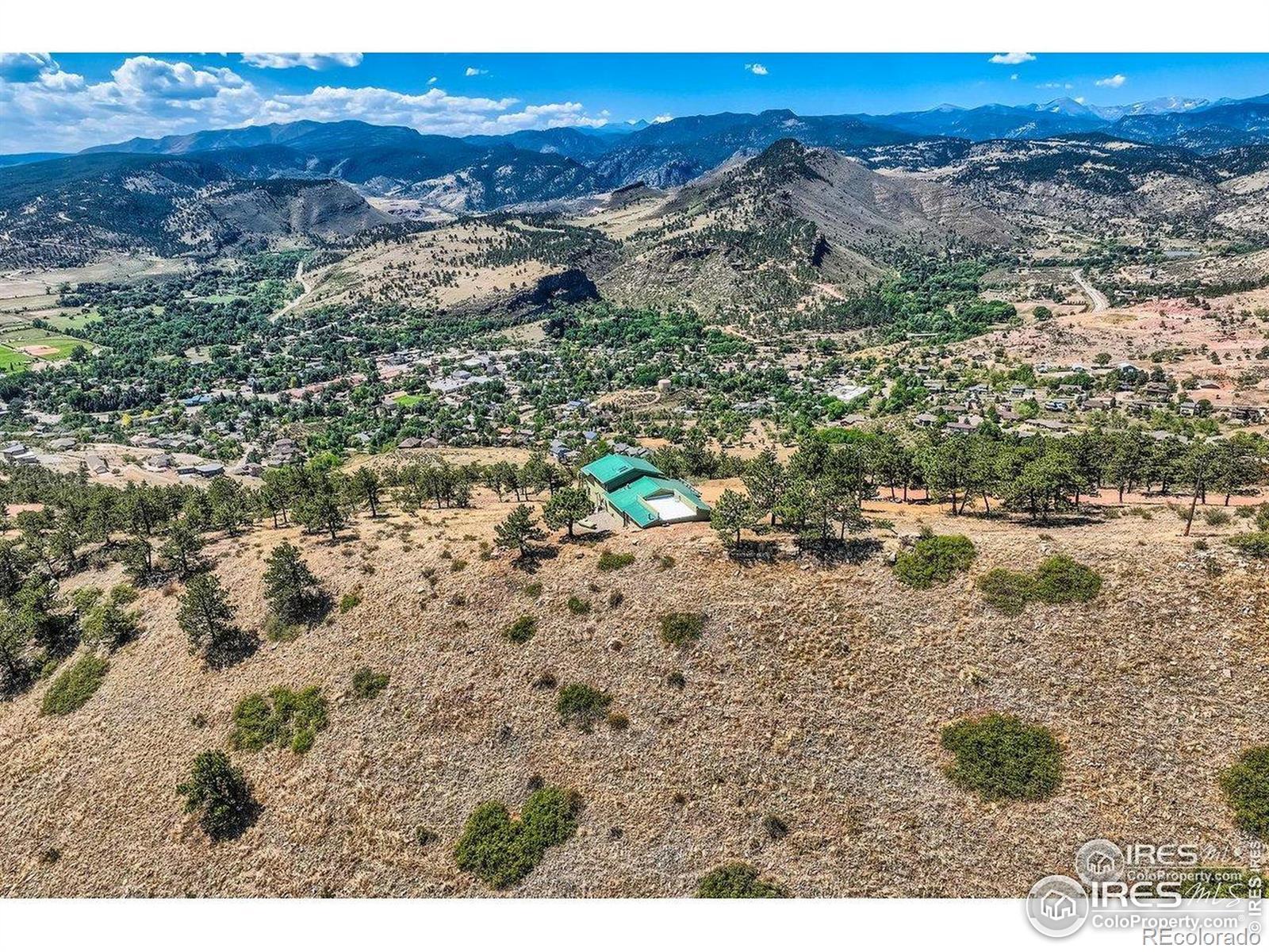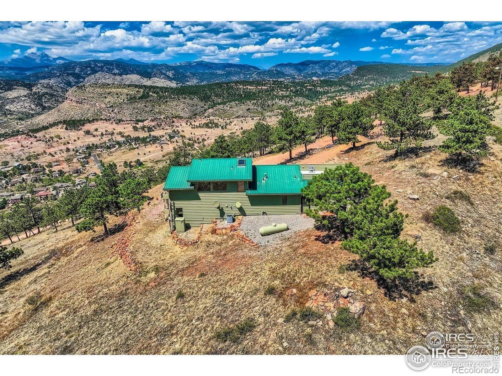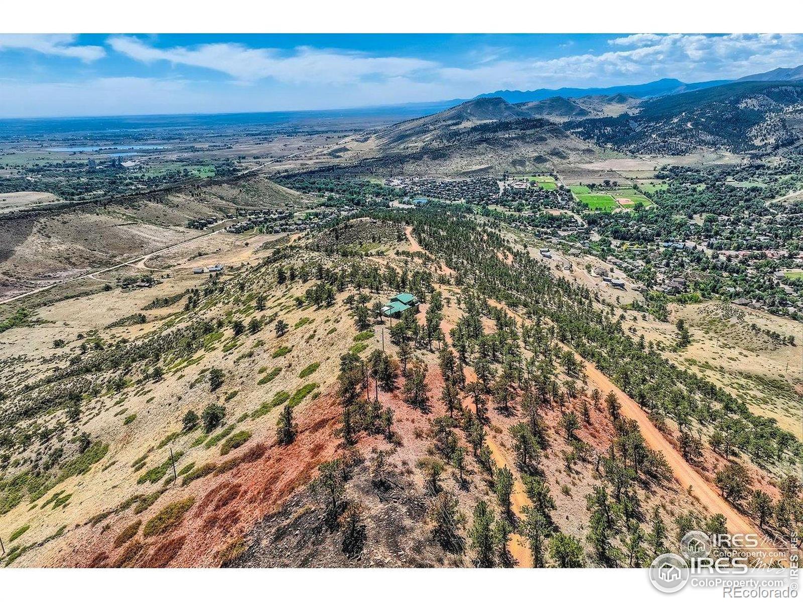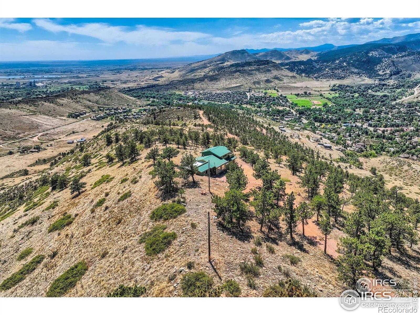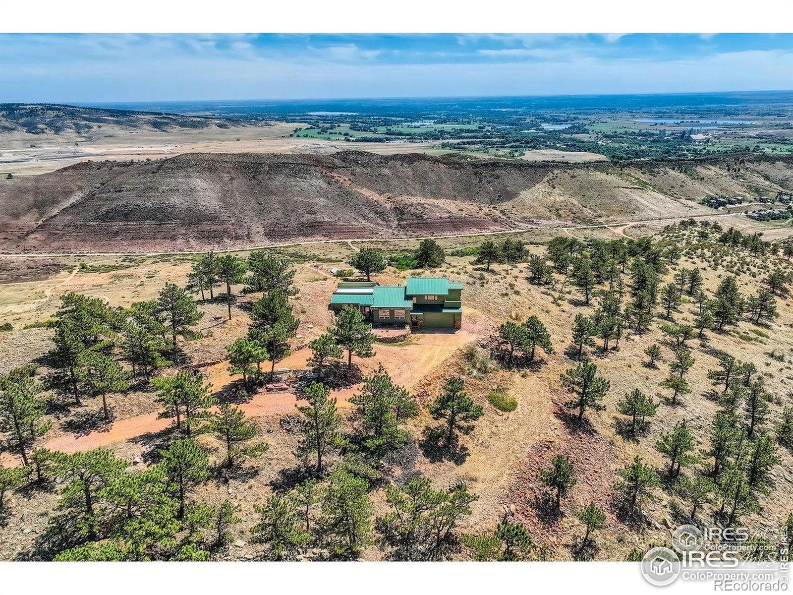 Unparalleled views and quiet privacy! This custom built home has stunning views from Loveland/Berthoud sweeping south across the plains, overlooking Lyons and all communities from Denver to Boulder, and then encompassing the foothills and the entire back range. The private road, stone pillar gate, and long driveway guarantee privacy on the +38.6 acre parcel. This well maintained property has been freshly painted inside & out. Great room concept, vaulted ceilings, and large windows. 2nd bedroom doubles as an alternative use room with gas fireplace, Retractable awning over front patio. Large finished garage with nice crawl space for additional storage. 5000 gallon water cistern for fire fighting. Class A fire rated coatings on both decks. Broadband tower array on property provides residual income