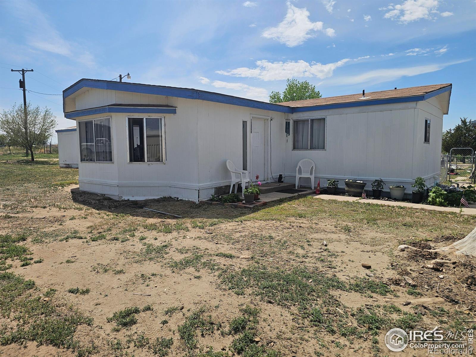 Mobile home built in 1974 on 1.5 acres. Site has 2 driveways including circular driveway in back. Nice sized shop with electric. Surrounded by mature trees, fenced backyard, sidewalk. New furnace Oct. 2024, water well electric upgraded this summer. Additional building can be remodeled into living space or rental. 3 miles from town. 2 miles from I-76. Nice home in the country with additional buildings and no HOA. There is a second double wide trailer on the property that can also be repaired and used.