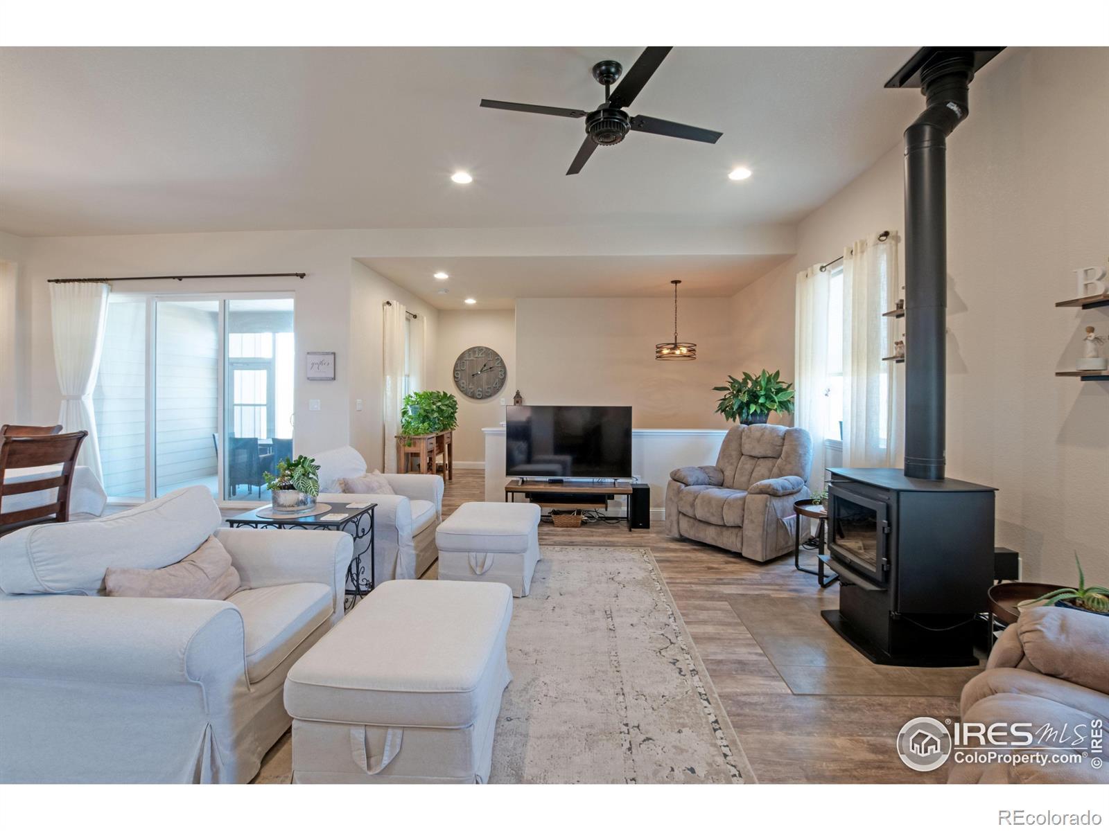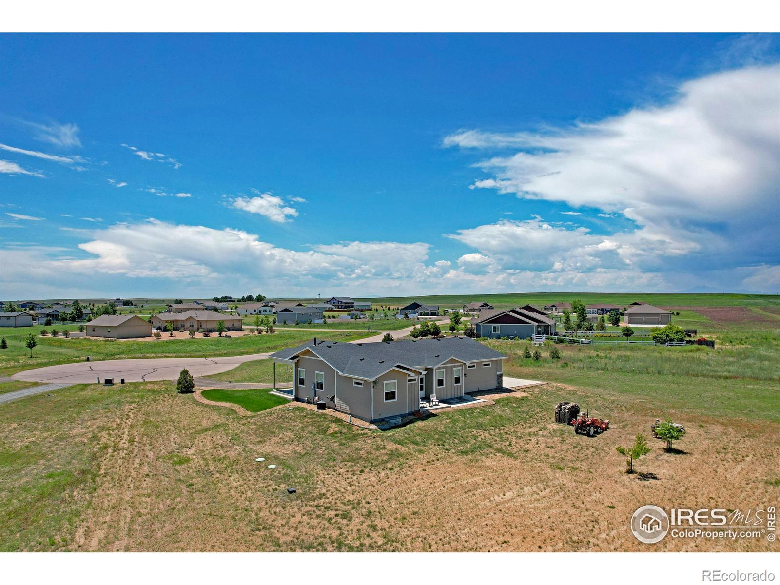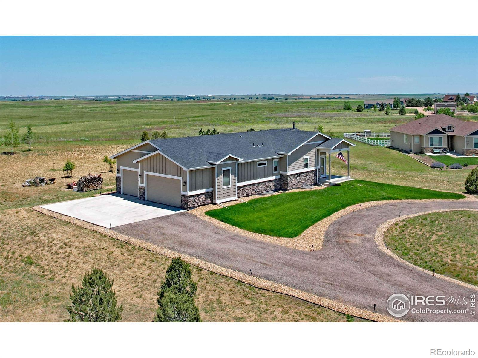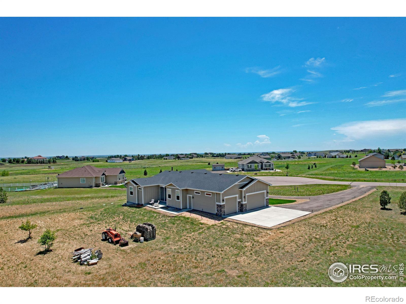 Incredible acreage property with a custom-built home and room for all your passions! Immaculate 4-bd, 4-bath home featuring spacious, open-concept living with high ceilings, 2 main floor masters w/ ensuites on opposite ends of the home, a fully finished basement w/ 2 generous sized bedrooms, bath, a great room, full office, dedicated exercise room with workout mat flooring, & wet bar. 10' ceilings on the main floor and 9' in basement. Oversized, well insulated 3-car garage, roof certified w/high impact shingles. Offering country living at its finest sitting on over 1 1/2 acres of land, a luxurious interior layout perfect for easy daily living and entertaining. Enjoy peaceful evenings in ultra private backyard and magnificent sunrises from the enclosed patio. Exceptional construction with auto-igniting energy saving wood-burning stove. The full water tap ensures low water bills, and superior insulation provides energy efficiency and low utility costs. The amenity-rich community includes sport courts, pool, fishing lake, camping areas, miles of scenic horse & hiking trails, cabanas, putting green, arena & round pen. This property is ready to accommodate your horses, vehicles, hobbies, and more! Approved for a 2,500 sq ft outbuilding, 1,100 sq ft barn, 720 sq ft garden shed, or even a pool! Don't miss this rare opportunity to own a property that offers privacy, flexibility, and a true peaceful countryside lifestyle under the starry skies! Potential to assume a VA loan 2.375 %. Weld County has approved Accessory Dwelling Units (ADU) also known as Casitas or Mother-in-law suites! Reach out to planning for details!