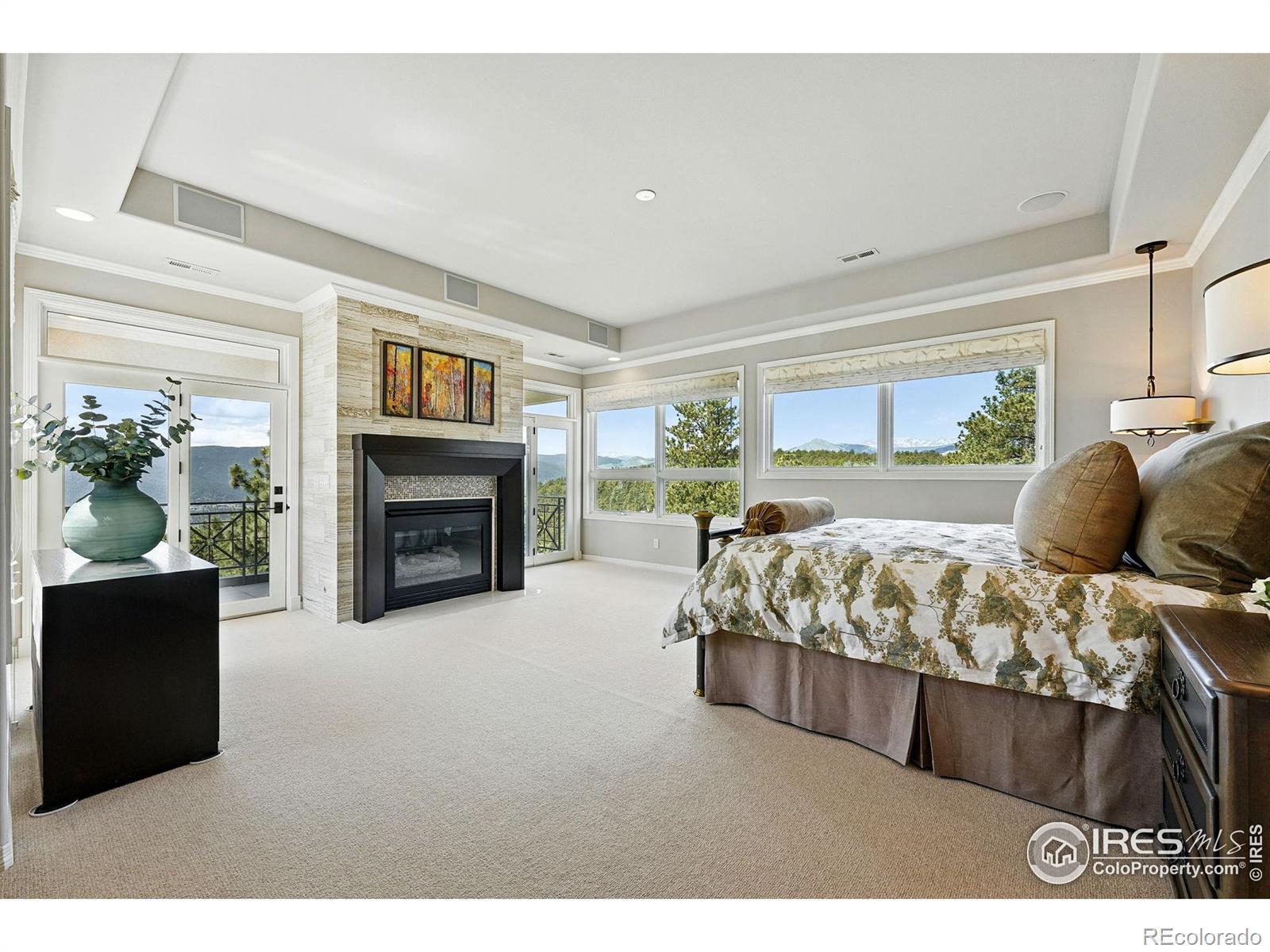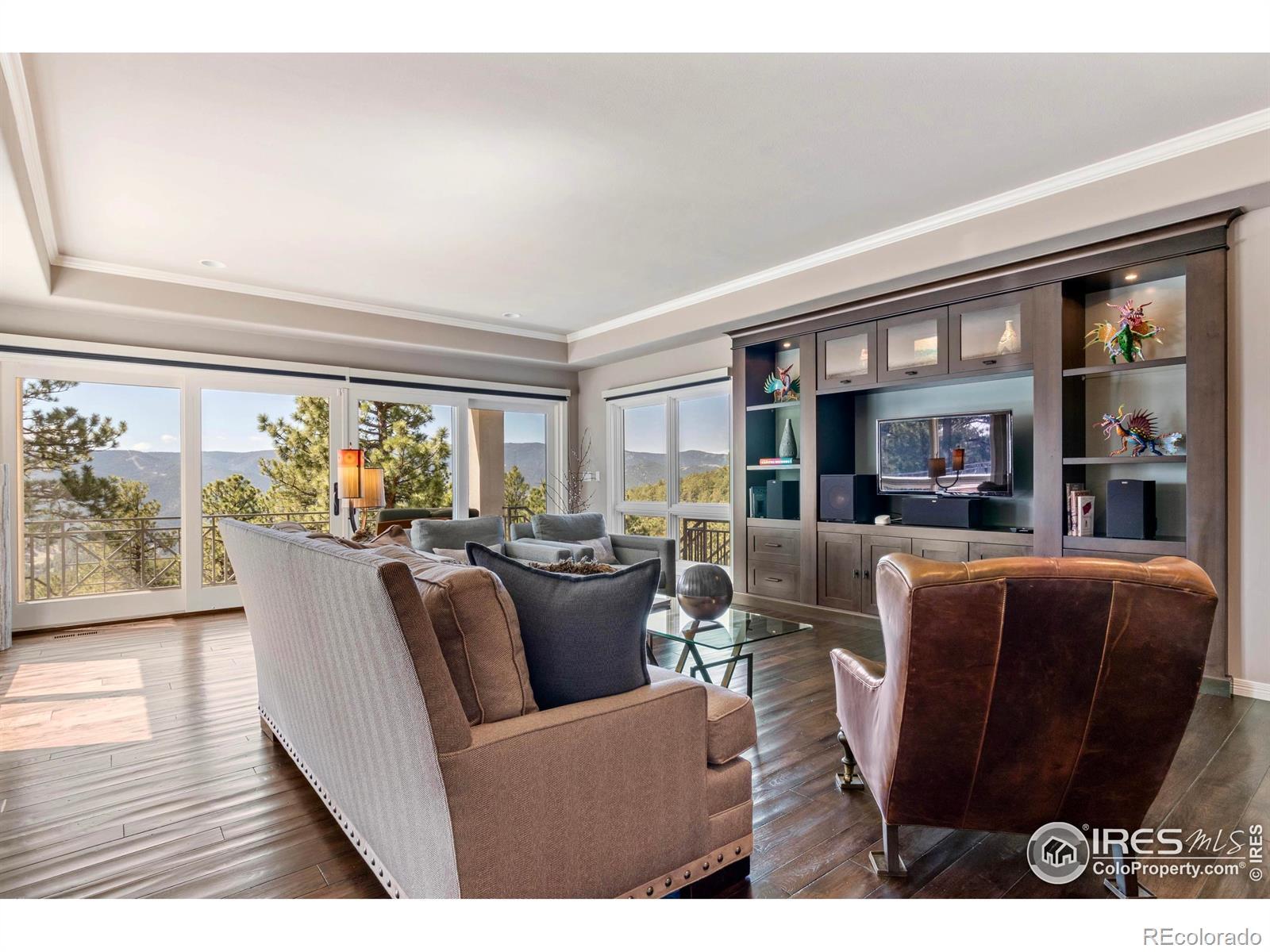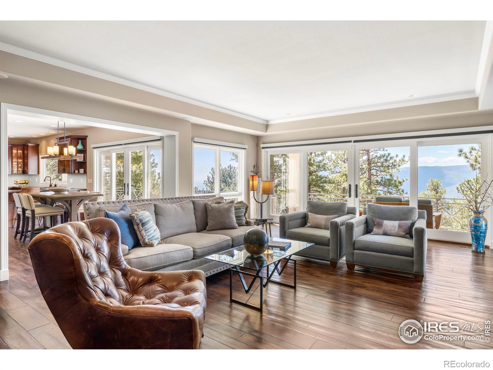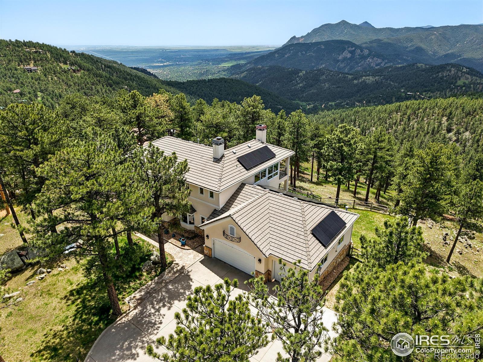 TOP OF THE WORLD! Elevate your lifestyle at this extraordinary 6-acre hilltop estate, where sweeping views of the Continental Divide, Boulder, and even the Denver skyline stretch before you. Privately perched with easy access at the pinnacle of prestigious Pine Brook Hills, this home is a sanctuary of seclusion, sophistication, and style. Step through custom double doors into soaring ceilings and sunlit spaces wrapped in rich hickory flooring. Every detail speaks of quality-from the custom millwork to the hand-selected finishes that define each elegant room. The heart of the home is a chef's dream: a designer kitchen outfitted with Wolf and Sub-Zero appliances, custom cabinetry, Cambria Inverness Frost Quartz and seamless indoor-outdoor flow for effortless entertaining. In the living room, a dramatic wall of windows frames breathtaking, front-row views of the Rockies. Upstairs, the luxurious primary suite is a world of its own, surrounded by sublime 270-degree views the video tour only begins to capture, and complete with a private terrace, wet bar, and spa-worthy 5-piece bath with radiant heated floors. The walkout lower level is an entertainer's paradise featuring a rec room, sunroom, wine cellar, and a second primary suite-ideal for guests. Two laundry rooms, a private office with its own terrace, wired speakers throughout, a 3-car oversized heated garage with built-in workshop and top-quality upgrades, including appliances and a 16.4kWh solar PV system with battery backup and transferable warranties, make this home as functional as it is stunning. Outside, breathtaking, easy-to-maintain grounds surround the property. A gas fire pit and multiple terraces create the perfect backdrop for unforgettable gatherings or peaceful solitude under the stars. All are just 15 minutes from downtown Boulder. As the video tour highlights, this is more than a home. It's a private hilltop retreat. A lifestyle. A legacy.