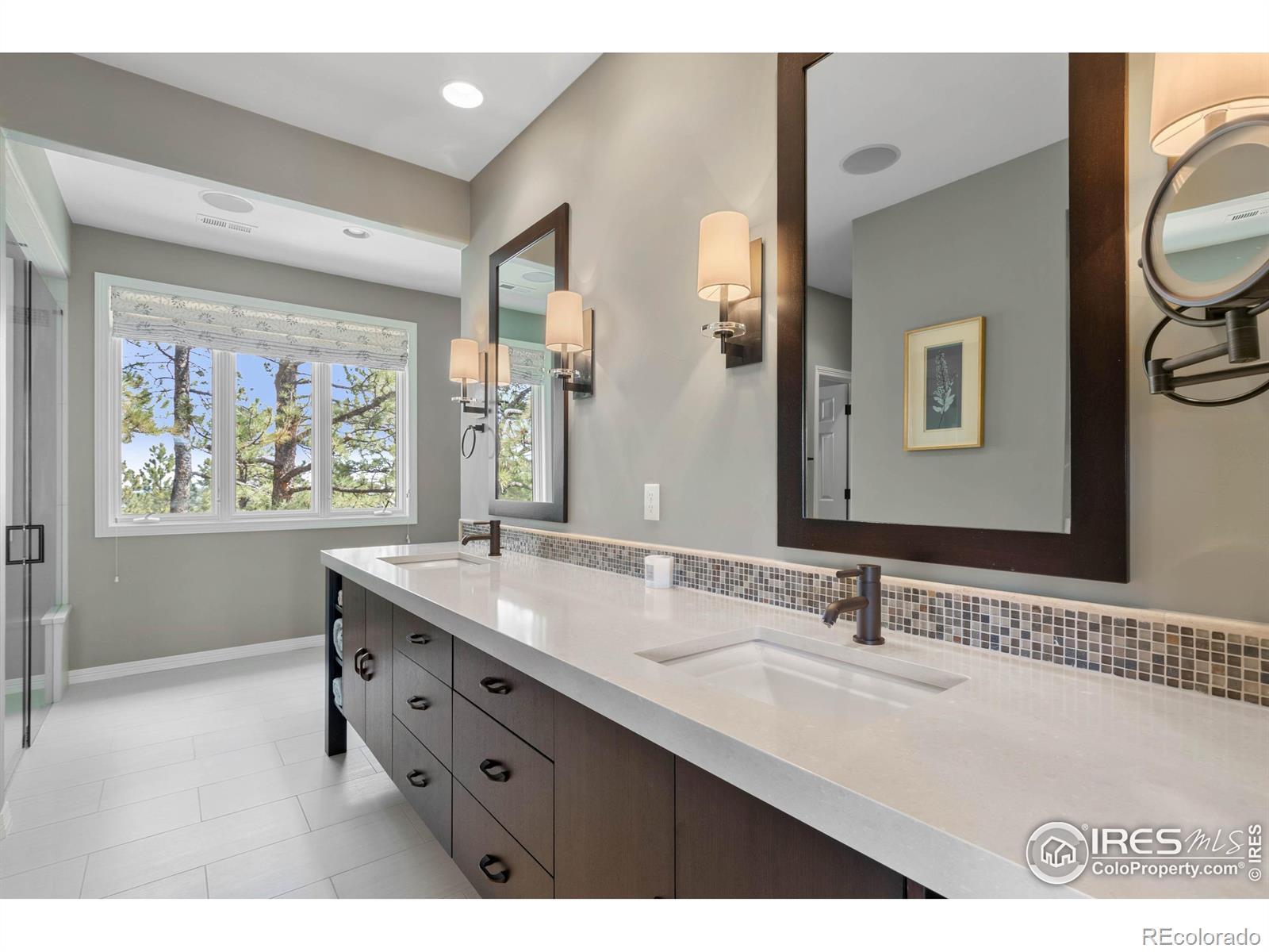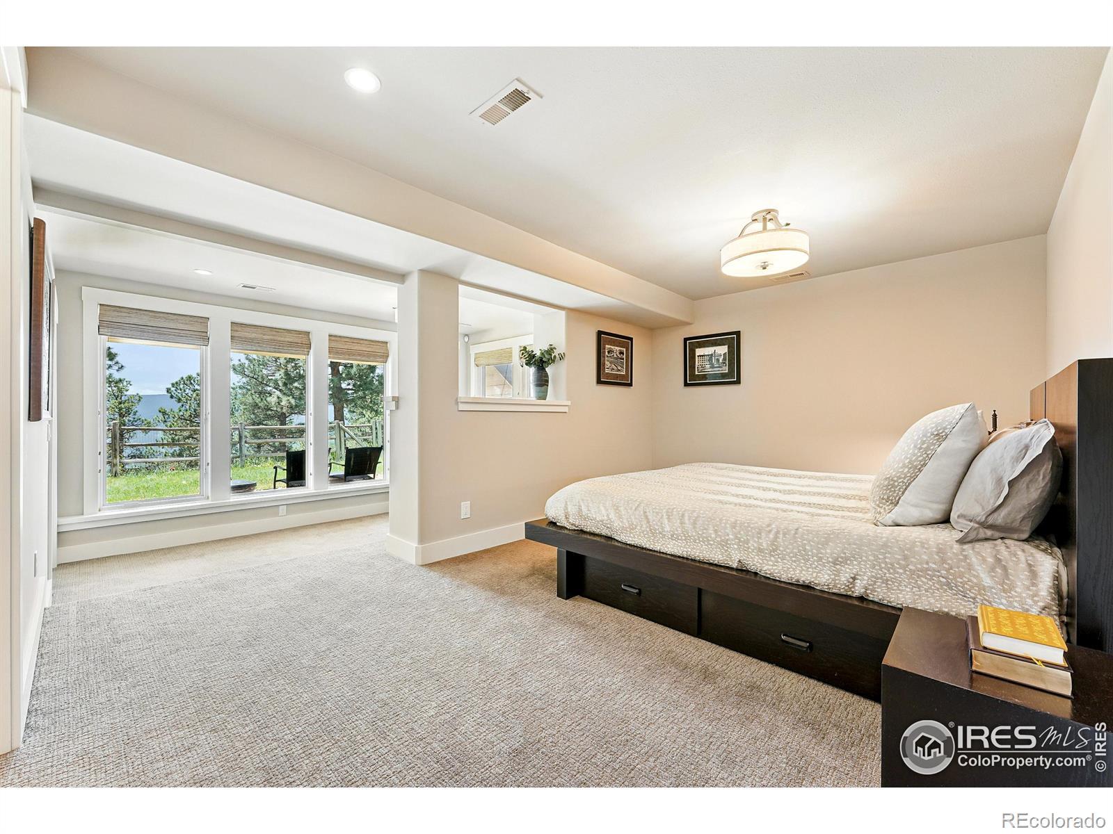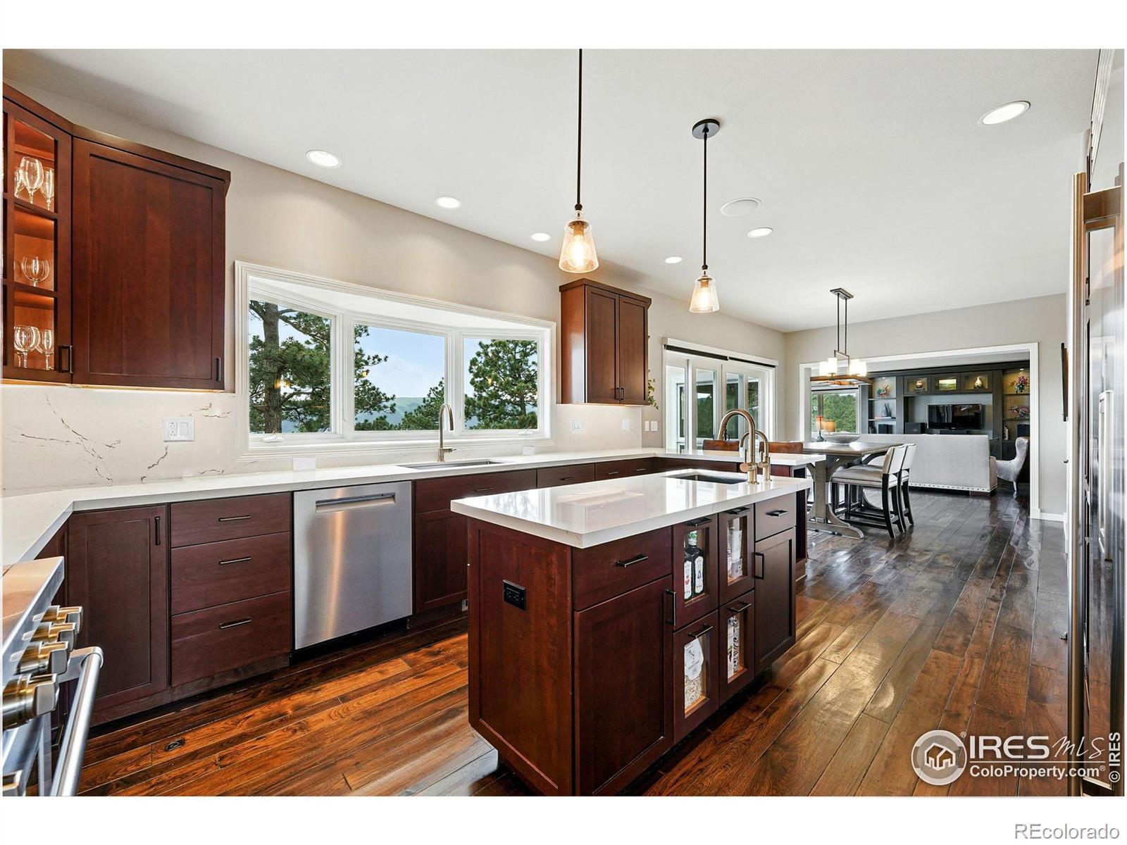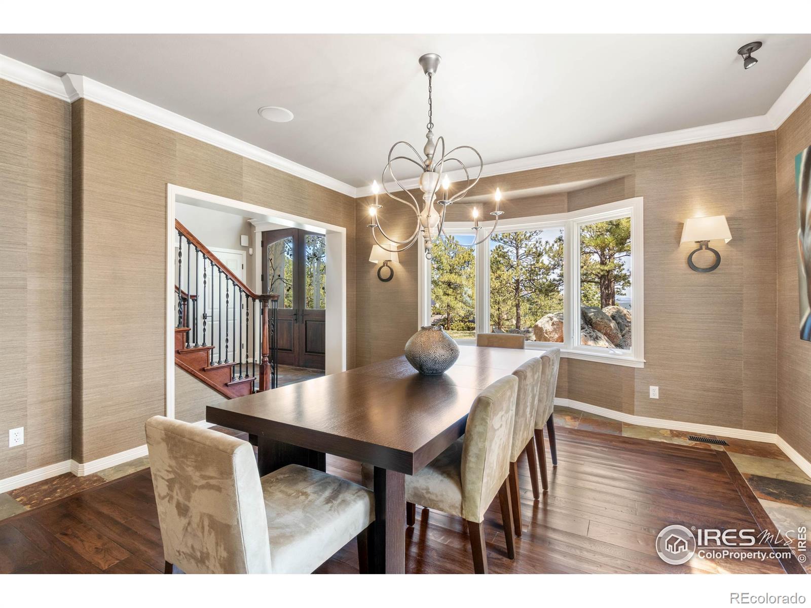 TOP OF THE WORLD! Elevate your lifestyle at this extraordinary 6-acre hilltop estate, where sweeping views of the Continental Divide, Boulder, and even the Denver skyline stretch before you. Privately perched with easy access at the pinnacle of prestigious Pine Brook Hills, this home is a sanctuary of seclusion, sophistication, and style. Step through custom double doors into soaring ceilings and sunlit spaces wrapped in rich hickory flooring. Every detail speaks of quality-from the custom millwork to the hand-selected finishes that define each elegant room. The heart of the home is a chef's dream: a designer kitchen outfitted with Wolf and Sub-Zero appliances, custom cabinetry, Cambria Inverness Frost Quartz and seamless indoor-outdoor flow for effortless entertaining. In the living room, a dramatic wall of windows frames breathtaking, front-row views of the Rockies. Upstairs, the luxurious primary suite is a world of its own, surrounded by sublime 270-degree views the video tour only begins to capture, and complete with a private terrace, wet bar, and spa-worthy 5-piece bath with radiant heated floors. The walkout lower level is an entertainer's paradise featuring a rec room, sunroom, wine cellar, and a second primary suite-ideal for guests. Two laundry rooms, a private office with its own terrace, wired speakers throughout, a 3-car oversized heated garage with built-in workshop and top-quality upgrades, including appliances and a 16.4kWh solar PV system with battery backup and transferable warranties, make this home as functional as it is stunning. Outside, breathtaking, easy-to-maintain grounds surround the property. A gas fire pit and multiple terraces create the perfect backdrop for unforgettable gatherings or peaceful solitude under the stars. All are just 15 minutes from downtown Boulder. As the video tour highlights, this is more than a home. It's a private hilltop retreat. A lifestyle. A legacy.
