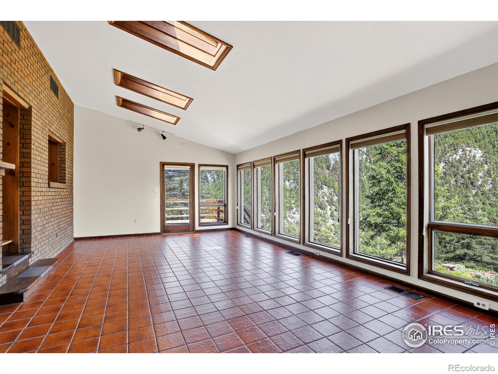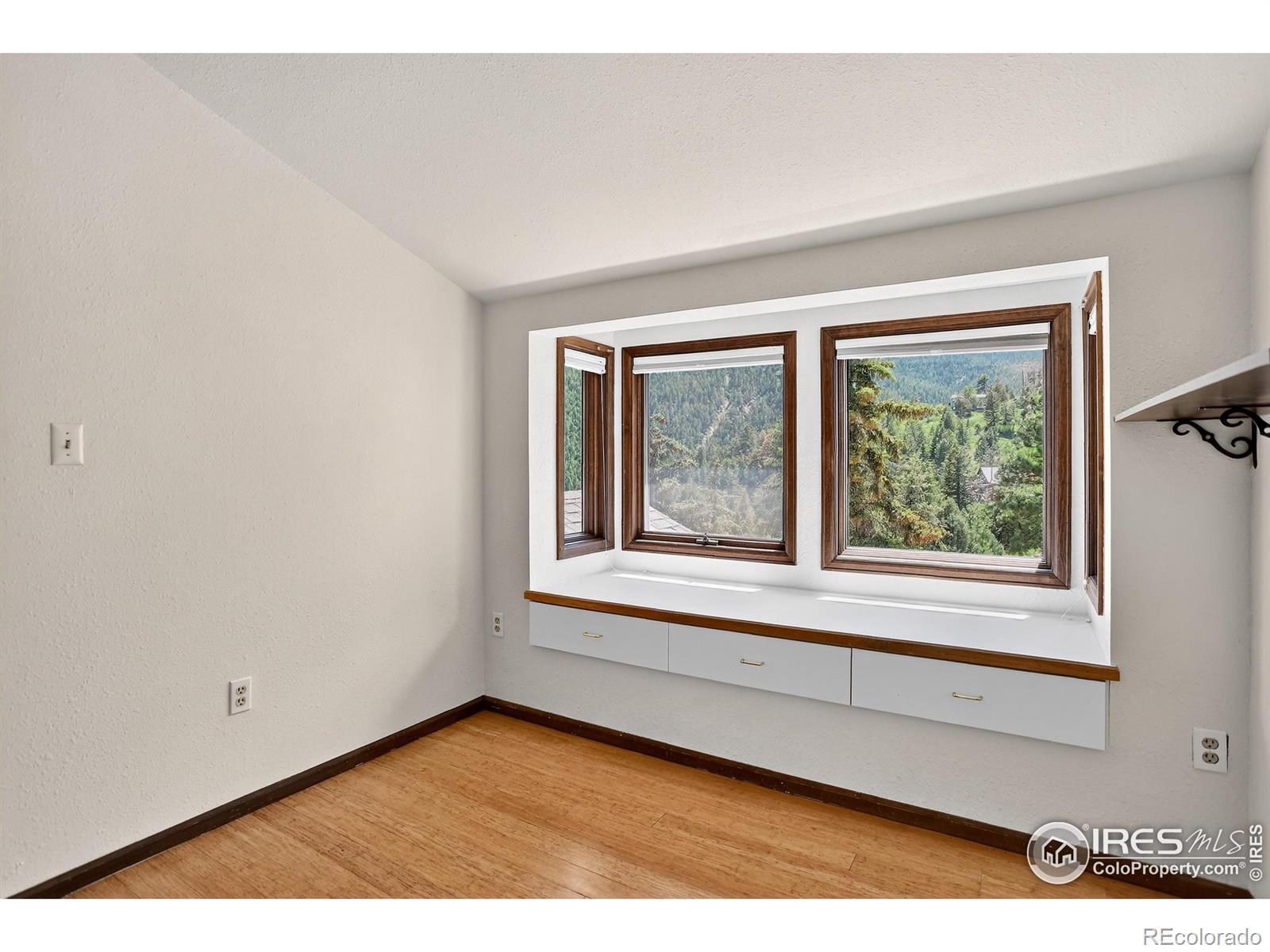 This unique 1,800 square foot house sits on 8.41 acres of land, offering breathtaking panoramic mountain views. The home features an open layout with hardwood floors in the kitchen and dining room and large windows that allow for an abundance of natural light. The property's exterior blends seamlessly with the greenery and mountainous terrain that surrounds the home. The spacious outdoor deck provides the perfect setting for enjoying the scenic views and star-filled night sky. Sunny, south-facing windows and central brick wall and tiled floor in living room act as integrated passive solar heating with wood stove and electric heat assist. With a 16 min drive to north Boulder (7.6 mi), no HOA, and privacy afforded by steep, sunny Nugget Hill Rd, you'll have your own mountain retreat while still being able to access the town.