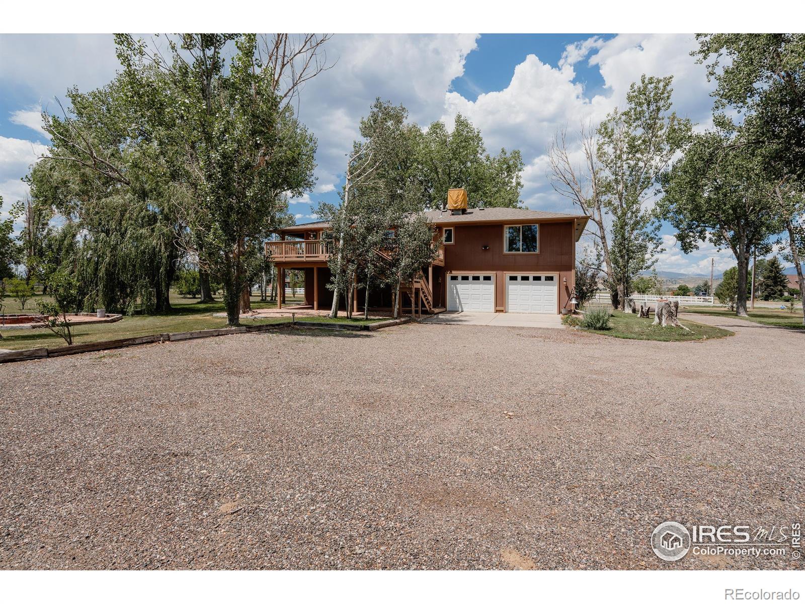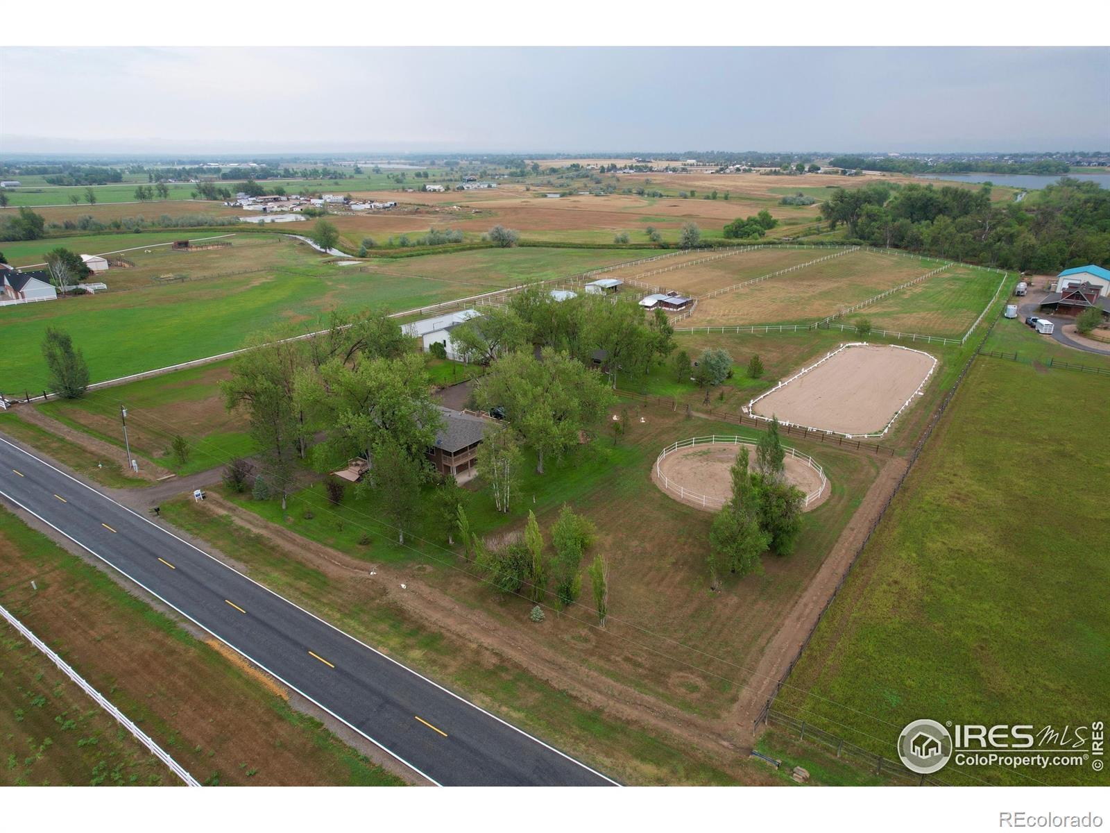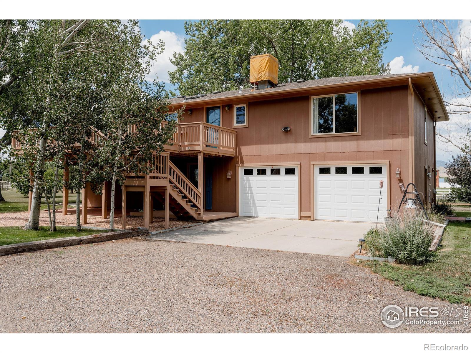Horse lover's dream! Endless possibilities on this 8.5 acre property backing to Lonetree Reservoir. Possibilities include, horse boarding, horse training, or just your own hobby farm. Beautiful setting, only minutes away from Loveland or Berthoud, yet with the feel of the country and open spaces. Bring the horses and chickens. Regulation sized riding arena. Round training corral. 4 safety fenced pastures. 4 stall heated barn. 3 paddocks with tall shed rows. Fantastic tack room with washing machine, 1/2 bath, and mini kitchenette. There is a separate barn workshop area to store all of your hay too. Giant chicken coop with heaters and fans for all the elements. House has been totally remodeled, with 3 beds 3 baths, hardwood floors throughout whole upper level. Detached caretaker's cottage, that is 1 bed, 1 bath, with full kitchen. 1/2 share of Handy Ditch. Best of all NO HOA! Come see it!