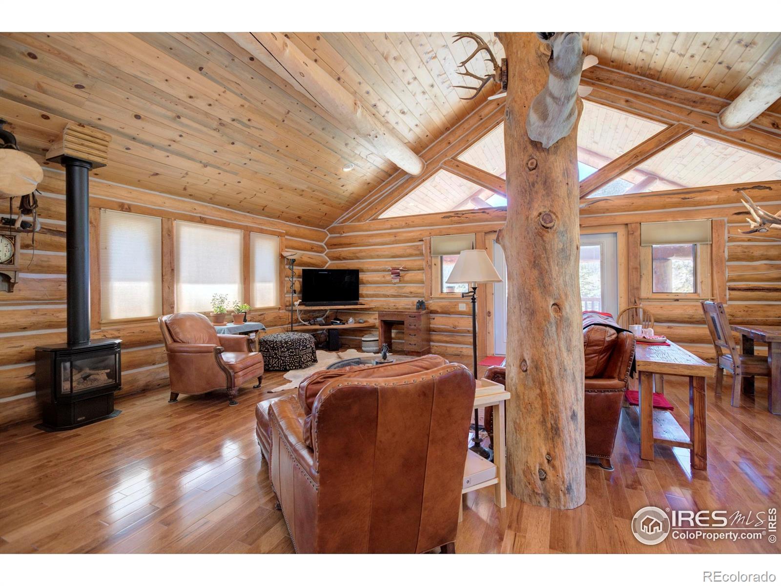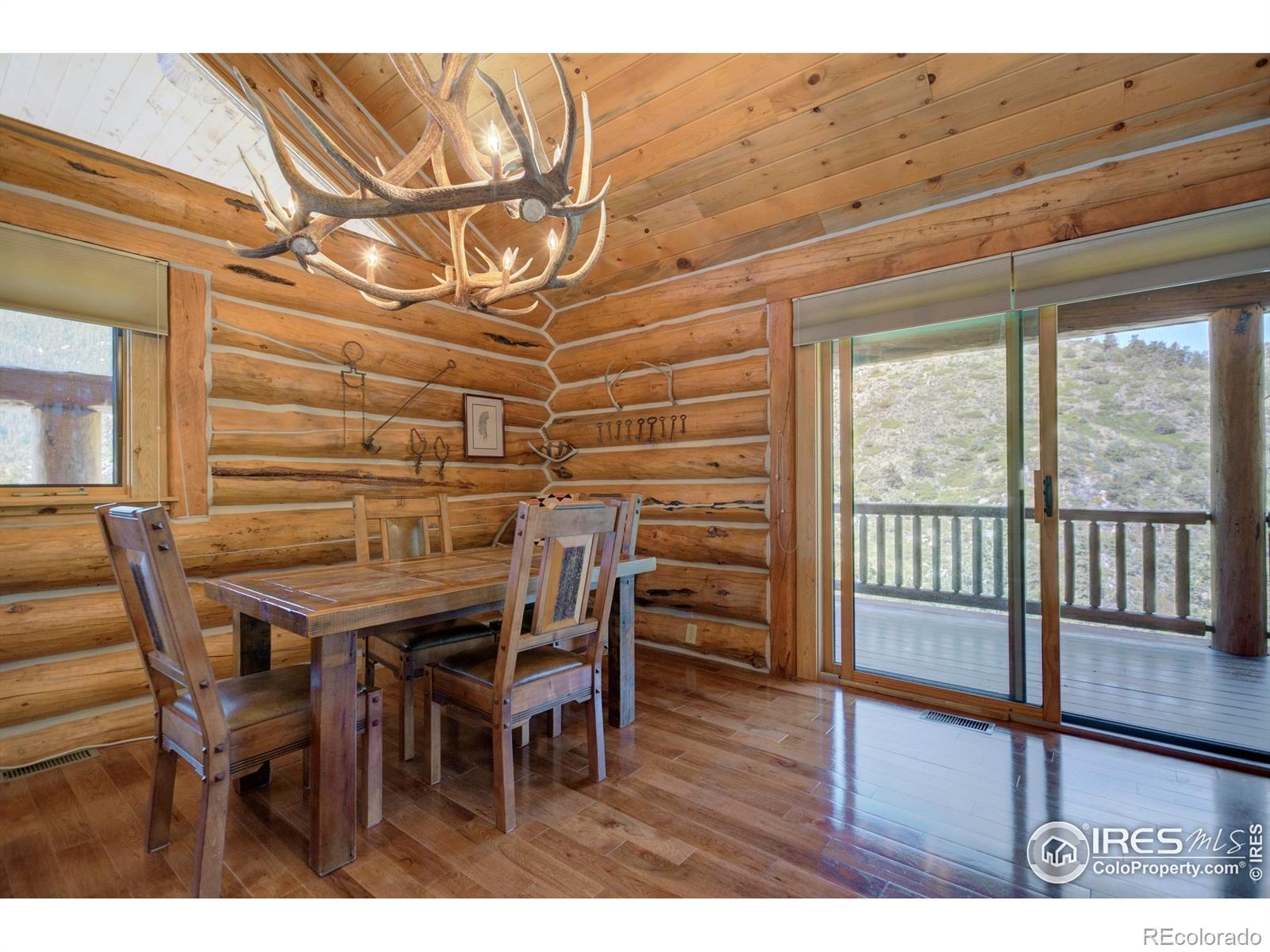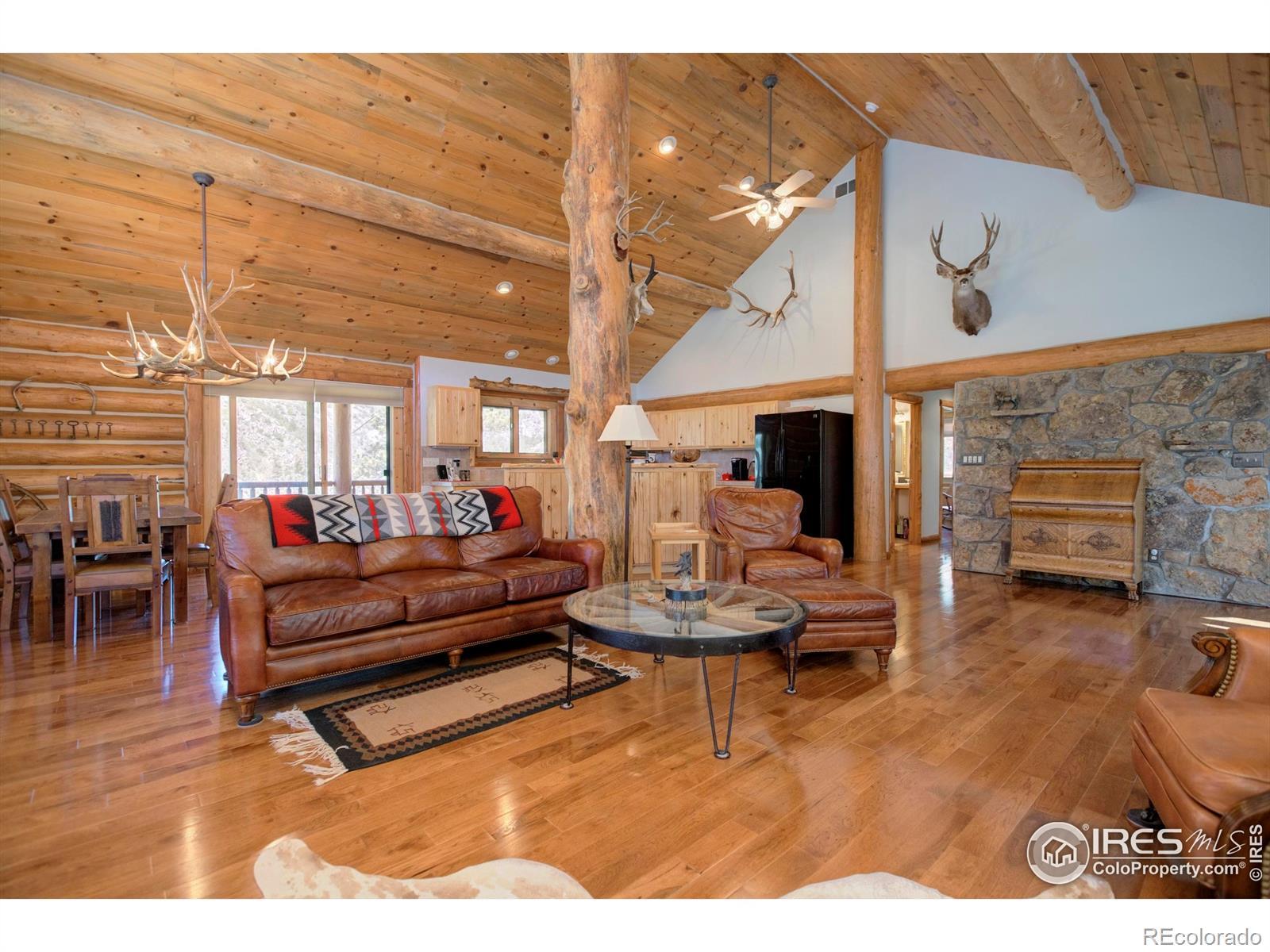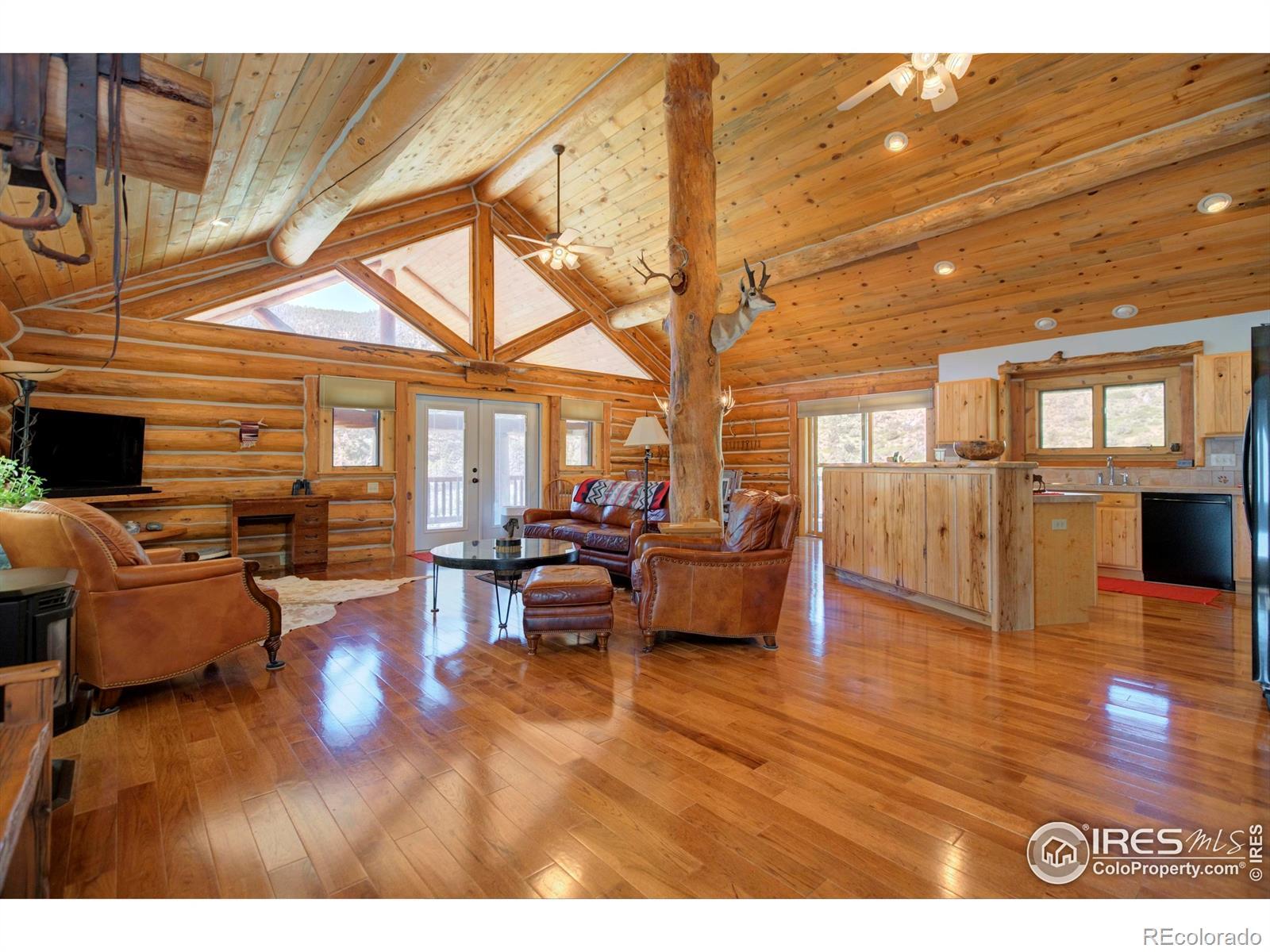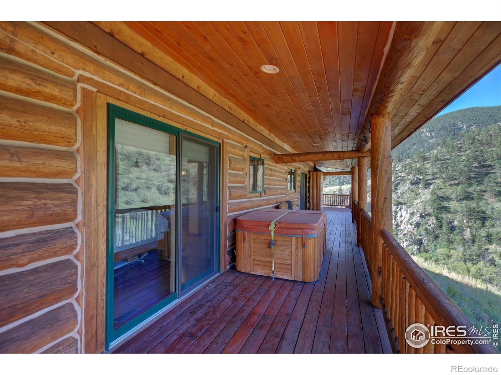Welcome to your Colorado mountain escape above the North fork of the Big Thompson Canyon - a handcrafted log home on 3.12 acres with panoramic views, unmatched privacy, and year-round access between Loveland and Estes Park. Built in 2001, at 1,440 square feet, this home packs a punch-well-laid-out, comfortable, and ready for whatever you've got planned.", with vaulted ceilings, a free standing stove, and a wraparound deck designed to soak in every sunrise and starry night. Ideal for those seeking solitude, recreation, and the authentic feel of the Rockies. This is a Colorado treasure. The home features 2 bedrooms and 2 baths, an open kitchen and living area, and thoughtful use of space throughout. Natural light pours in through large windows that frame the surrounding cliffs and forested hillsides. The home is served by a permitted domestic well and septic system, with forced air heat and propane stove for winter comfort.Outbuildings include a detached 320 sq ft studio with power (perfect for art, writing, or remote work), a 14x16 detached garage, a 20x23 large wood shop, and a permitted shipping container for secure storage. The 3.12-acre lot blends open, usable ground near the home with rugged timbered terrain, rock outcroppings, and natural privacy. Wildlife is abundant, and the setting supports hiking, exploring, and quiet time outdoors. Located just 25 minutes to Loveland, 20 minutes to Estes Park, and under an hour to Boulder and Fort Collins. Rocky Mountain National Park and the Roosevelt National Forest are within easy reach, and the North Fork of the Big Thompson River - known for its fly fishing - winds just below the property. This is mountain living with soul, simplicity, and a true sense of place.
