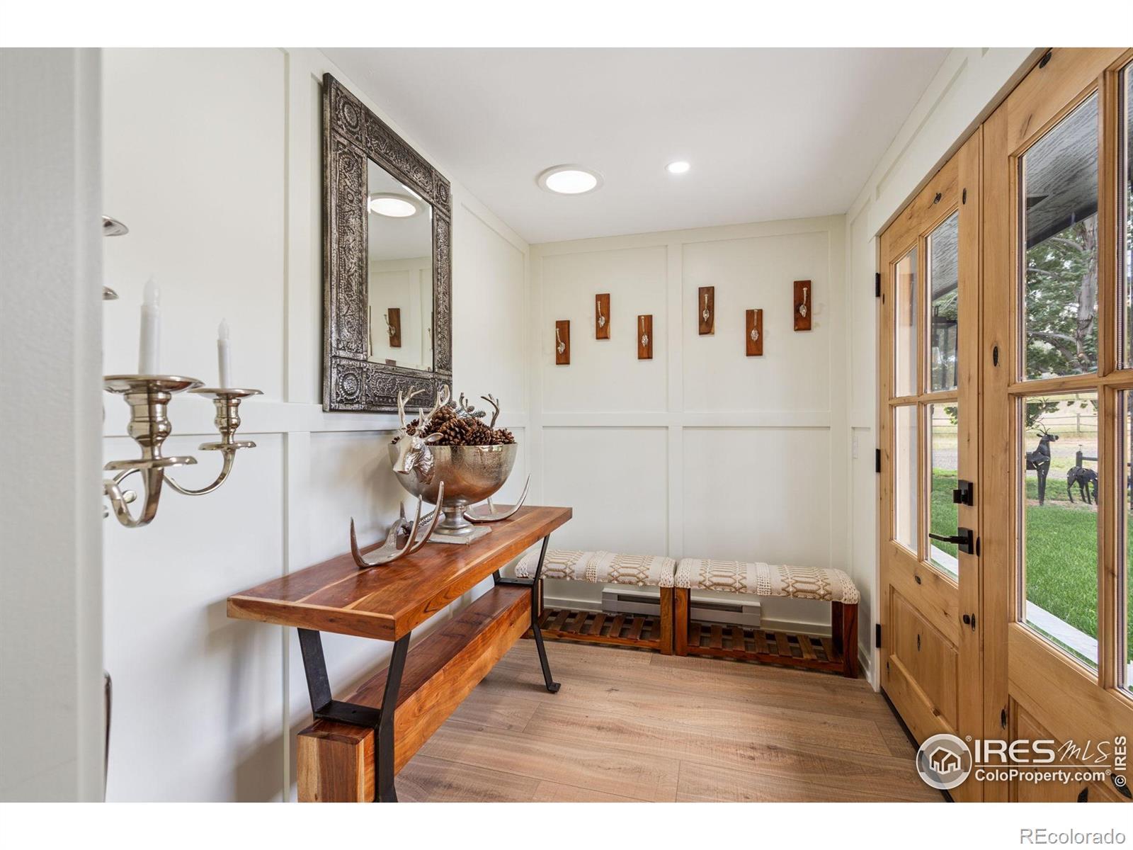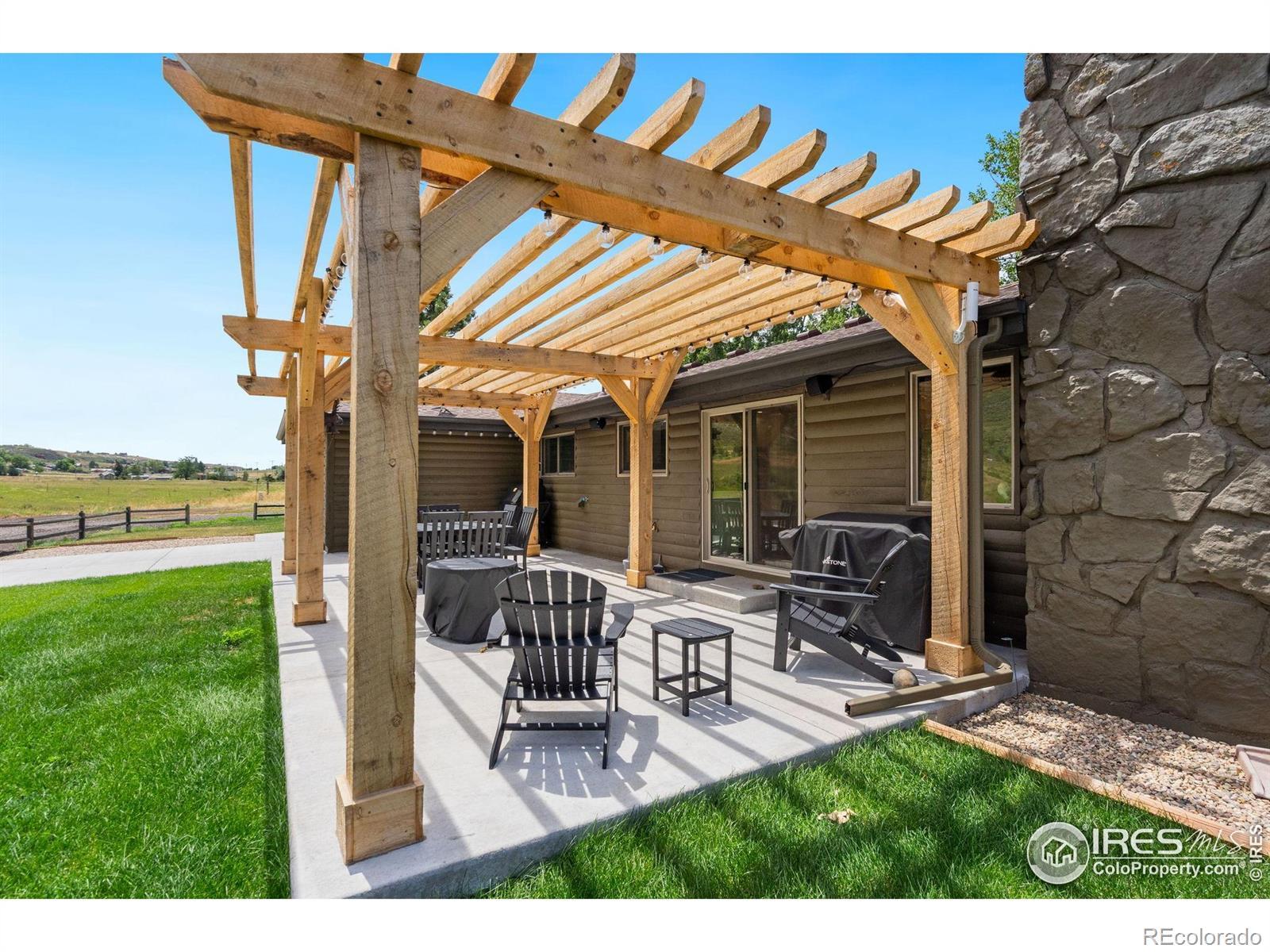 Experience luxury & tranquility in this completely renovated by builder/owner, 3,564 sq ft ranch home on 12.5 lush acres /rock outcroppings offering breathtaking views of foothills. Blending sleek sophistication with contemporary elegance, this thoughtfully re-designed home welcomes you w/warmth & new windows that flood the home w/natural light. Stunning stone hearth graces the gas fireplace creating a cozy, inviting atmosphere. Vaulted ceiling is crowned w/beautiful wood & beam ceiling that adds character. Gourmet kitchen is culinary dream, featuring quartz counters that cover oversized island w/breakfast bar, designer tile backsplash, high-end appliances including Forno double oven/microwave, Forno gas range, 2 built-in Forno refrigerators & dishwasher. Wine bar with refrigerator elevates your entertainment possibilities. Butler's pantry for special kitchenware, quaint 1/2 bath adjacent to laundry room & pantry. Home office offers privacy w/private entrance. Main level primary suite has spa-like bath w/2-person walk-in shower, oversized vanity, washer/dryer & walk-in w/custom built-ins. Basement features theater room, wet bar with wine refrigerator, 2 bedrooms, 3/4 bath & nice sized storage room. Outdoors you can enjoy wildlife and serenity on an oversized patio with a custom pergola enhanced with a hot tub & Al Fresco patio lights for evening BBQs. 2-car attached garage plus ample parking space for your recreational vehicles. Outbuildings include a 2,272 sq. ft. shop w/fully finished entertainment room that includes pool table and tv perfect for watching the game, a tack room/office and a covered loafing shed, additional storage shed, and an oversized loafing shed with concrete apron. Outbuildings are perfectly set up for your large & small animals! 15 mins from the Loveland corridor amenities. Close to the entrance to Big Thompson Canyon along the river leading to Estes Park & Rocky Mountain National Park. No HOA or covenants! Bring your horses! Welcome HOME!