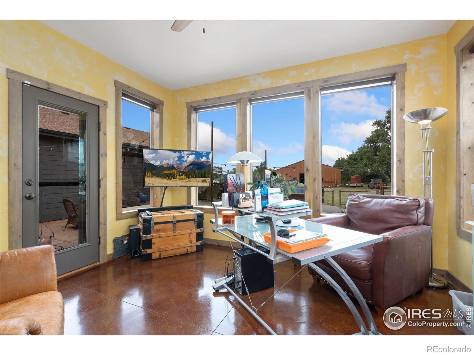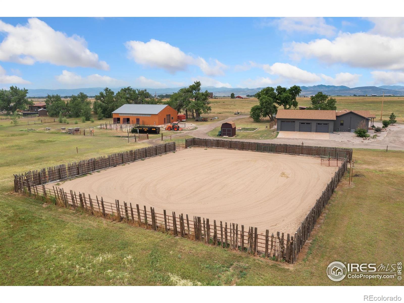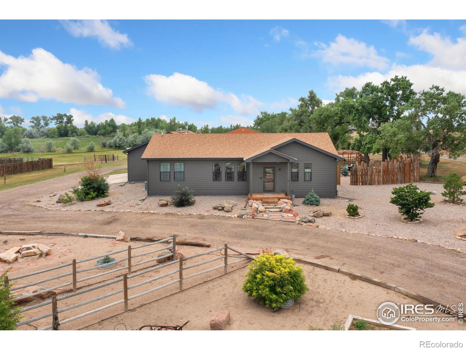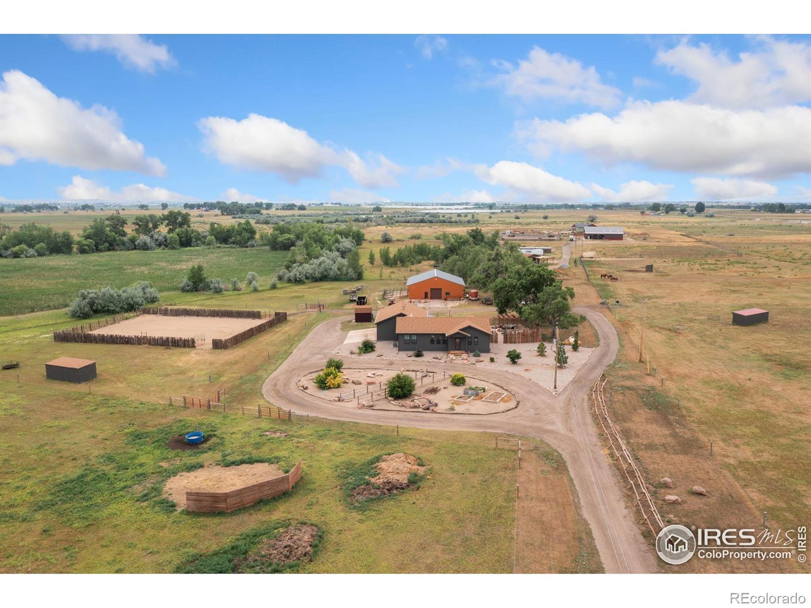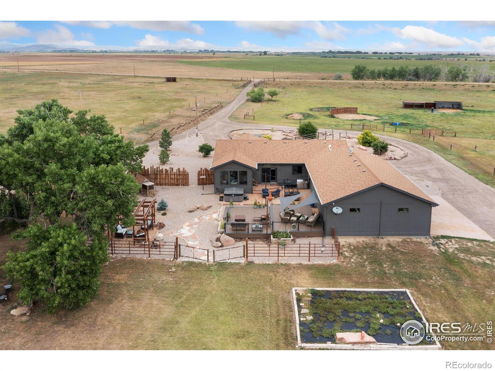 Dream equestrian estate on 38 acres! This sprawling property is fully loaded with thoughtfully designed features and horse-ready amenities. Pull in through the circular drive and be greeted by a low-maintenance xeriscape yard that blends effortlessly into the natural beauty of the surroundings. The single-level, custom-built home strikes a beautiful balance between rustic design and modern comforts, featuring an open layout with vaulted ceilings, stained concrete radiant heated floors and new A/C! Craftsmanship shines through with wood, stone, and industrial details that deliver a sleek warm aesthetic. The living room is centered around a stained steel ethanol fireplace that adds bold style and cozy ambiance. Enjoy cooking your favorite meals in the kitchen, equipped with stainless steel appliances, granite counters, tiled backsplash, and a large island with bar seating. Two bedrooms are positioned on opposite ends of the home, for added privacy, each with an elegant chandelier and space to relax. The primary includes a walk-in closet, a private ensuite bath. The sunroom is flexible enough to become a home office, guest room, nursery, studio, or reading nook. Outdoor living is elevated with a fenced backyard oasis, complete with a concrete patio that's already equipped with a hot tub, a pergola for lazy afternoons, plus a two-tier raised deck with sun shades and warm lighting. The attached 3-car insulated garage includes built-in cabinets and a workbench, perfect for hobbies or additional storage. The fully insulated 2,688 sqft barn is the heart of the property's equestrian setup. Inside, you'll find a tack room, hay storage, utility area, three rubber-matted stalls, and tall doors big enough for tractors or trailers. A fully fenced riding arena, four pastures with horse-safe fencing, and multiple loafing sheds round out the property's horse-friendly amenities. Quick access to I-25 keeps everything within reach. 3rd BR is non-conforming.