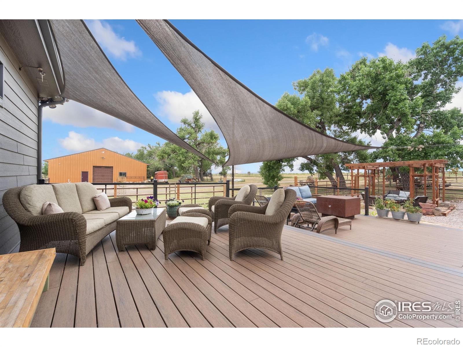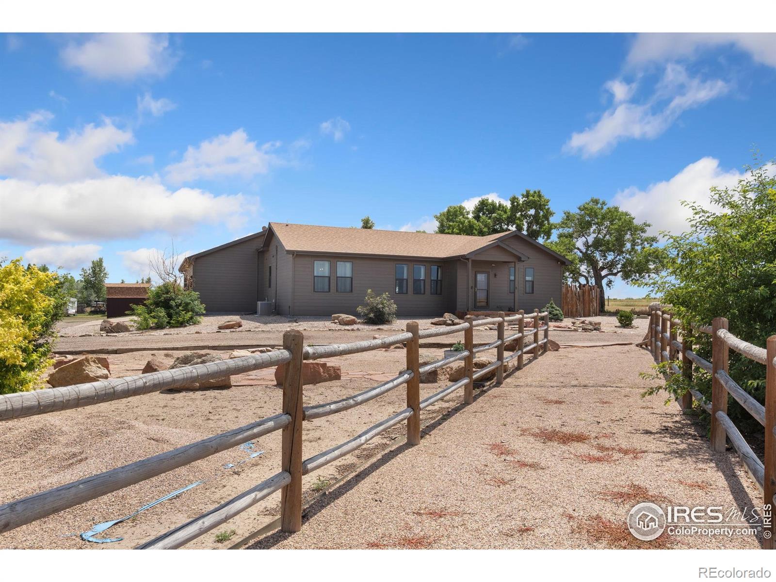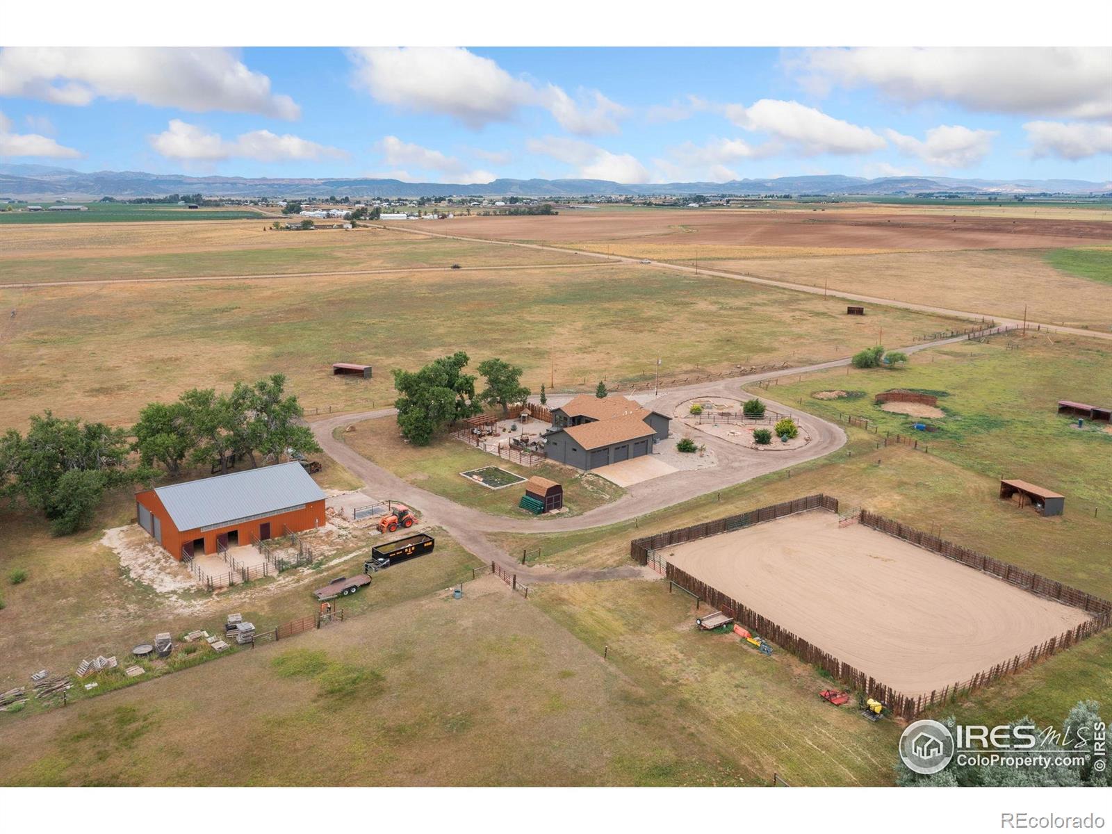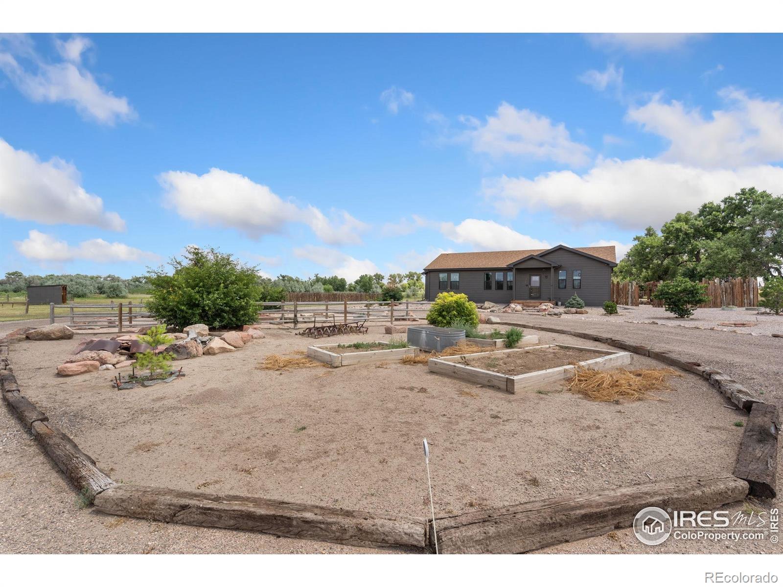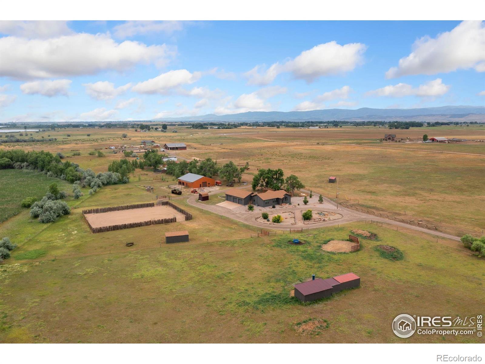 Dream equestrian estate on 38 acres! This sprawling property is fully loaded with thoughtfully designed features and horse-ready amenities. Pull in through the circular drive and be greeted by a low-maintenance xeriscape yard that blends effortlessly into the natural beauty of the surroundings. The single-level, custom-built home strikes a beautiful balance between rustic design and modern comforts, featuring an open layout with vaulted ceilings, stained concrete radiant heated floors and new A/C! Craftsmanship shines through with wood, stone, and industrial details that deliver a sleek warm aesthetic. The living room is centered around a stained steel ethanol fireplace that adds bold style and cozy ambiance. Enjoy cooking your favorite meals in the kitchen, equipped with stainless steel appliances, granite counters, tiled backsplash, and a large island with bar seating. Two bedrooms are positioned on opposite ends of the home, for added privacy, each with an elegant chandelier and space to relax. The primary includes a walk-in closet, a private ensuite bath. The sunroom is flexible enough to become a home office, guest room, nursery, studio, or reading nook. Outdoor living is elevated with a fenced backyard oasis, complete with a concrete patio that's already equipped with a hot tub, a pergola for lazy afternoons, plus a two-tier raised deck with sun shades and warm lighting. The attached 3-car insulated garage includes built-in cabinets and a workbench, perfect for hobbies or additional storage. The fully insulated 2,688 sqft barn is the heart of the property's equestrian setup. Inside, you'll find a tack room, hay storage, utility area, three rubber-matted stalls, and tall doors big enough for tractors or trailers. A fully fenced riding arena, four pastures with horse-safe fencing, and multiple loafing sheds round out the property's horse-friendly amenities. Quick access to I-25 keeps everything within reach. 3rd BR is non-conforming.