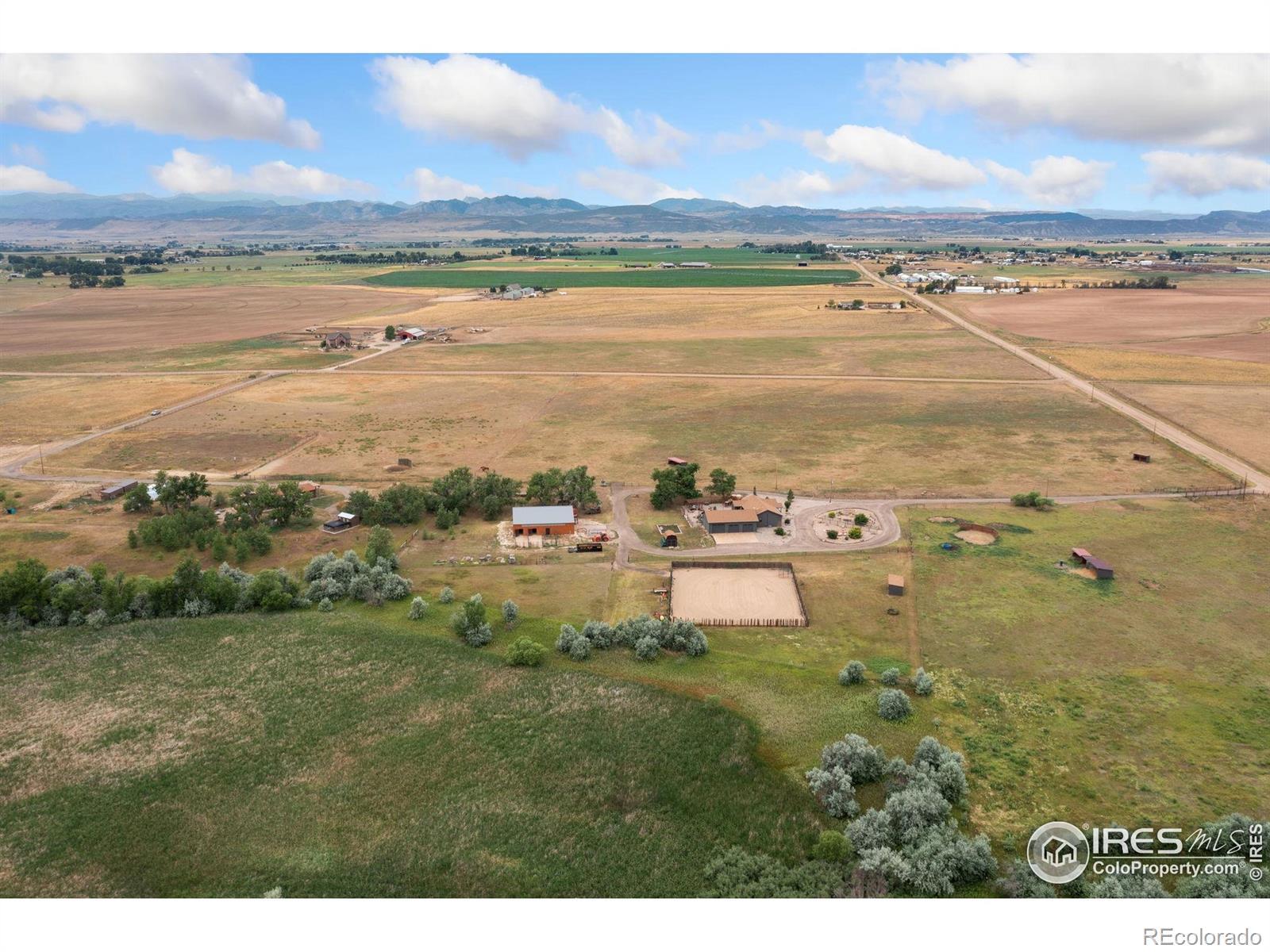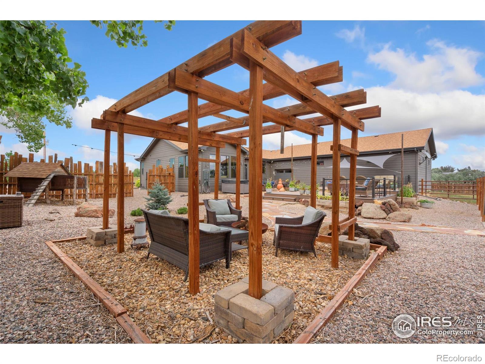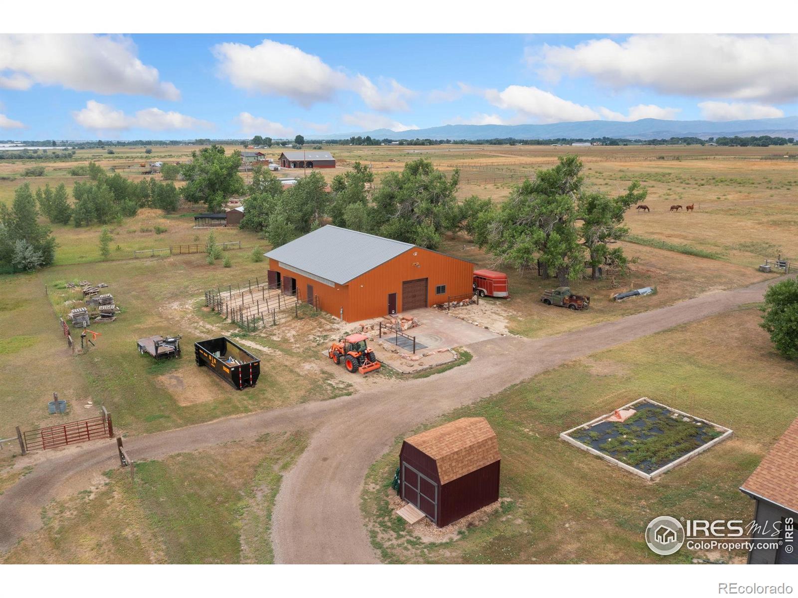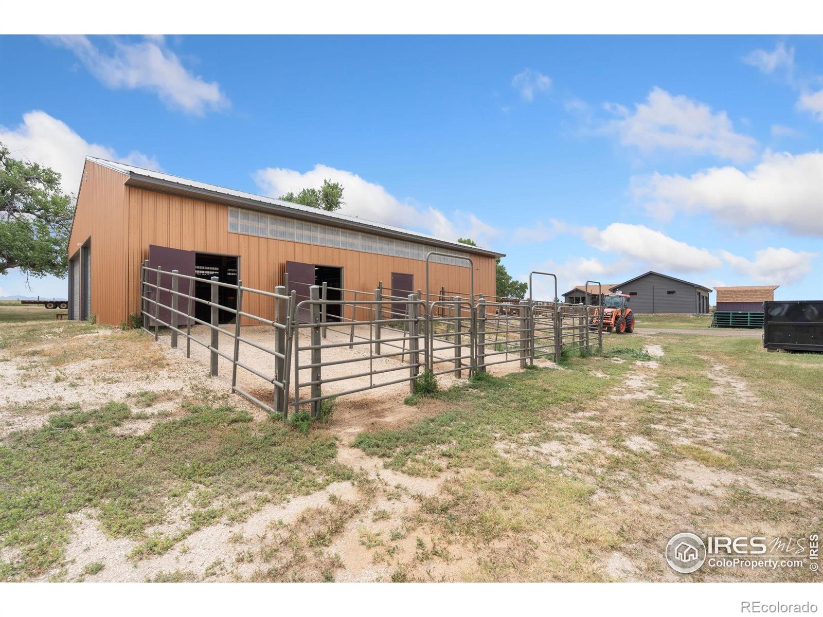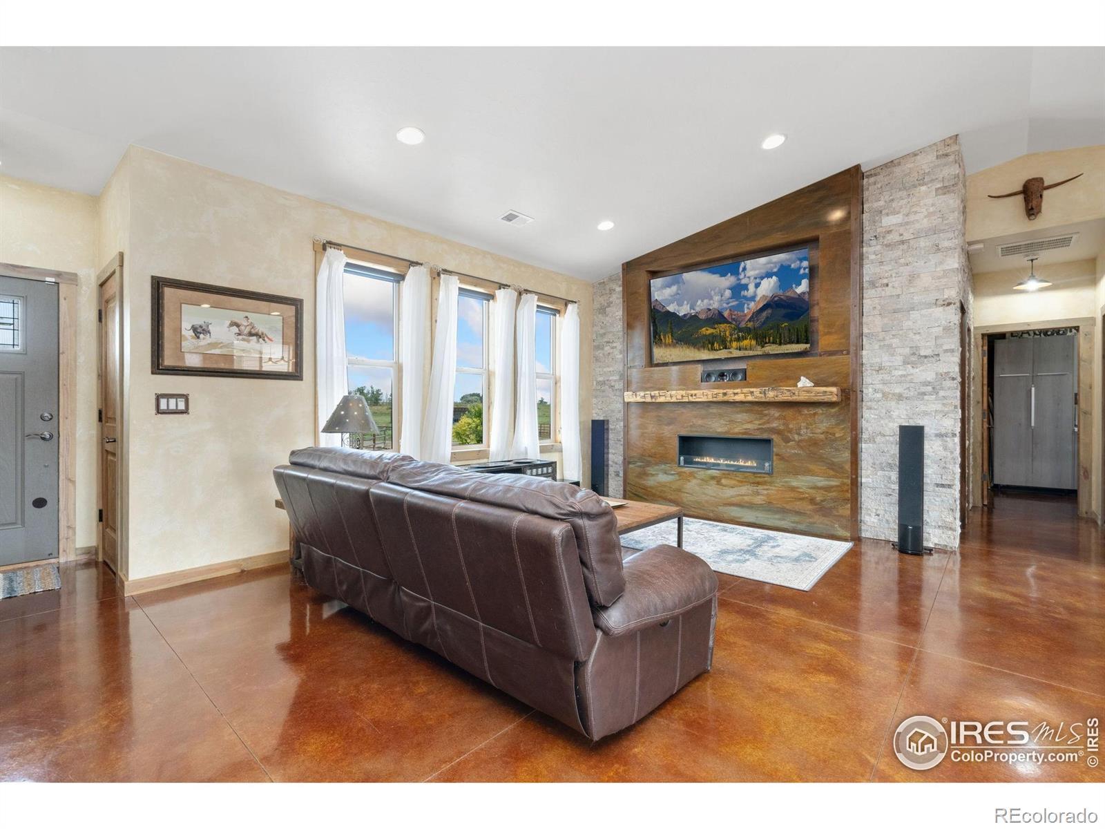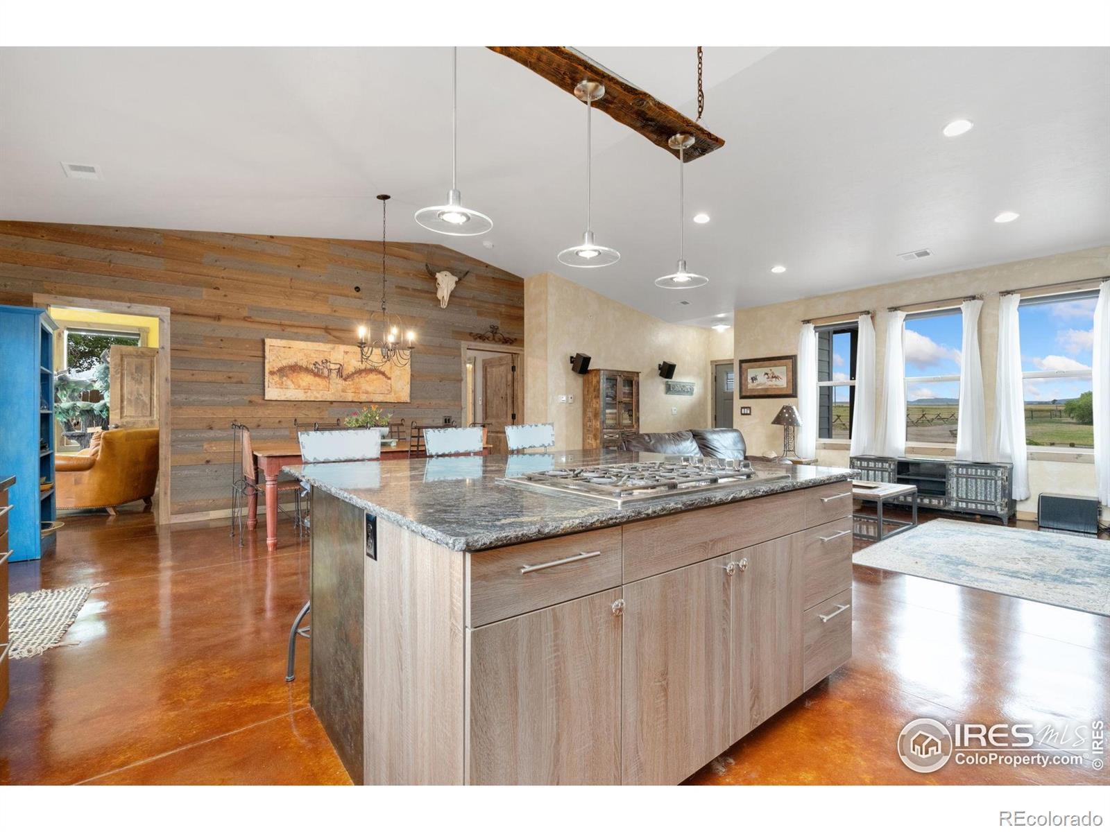 Dream equestrian estate on 38 acres! This sprawling property is fully loaded with thoughtfully designed features and horse-ready amenities. Pull in through the circular drive and be greeted by a low-maintenance xeriscape yard that blends effortlessly into the natural beauty of the surroundings. The single-level, custom-built home strikes a beautiful balance between rustic design and modern comforts, featuring an open layout with vaulted ceilings, stained concrete radiant heated floors and new A/C! Craftsmanship shines through with wood, stone, and industrial details that deliver a sleek warm aesthetic. The living room is centered around a stained steel ethanol fireplace that adds bold style and cozy ambiance. Enjoy cooking your favorite meals in the kitchen, equipped with stainless steel appliances, granite counters, tiled backsplash, and a large island with bar seating. Two bedrooms are positioned on opposite ends of the home, for added privacy, each with an elegant chandelier and space to relax. The primary includes a walk-in closet, a private ensuite bath. The sunroom is flexible enough to become a home office, guest room, nursery, studio, or reading nook. Outdoor living is elevated with a fenced backyard oasis, complete with a concrete patio that's already equipped with a hot tub, a pergola for lazy afternoons, plus a two-tier raised deck with sun shades and warm lighting. The attached 3-car insulated garage includes built-in cabinets and a workbench, perfect for hobbies or additional storage. The fully insulated 2,688 sqft barn is the heart of the property's equestrian setup. Inside, you'll find a tack room, hay storage, utility area, three rubber-matted stalls, and tall doors big enough for tractors or trailers. A fully fenced riding arena, four pastures with horse-safe fencing, and multiple loafing sheds round out the property's horse-friendly amenities. Quick access to I-25 keeps everything within reach. 3rd BR is non-conforming.