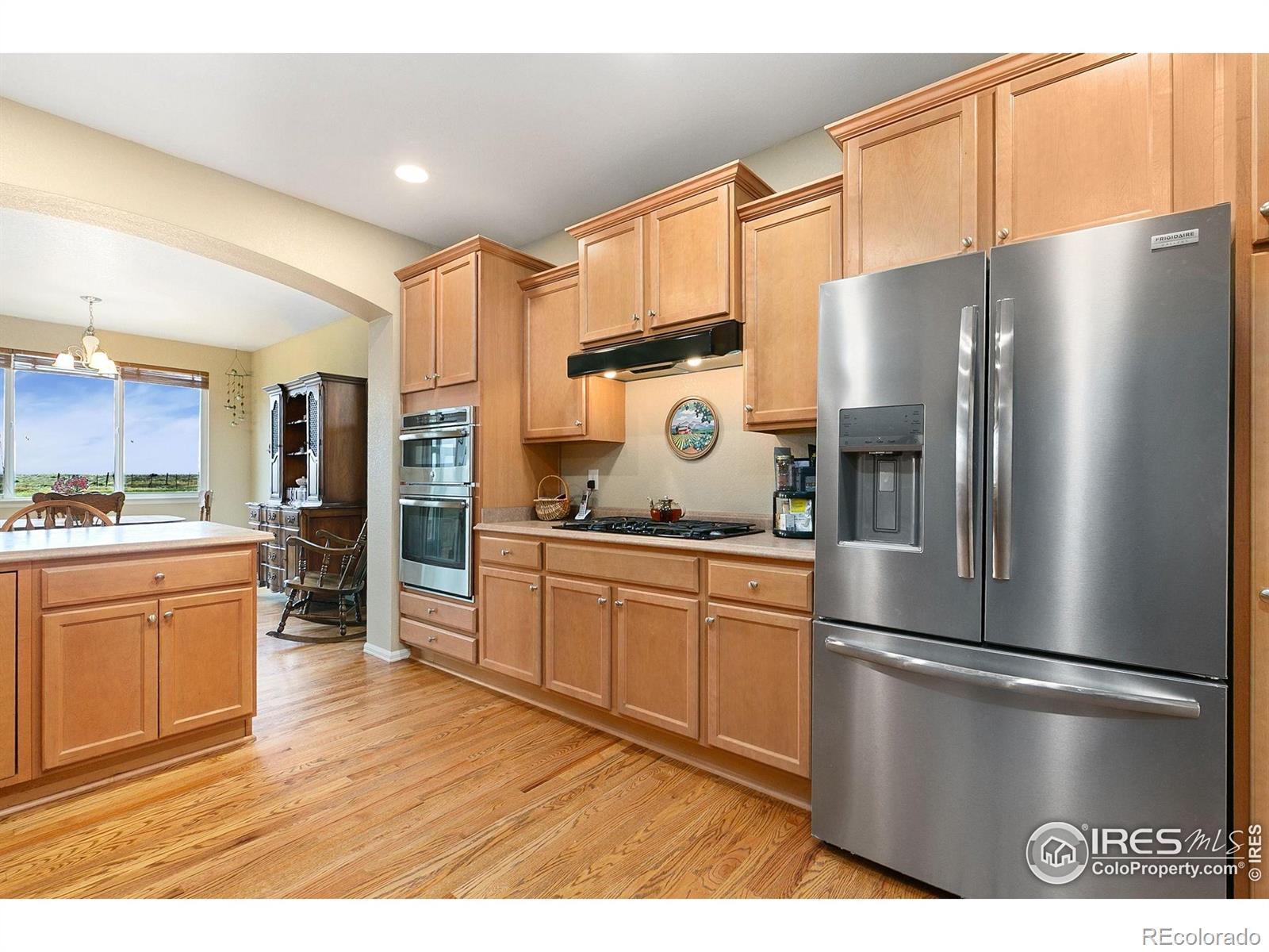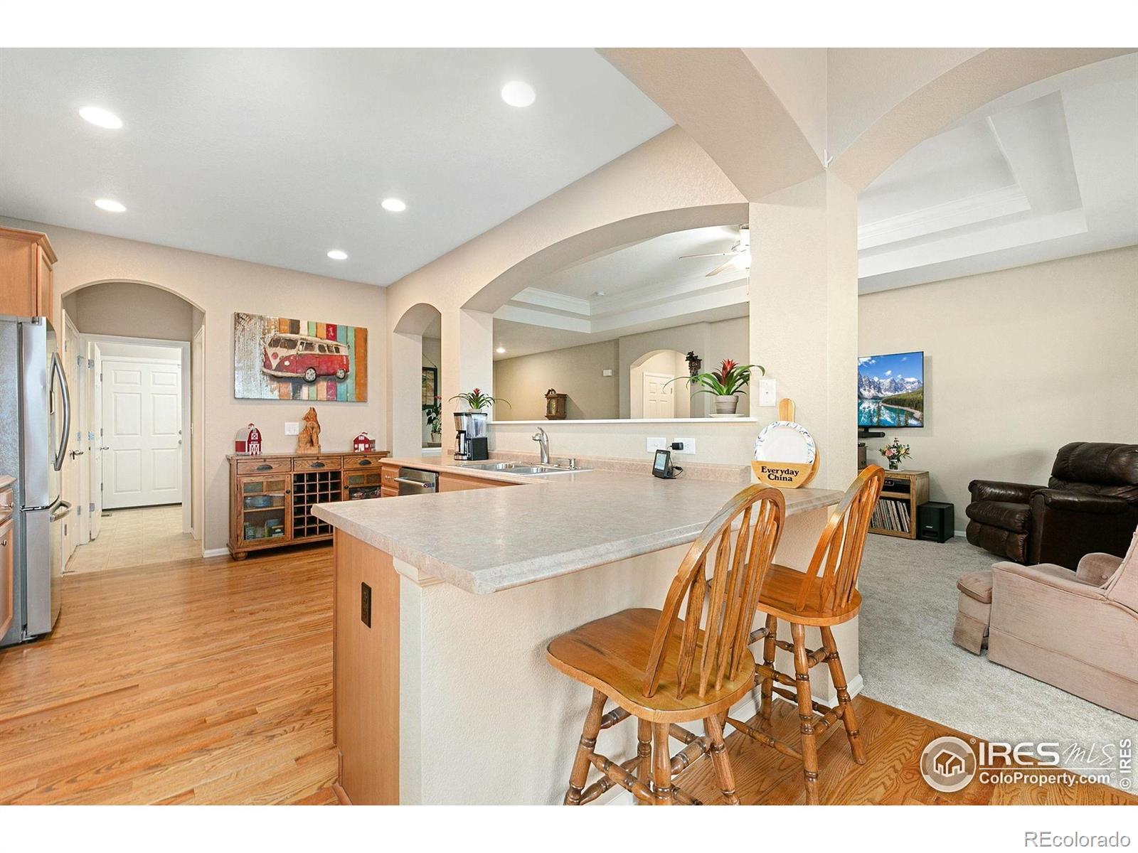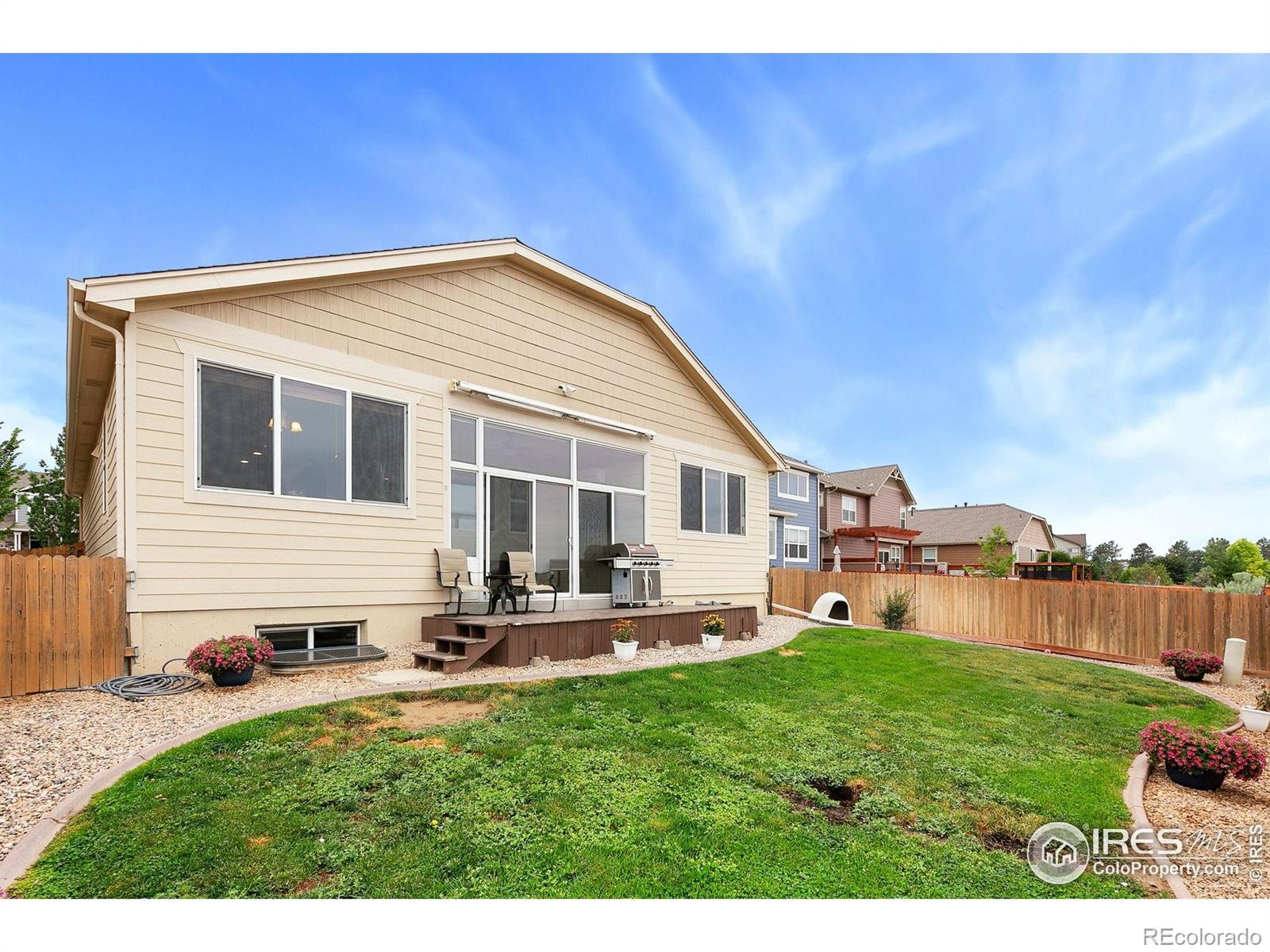 Enjoy summer sunsets and unobstructed mountain views from your back deck, sunroom, and private backyard enhanced by HOA-included non-potable-water sprinklers and a back deck awning for instant shade and seamless indoor outdoor living. Inside, 9-foot ceilings and coffered accents frame a chef's kitchen with stainless-steel appliances, gas range, center island, and real hardwood floors in the kitchen and entry. An 8-foot garage door accommodates taller vehicles and workshop storage, while recent capital improvements including a 2018 roof replacement, fresh exterior paint (2024), new carpeting, and a new water heater in April 2025 ensure low-maintenance living. The open great room and formal dining/study flex space invite entertaining, and abundant natural light pours through oversized windows. South facing and nestled in a vibrant mixed-use community of single-family homes, townhomes, and newer builds, you're steps from a modern park with open green space, playground, pump-track for bikes, basketball court, and walking trails winding through native landscaping. Commuters will appreciate quick access to Old Town Fort Collins's shops and restaurants as well as I-25, making regional travel effortless. A generous unfinished basement with crawlspace and rough-in plumbing offers endless expansion possibilities for a home gym, media room, guest suite, or hobby studio. Meticulously maintained and thoughtfully appointed, this ranch-style home delivers a perfect blend of style, comfort, and flexibility.