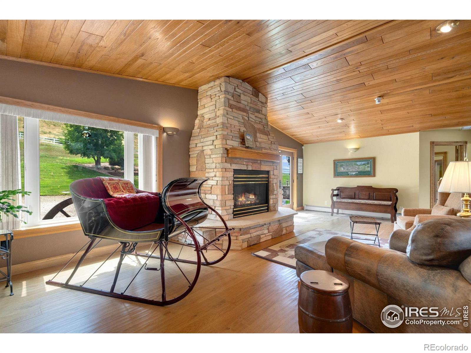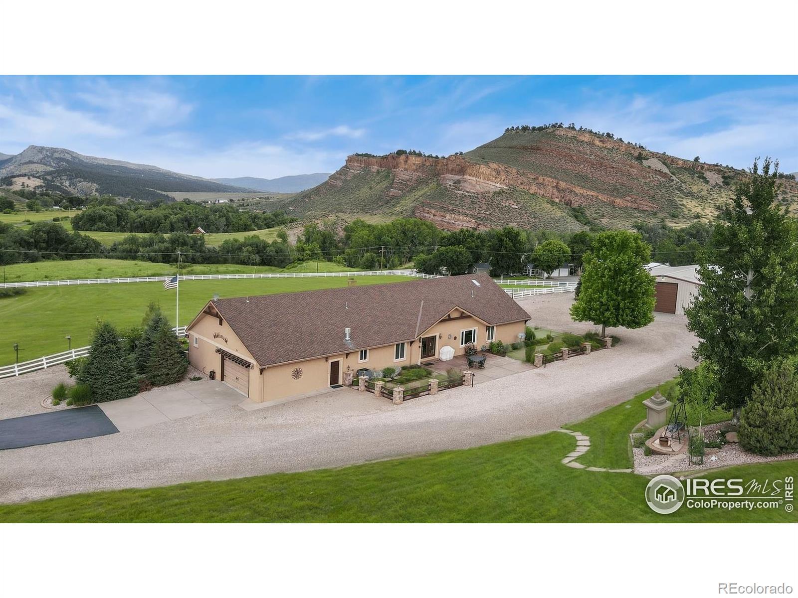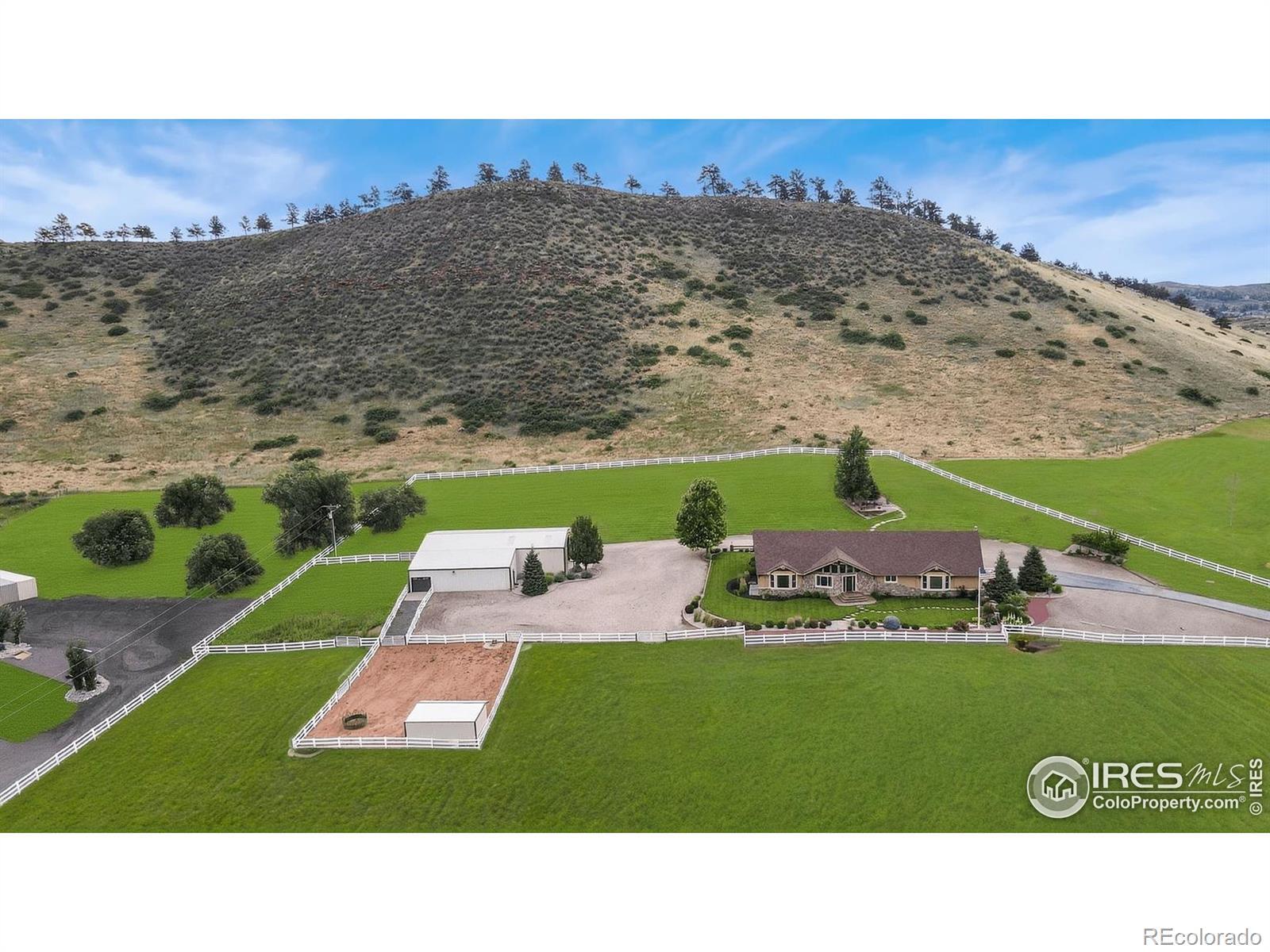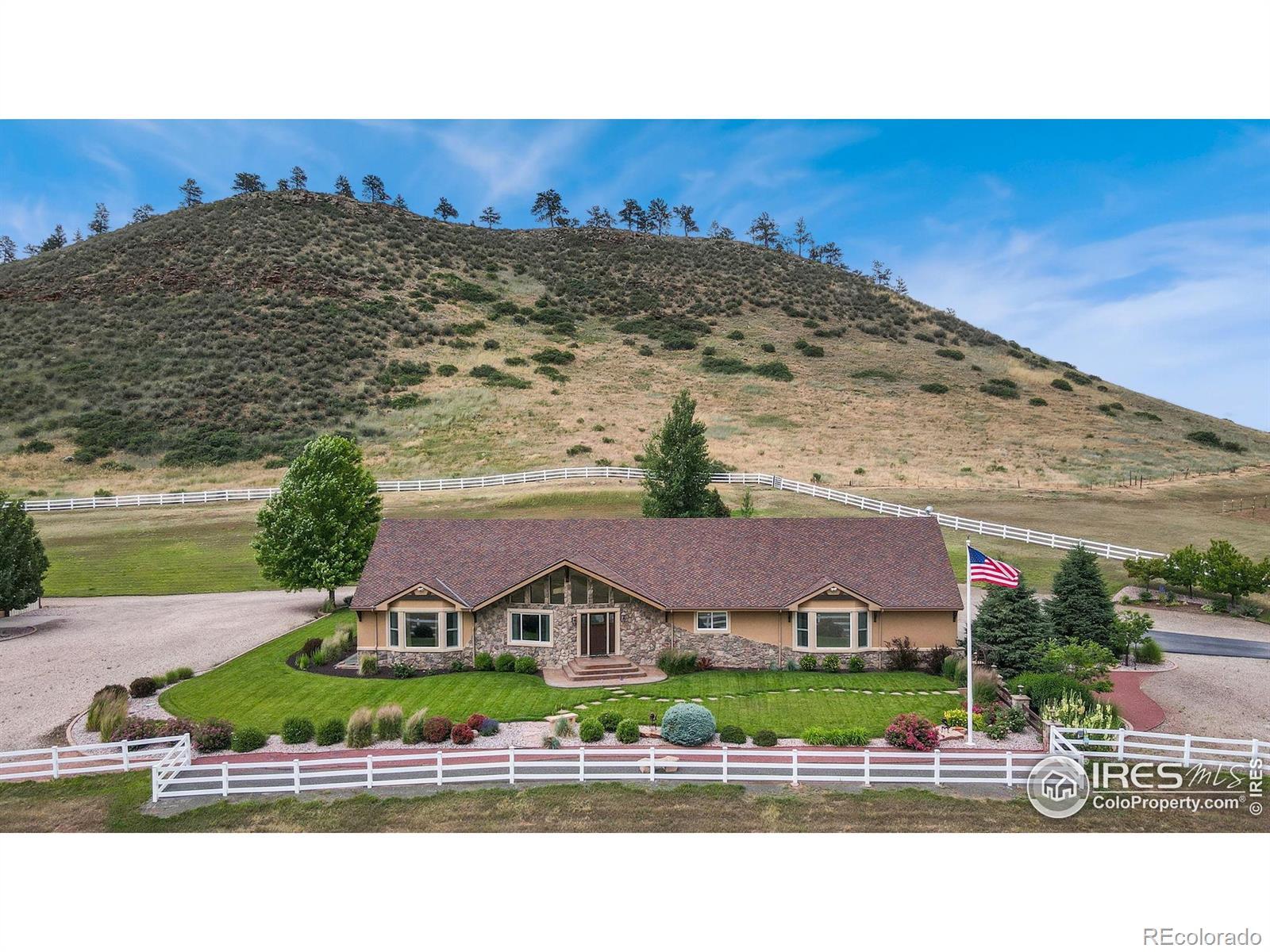 Discover your dream ranch home. Horse, animal enthusiast and serene nature retreat. Stunning large ranch home on nearly 9 acres close to Loveland and all amenities. Welcome to your personal sanctuary, where rustic elegance meets modern comfort! Ranch home with panoramic views offers a perfect blend of spacious living. Ideal for horse, animal lovers, hobby farm and nature enthusiasts alike. As you approach this impressive well maintained updated property you are greeted by a gated entrance, fully fenced property that opens to a lush pasture for horses and animals, complete with fully equipped barn, corral, tack room and loafing shed ensuring your animals have the best home possible. Step inside this stunning home and you will immediately appreciate the craftsmanship and thoughtful layout. The heart of the home features an open concept living area bathed in natural light, highlighted by an inviting fireplace that adds warmth and charm. Perfect for entertaining, the spacious great room seamlessly transitions to a gourmet kitchen, ample counter space, oversized island for casual meals and a dining room. Four generously sized bedrooms with two being primary suites. The two primary suites are designed for relaxation and views of the landscape, featuring ensuite bathrooms, walk-in closets, one features a cozy fireplace and water feature. Elevator access and exterior entrance to fully finished Rustic Western basement with a large non-conforming bedroom, ensuite bath, multi-purpose room and a bath. 2800 sq.ft. insulated shop/garage offers endless possibilities. Use as a workshop, garage or additional storage for all your toys and outdoor equipment. This exceptional property doesn't just offer a home; it invites you to embrace a lifestyle. Experience the magic of country living at its finest! Property has both a well for exterior watering and is on Little Thompson Water. Fire hydrant at entrance to the property. Don't miss the opportunity to make this property your own.