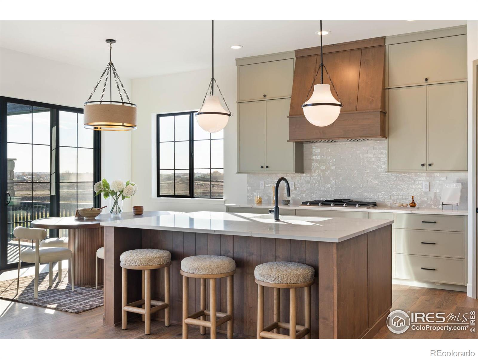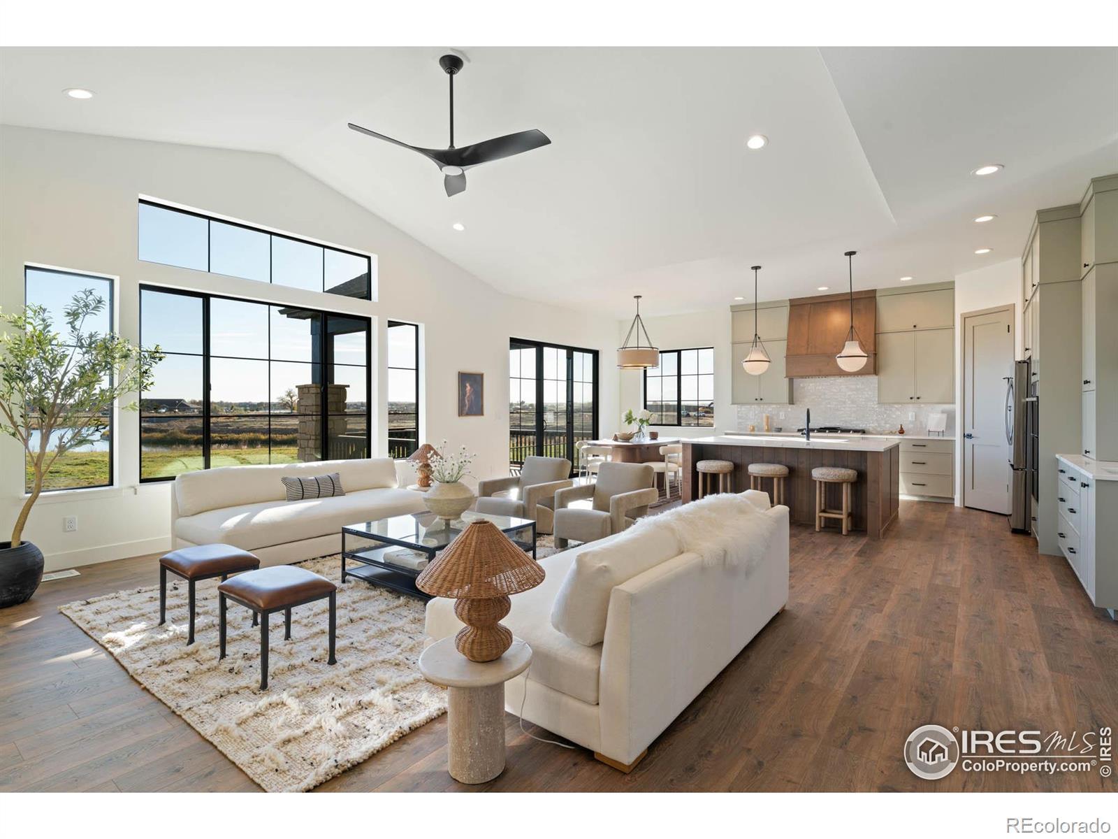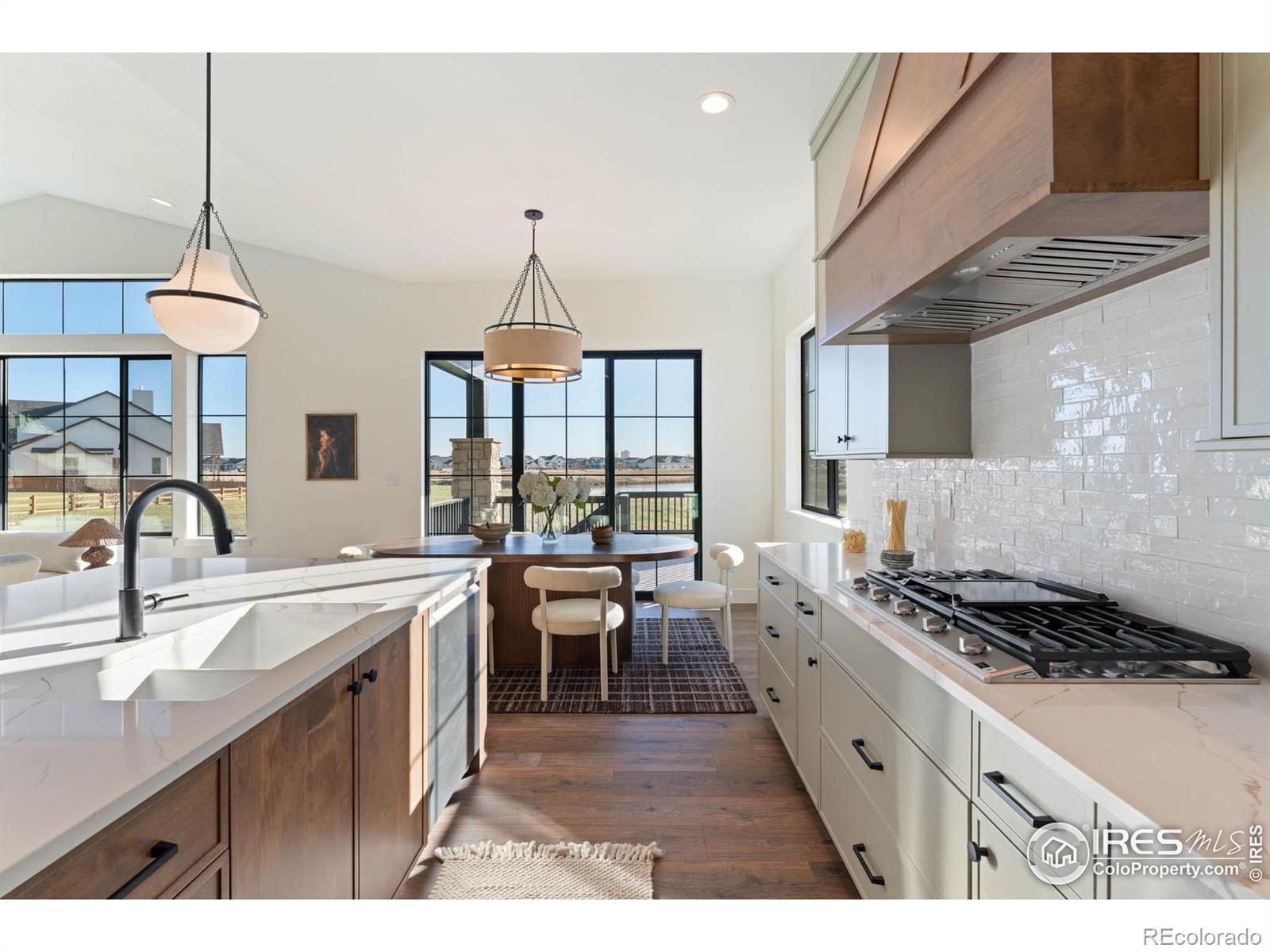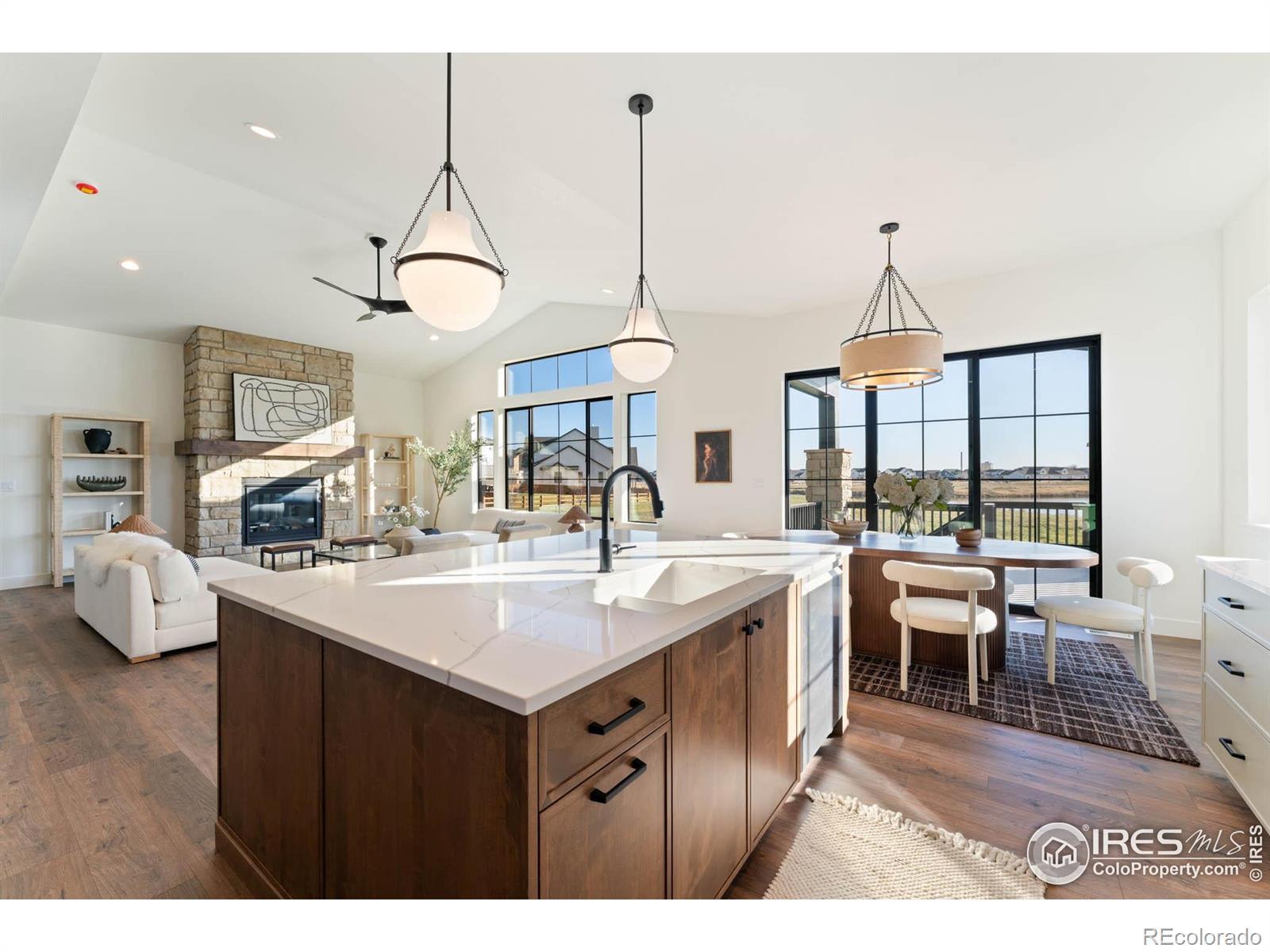 Step into effortless single-story living with the Quandary, a thoughtfully designed ranch-style home located in the highly sought-after Greenspire at Windsor Lake community. Positioned on a premium garden-level lot, this home backs to open space and offers peaceful views of the canal leading to Windsor Lake and the foothills. Blending upscale finishes with a bright, open layout, this home offers both style and comfort. Natural light fills the main level through expansive black grid windows that beautifully frame the surrounding landscape. Vaulted ceilings add to the open feel, creating an inviting and spacious atmosphere. The chef's kitchen features custom cabinetry in a warm taupe-gray, complemented by quartz countertops, a sleek range hood, stainless steel appliances, and black fixtures throughout for a cohesive, modern look. The kitchen flows into the dining area and great room, where a floor-to-ceiling stone fireplace serves as a striking focal point for both relaxing and entertaining. Step outside to enjoy Colorado's beautiful weather from the covered front porch or the spacious back patio. Enjoy scenic views of the water and foothills with the added privacy of no rear neighbors. The primary suite offers a luxurious retreat with a spa-inspired five-piece bath, including a freestanding soaking tub, walk-in shower, and dual sink vanity. A modern open railing leads to the finished basement, complete with a large recreation room, two additional bedrooms, a full bath, and a stylish wet bar. This versatile space is ideal for movie nights, hosting guests, or everyday living. Additional highlights include a professionally landscaped front yard and a location just minutes from Windsor Lake, scenic trails, and the heart of downtown Windsor. We can't wait to welcome you home to Greenspire at Windsor Lake, schedule your private tour today!