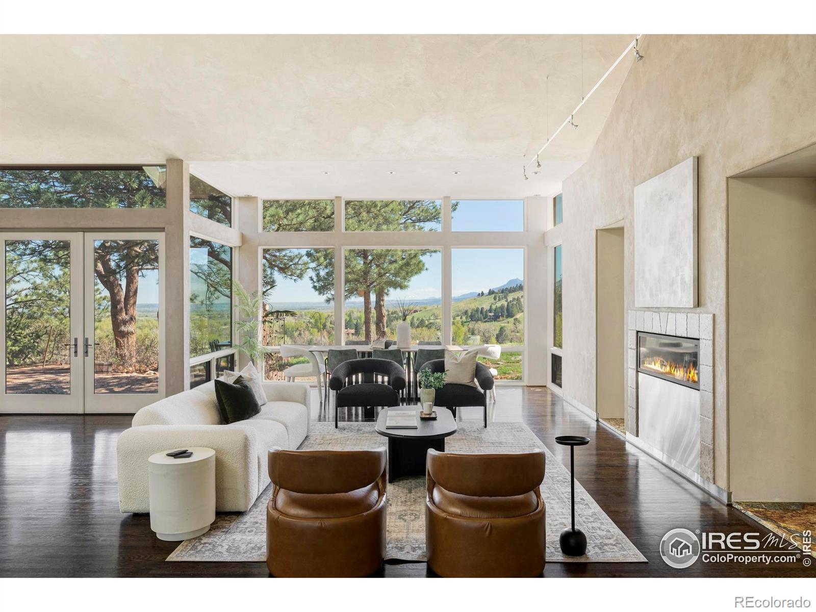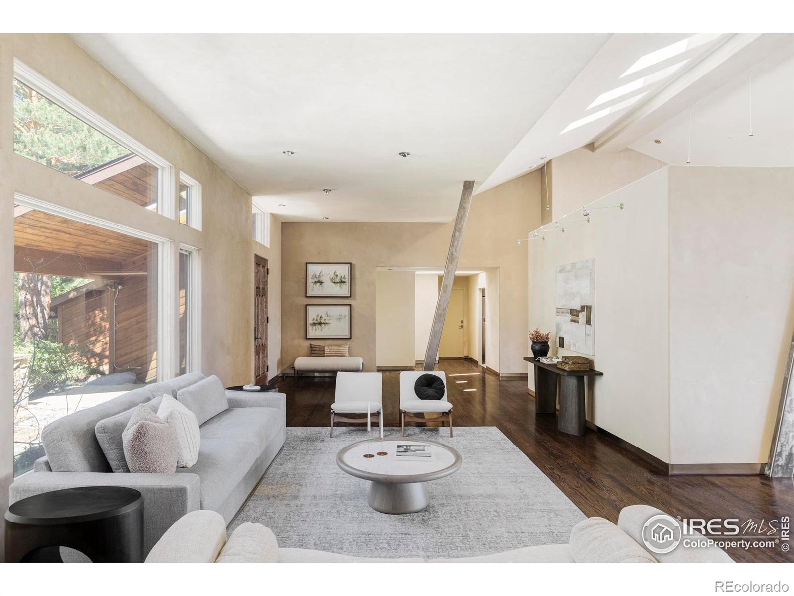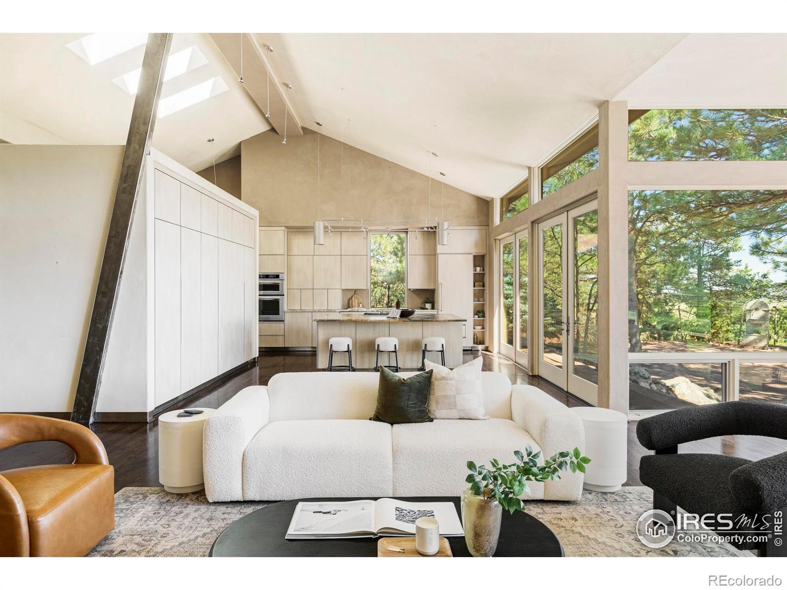 Welcome to a one-of-a-kind retreat in Lake of the Pines, Boulder's only gated lake community. Set on a serene, pine-studded lot with dramatic views of the foothills and flatirons, this architectural gem blends clean modern lines with natural textures and expansive glass for a true indoor-outdoor connection. Step through the custom-crafted front door and into the main living area, where vaulted ceilings and floor-to-ceiling windows frame a breathtaking panorama. A spacious living room flows into the open-concept family room with a gas fireplace-anchoring the heart of the home in warmth and light. Designed for both beauty and function, the kitchen features sleek built-ins, a paneled refrigerator that blends seamlessly with the cabinetry, high-end appliances, and a striking stone island with bar seating. The kitchen and adjacent formal dining area opens to the generous stone patio through two sets of double doors-ideal for entertaining or quiet evenings surrounded by nature. The home's private living spaces are located on the main level, including a peaceful primary suite with tranquil views, a spa-like bath, and walk-in closet. Two additional bedrooms share a well-appointed bathroom. An office-which can also serve as a fourth bedroom-along with the mudroom, laundry room and three-quarter bath complete the main level and connect to the oversized 4-car garage, perfect for storing gear for every season of adventure. The lower level features a spacious recreation room, a powder room, and a storage closet, offering even more flexibility for work, play, or entertaining. Residents of Lake of the Pines enjoy private access to Allens Lake for kayaking, paddleboarding, boating, swimming, and fishing, as well as a sandy beach, built in grills, kid's play area and the security of a gated community with on-site caretaker. This is lake life, redefined-just minutes from downtown Boulder.