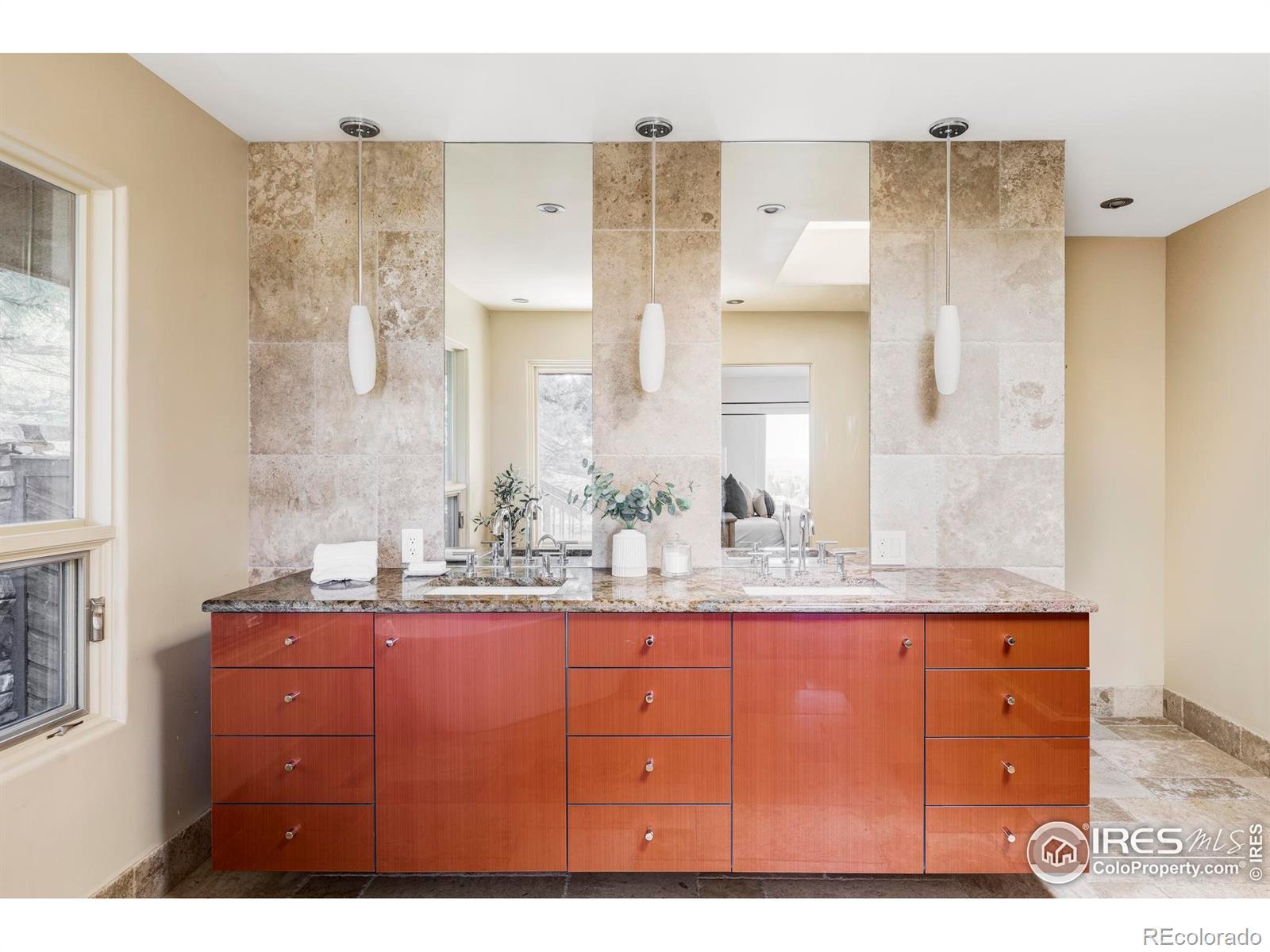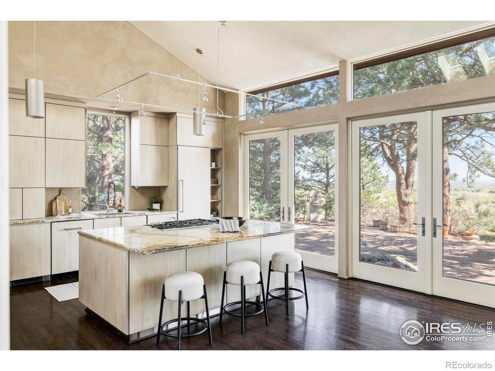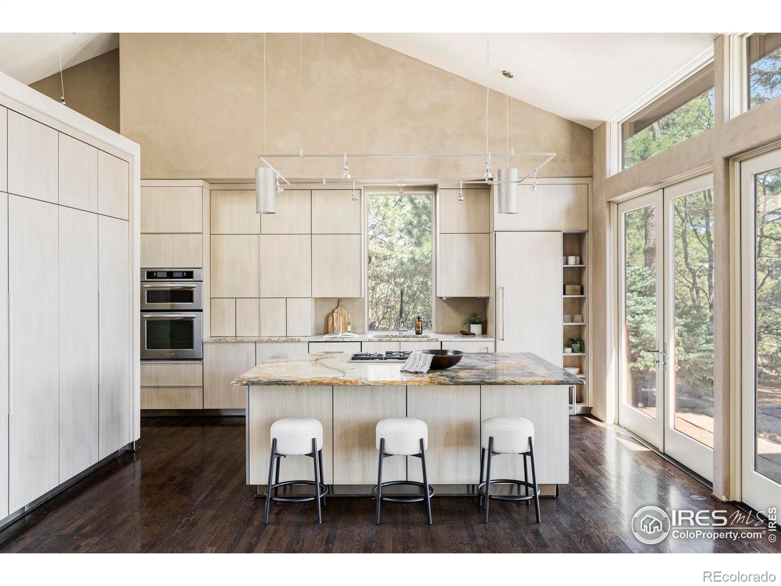 Welcome to a one-of-a-kind retreat in Lake of the Pines, Boulder's only gated lake community. Set on a serene, pine-studded lot with dramatic views of the foothills and flatirons, this architectural gem blends clean modern lines with natural textures and expansive glass for a true indoor-outdoor connection. Step through the custom-crafted front door and into the main living area, where vaulted ceilings and floor-to-ceiling windows frame a breathtaking panorama. A spacious living room flows into the open-concept family room with a gas fireplace-anchoring the heart of the home in warmth and light. Designed for both beauty and function, the kitchen features sleek built-ins, a paneled refrigerator that blends seamlessly with the cabinetry, high-end appliances, and a striking stone island with bar seating. The kitchen and adjacent formal dining area opens to the generous stone patio through two sets of double doors-ideal for entertaining or quiet evenings surrounded by nature. The home's private living spaces are located on the main level, including a peaceful primary suite with tranquil views, a spa-like bath, and walk-in closet. Two additional bedrooms share a well-appointed bathroom. An office-which can also serve as a fourth bedroom-along with the mudroom, laundry room and three-quarter bath complete the main level and connect to the oversized 4-car garage, perfect for storing gear for every season of adventure. The lower level features a spacious recreation room, a powder room, and a storage closet, offering even more flexibility for work, play, or entertaining. Residents of Lake of the Pines enjoy private access to Allens Lake for kayaking, paddleboarding, boating, swimming, and fishing, as well as a sandy beach, built in grills, kid's play area and the security of a gated community with on-site caretaker. This is lake life, redefined-just minutes from downtown Boulder.