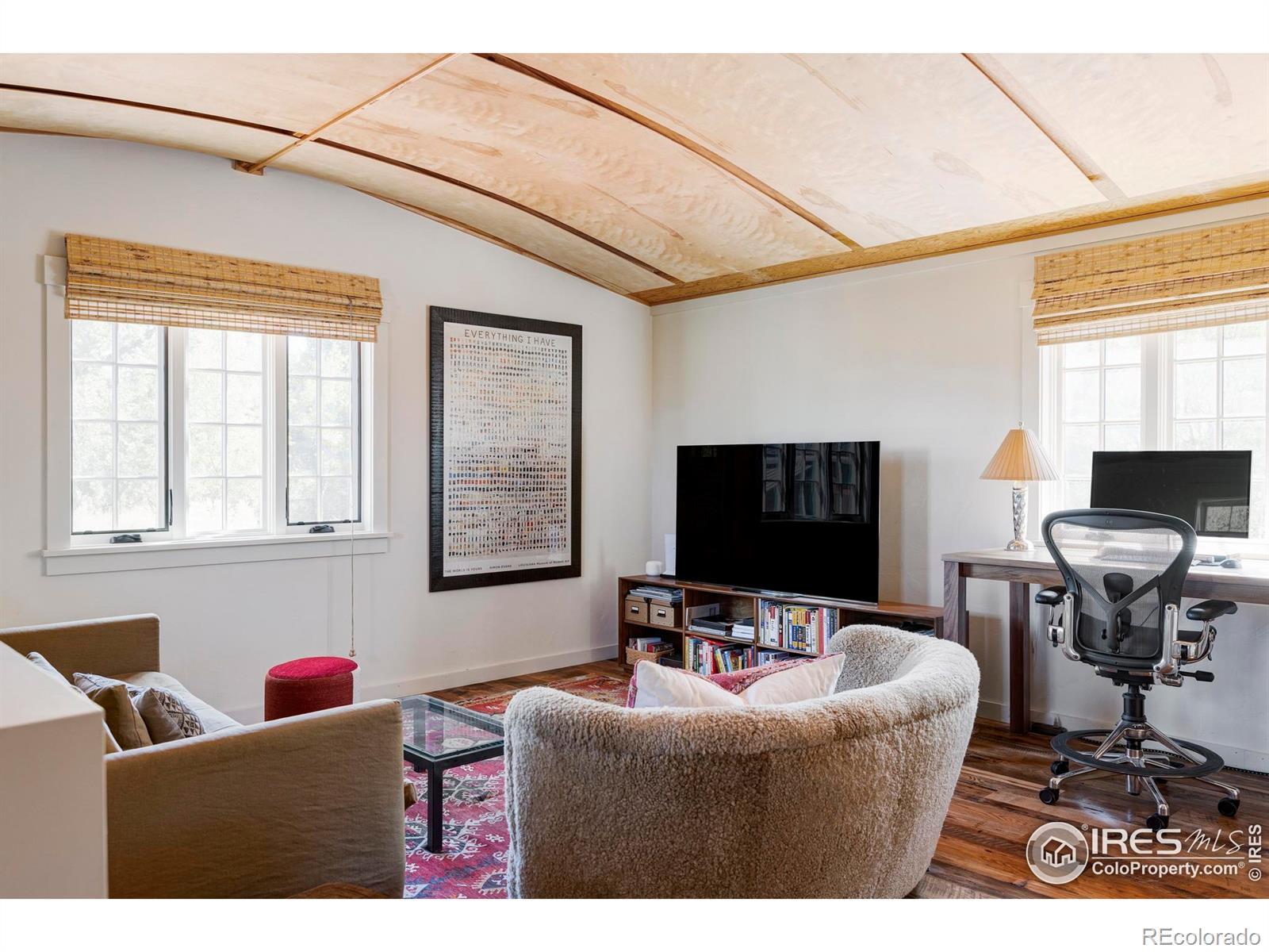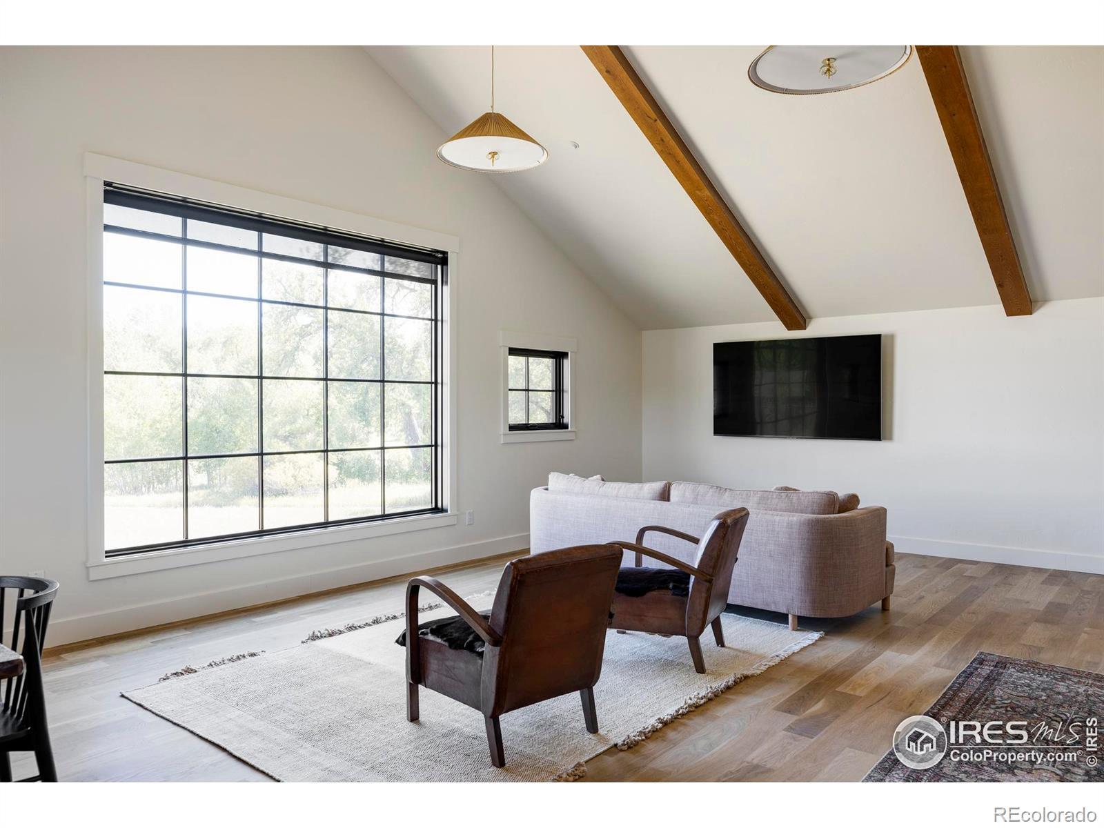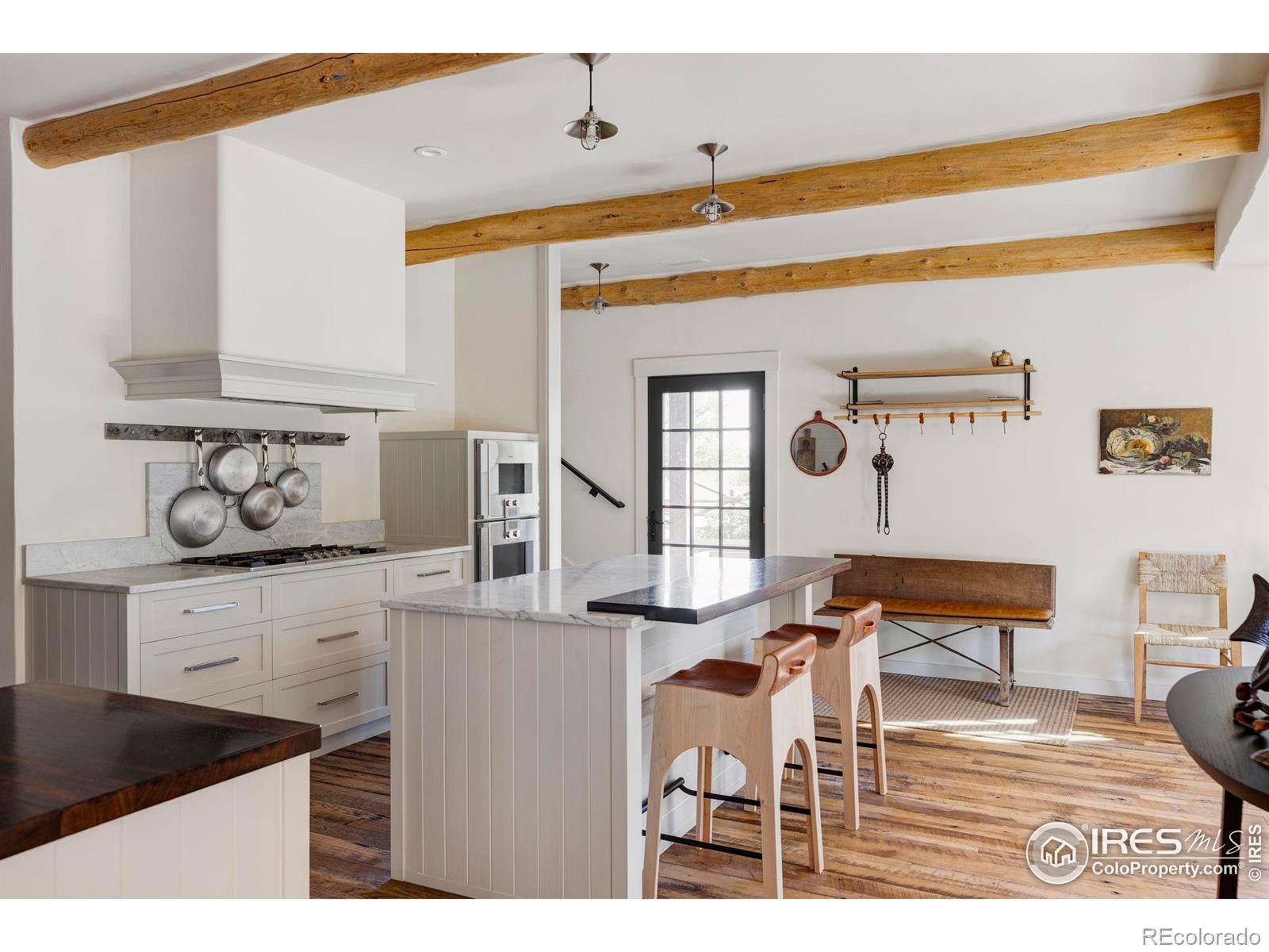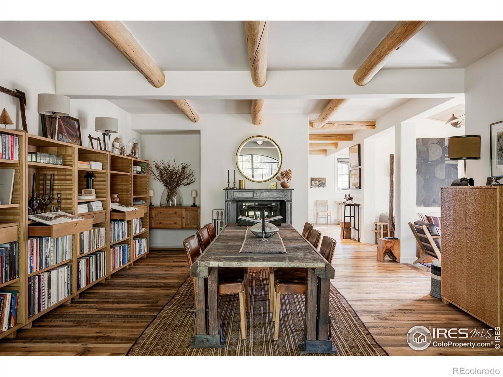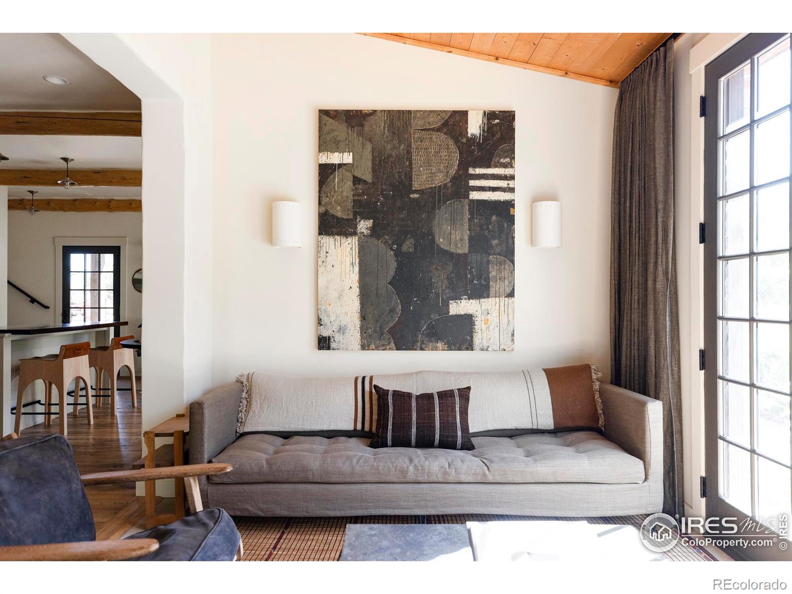 Where the foothills meet the plains, this 9.13-acre estate offers natural beauty, timeless design, and sustainable living. Backing to Rabbit Mountain Open Space and hundreds of acres of protected land, it provides sweeping views, abundant wildlife, and privacy just 10 minutes from Longmont and 30 from Boulder. At its heart is a Provence-inspired farmhouse, remodeled by a European antiques dealer to blend Old World craftsmanship with modern comfort. Hand-carved Catalan doors, a French arched iron window, reclaimed oak floors, and original iron hardware create authenticity and warmth. Designer lighting and oversized windows fill each space with light, while a wall of glass along the southern fa ade frames the outdoors. The main level features a sunlit dining room with wood-burning fireplace, a cozy living area, and a bright corner office. The chef's kitchen boasts marble and wood countertops, open shelving, and upscale appliances including a vented Gaggenau range, Gaggenau wall ovens, Thermador refrigerator, Sub Zero drawers, and wine fridge. A pantry, scullery, laundry, powder bath, and secondary bedroom suite with en suite bath complete this level. Upstairs, a vaulted family room leads to the private primary suite, where Longs Peak views frame a serene retreat with ample closets and a spa bathroom with soaking tub, bench shower, and double vanity. Established gardens overflow with roses, peonies, hydrangeas, irises, and fruit plantings. A fenced garden with raised beds and shed leads to a cottonwood grove, two seasonal ponds, and the Little Thompson River, home to abundant wildlife. A newly built 3,600-sq-ft multi-use structure offers Marvin windows, super-insulated construction, a 19kW solar array, and three-zone heat pumps for near net-zero energy. It includes a vaulted flex space, guest suite with kitchenette, workshop, storage, garage, and shaded patio. 15789 N 83rd Street is a rare Boulder County opportunity where design, ecology, and lifestyle unite.