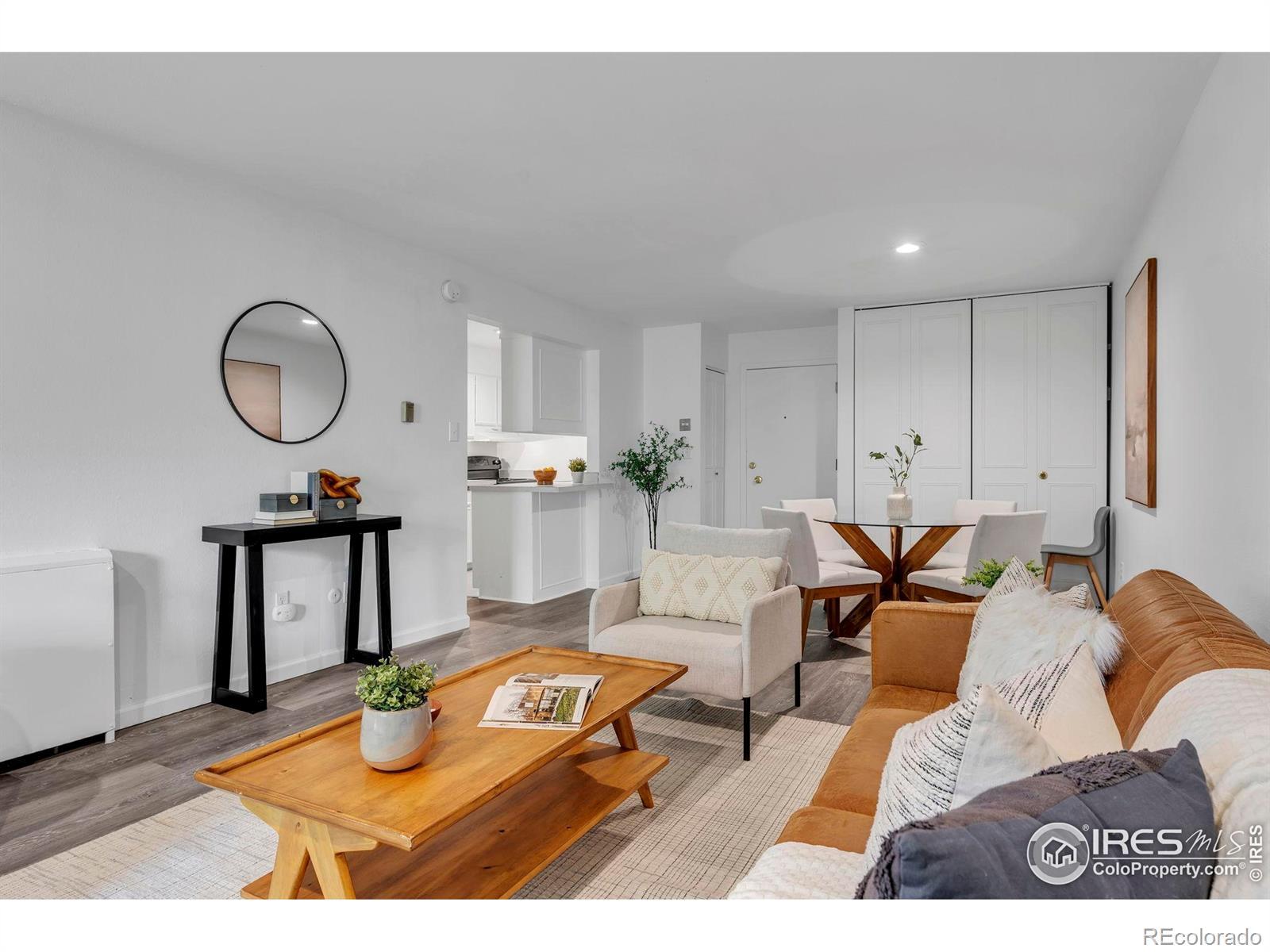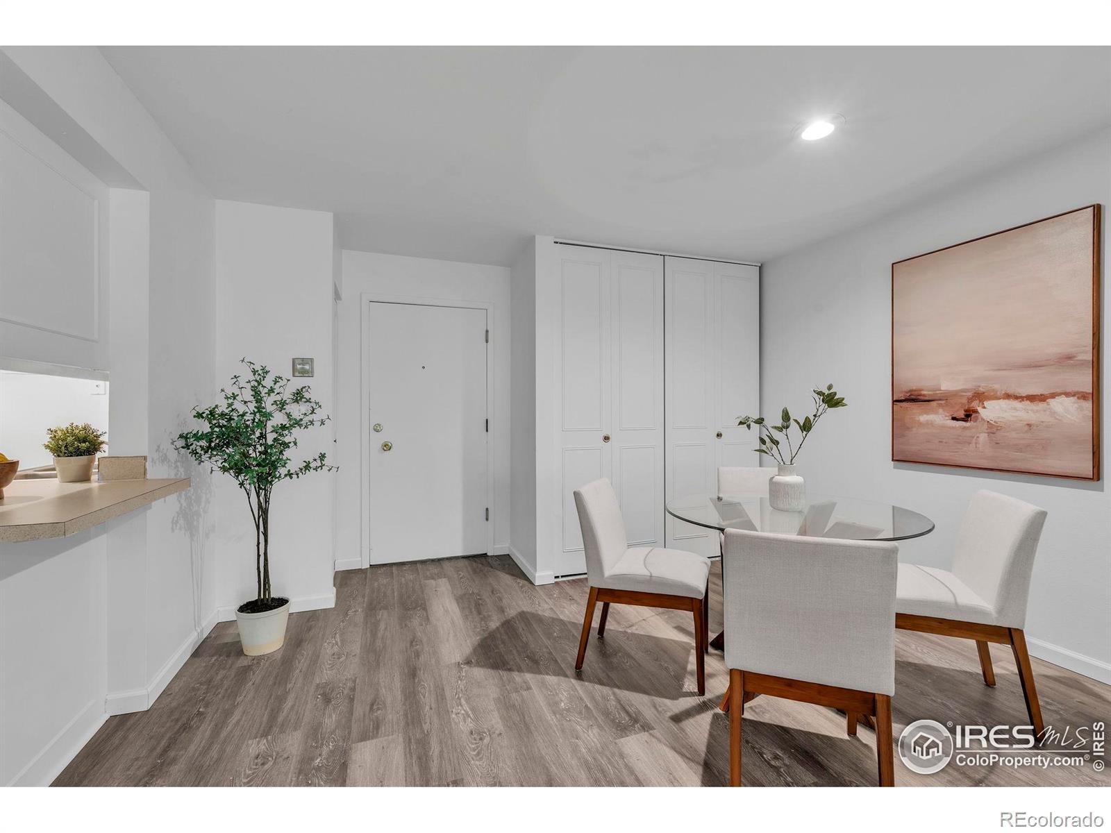This centrally located top floor, ranch style 1 bed, 1 bath condo has been beautifully refreshed with all new interior paint, brand new carpeting, stylish LVT flooring. The open-concept living and dining areas create a spacious, welcoming atmosphere perfect for relaxing or entertaining. Step outside to your lovely covered balcony with peek-a-boo mountain views -- ideal for relaxing. You'll love the unbeatable location, just minutes from the University of Colorado, Pearl Street and the 29th Street Mall. And easy walk to endless dining, shopping and recreation options. Amenities include a secure building, elevator, pool, hot tub, sauna, storage locker, trash/water/sewer, plus hot water, heating and cooling included in HOA fee. Above it all, this 4th floor unit has easy elevator access and no upstairs neighbors. Whether you're looking for a first home, student rental, a lock-and-leave lifestyle, or an investment property, this move-in-ready condo offers exceptional value in a prime location.