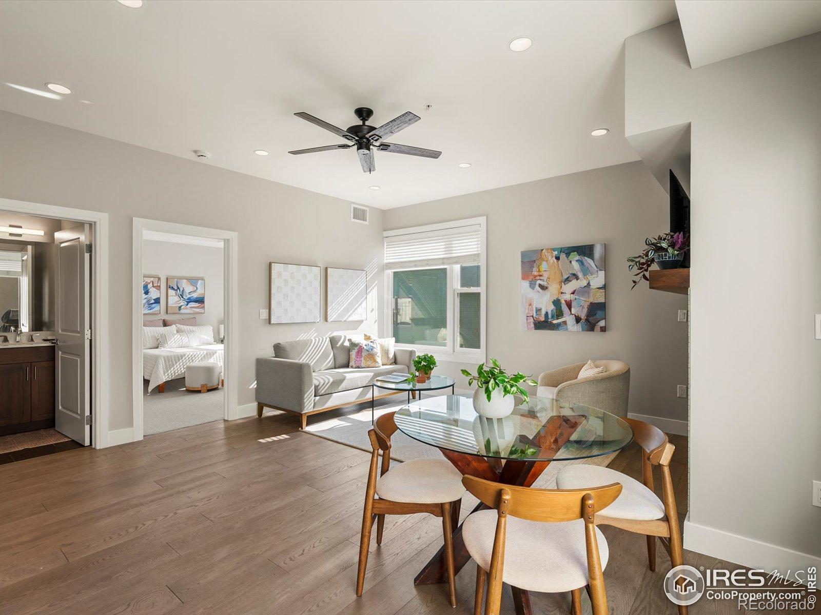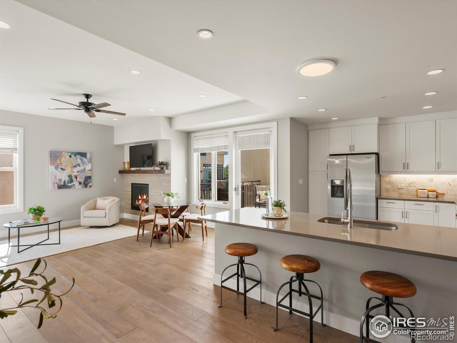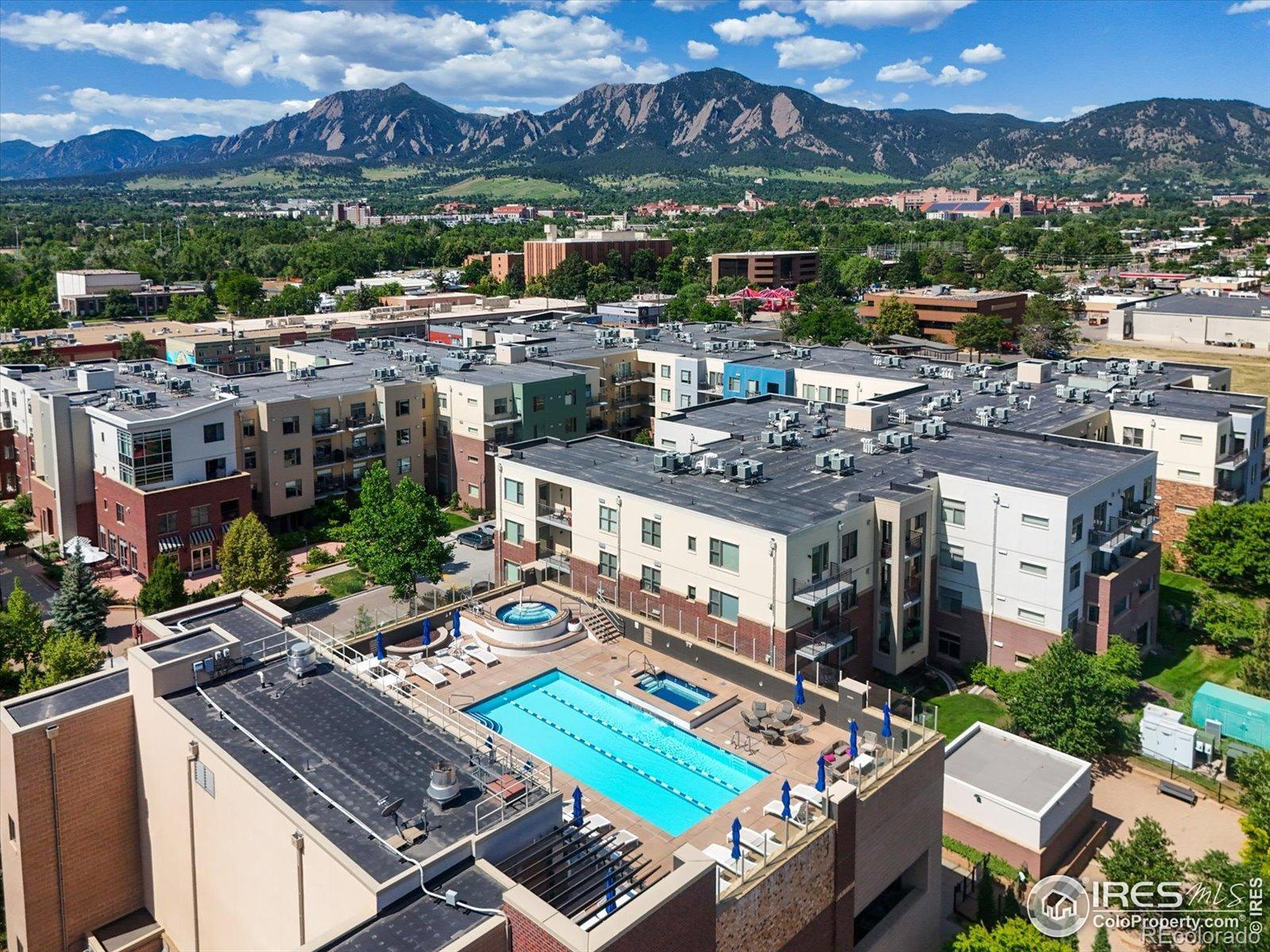 Beautifully updated and sun-filled unit at the Peloton, on the 4th floor with nearly 1000 SF and a large deck. Wood floors throughout the main living area and high end wool carpet in the bedroom. Spacious kitchen with stainless appliances, soft close cabinets and quartz countertops. Bedroom is big enough for a king size bed, dual nightstands and a desk without feeling crowded. Huge walk-in closet and plenty of additional storage in the laundry/utility room. Bathroom has dual sinks and a tub/shower with glass doors. Enjoy morning coffee on the spacious balcony that feels very private, set back from Arapahoe with great sun. Unit has south and east exposures making it light and bright. The Peloton has so much to offer with secure underground parking, a year round heated rooftop pool, state of the art gym, co-working space, movie theater and rec area. Close to Google, shops, restaurants, trails, and everywhere you want to be!