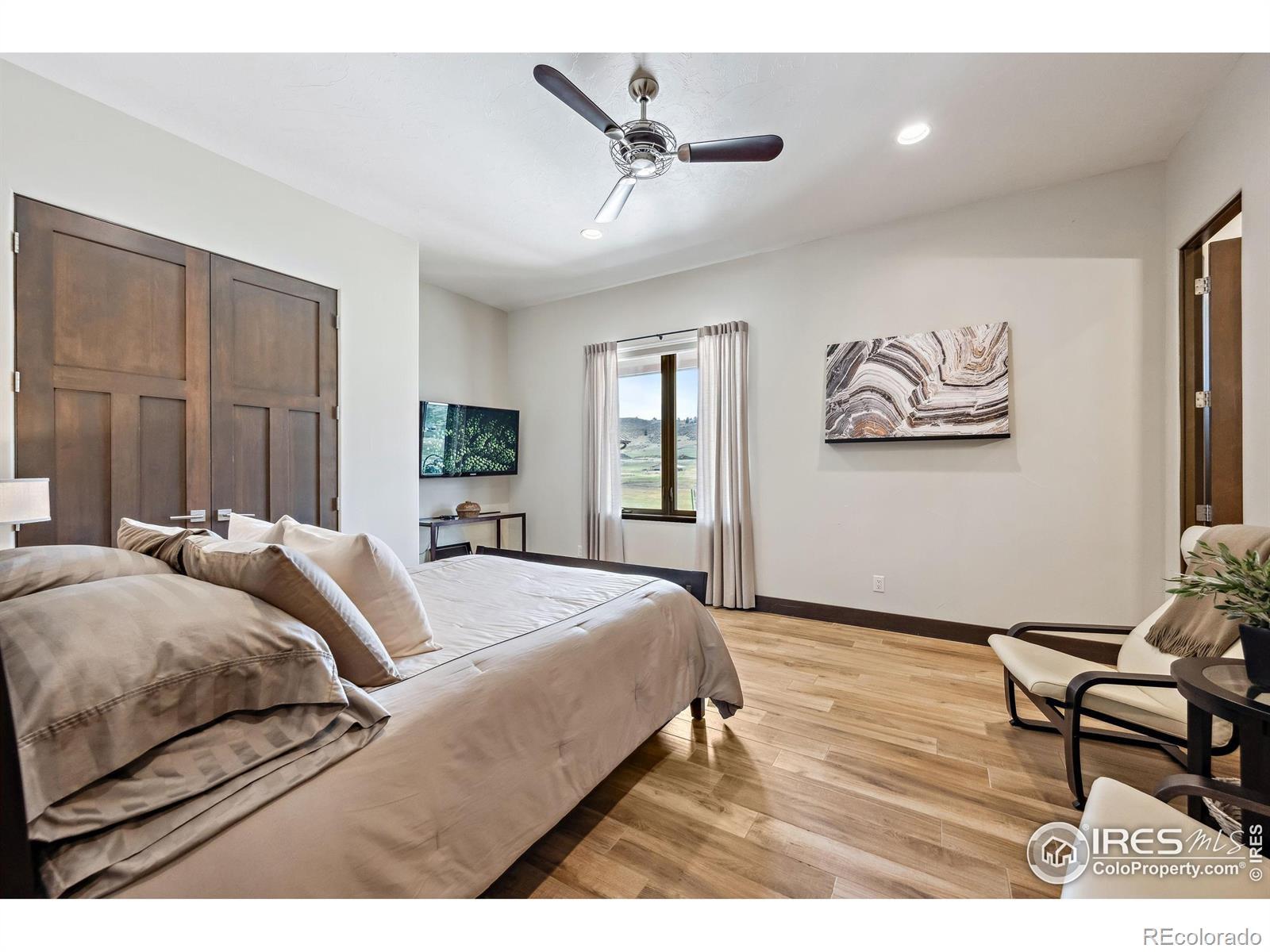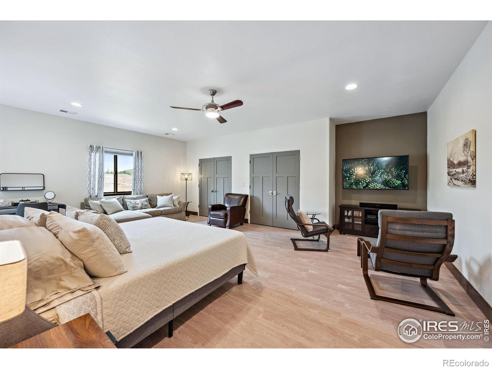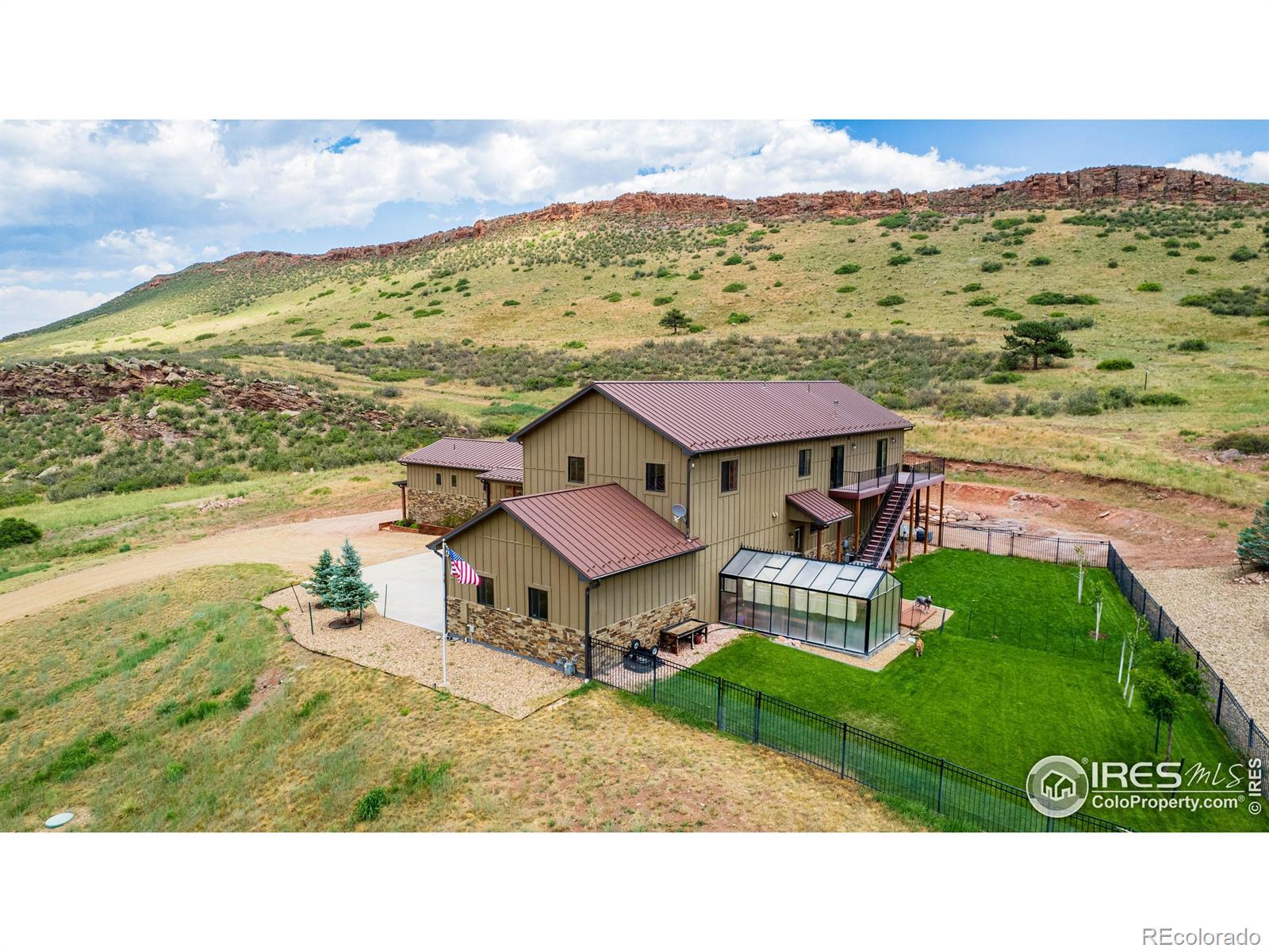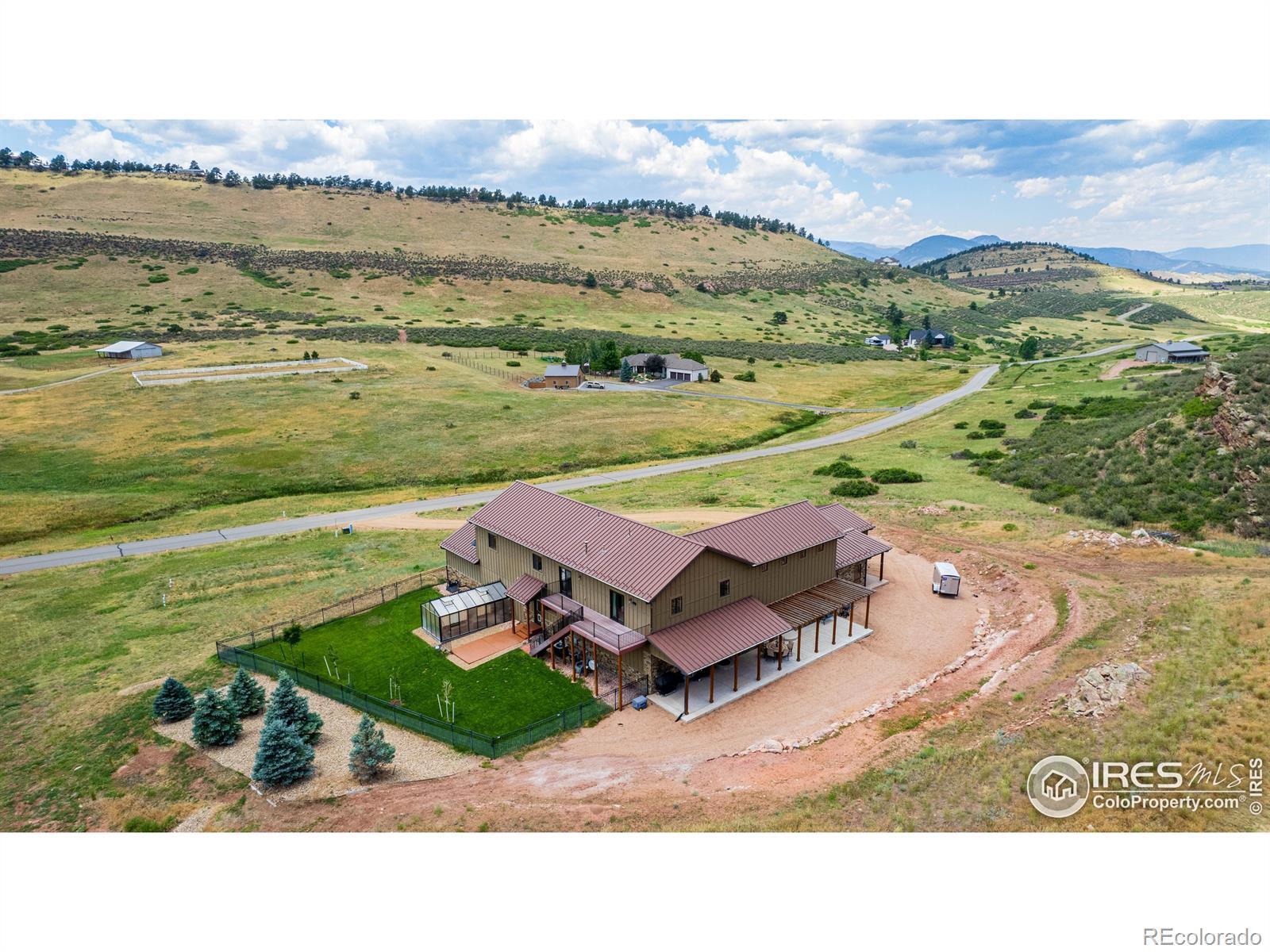 Located in the sought-after gated community of Sedona Hills, this property offers miles of hiking trails, sweeping mountain views, and the privacy you want-just 10 minutes from Carter Lake and 15 minutes from Loveland or Berthoud. 4400 Sedona Hills Drive is a custom-built home designed for comfort and convenience, with quality at the forefront. Set on 35 acres, the home provides more than 3,500 square feet of main-floor living. The entry opens to a bright great room with a 27-foot ceiling and a large linear gas fireplace. The chef's kitchen includes a complete set of Bosch professional appliances, rift-cut oak cabinetry, Cambria quartz counters, and a spacious walk-in pantry. The main-level primary suite features a spa-inspired bathroom, a large shared walk-in closet, heated floors, and a private patio. A secondary suite with an en suite bath is also on the main level. Upstairs adds 2,000 square feet of living space, including a separate apartment with its own kitchen, bathroom, and laundry. Every upstairs room takes in wide mountain views and has ample space. A fenced and landscaped backyard surrounds the attached 20-foot greenhouse, which has well water irrigation and an automatic air circulation system. Open zoning allows for horses, target practice, and more. Interior features include porcelain tile and cork plank flooring, Toto bidet toilets, Douglas Fir trim, Milgard fiberglass windows, and multi-zone climate control. Exterior features include a high-production well plus Little Thompson water service, 300-amp electric service, concrete board-and-batten siding for wind and fire resistance, and a metal roof. For the complete list of technical specifications, safety elements, and quality upgrades, contact your agent or arrange an in-person visit.