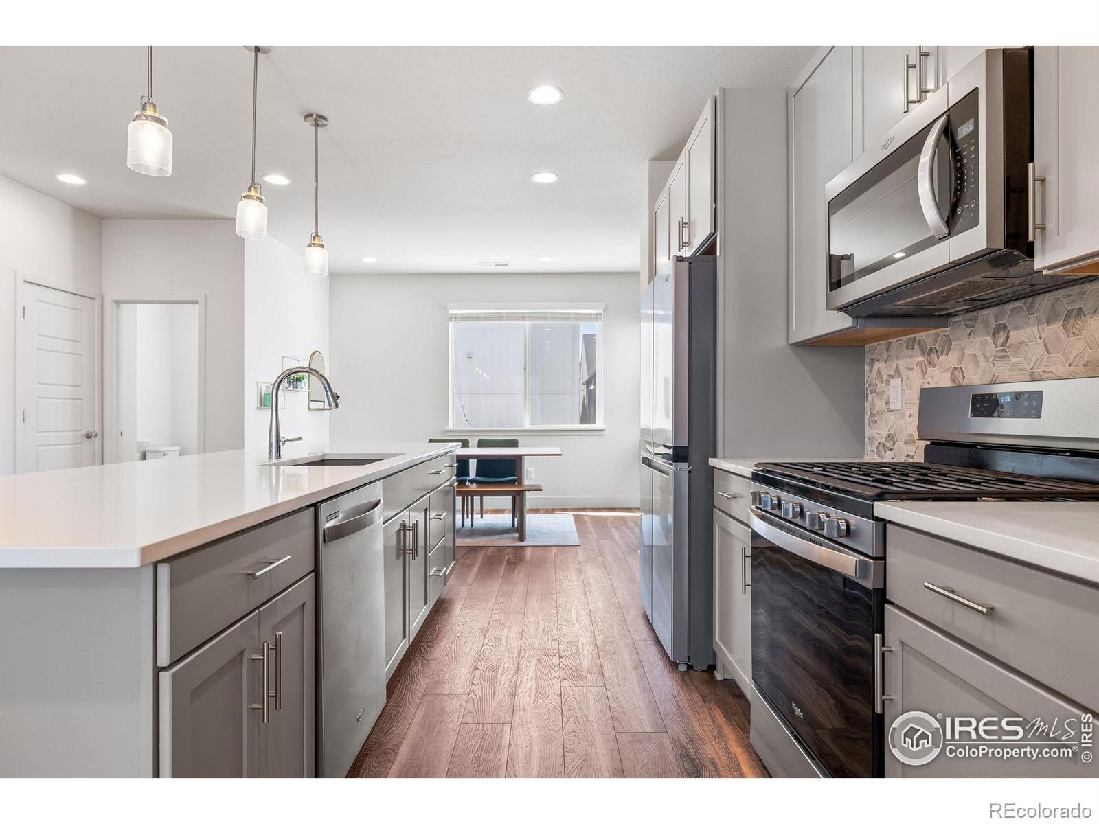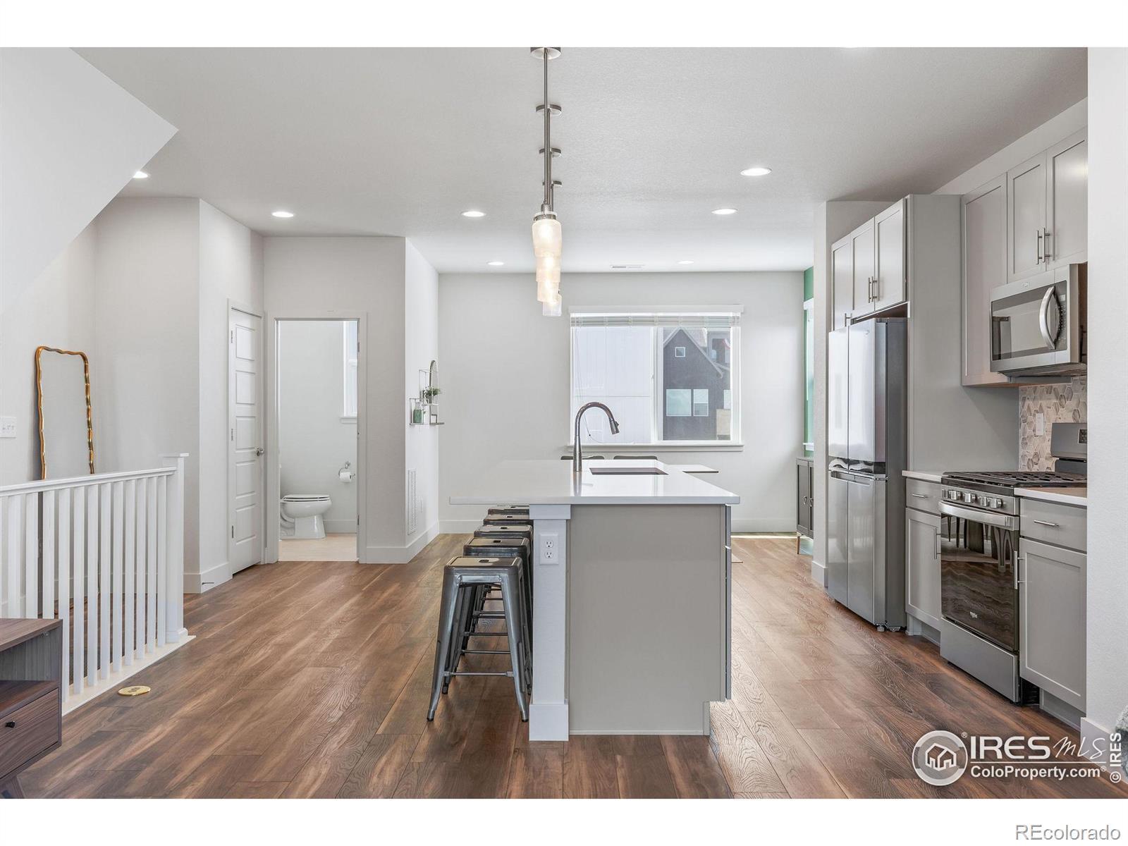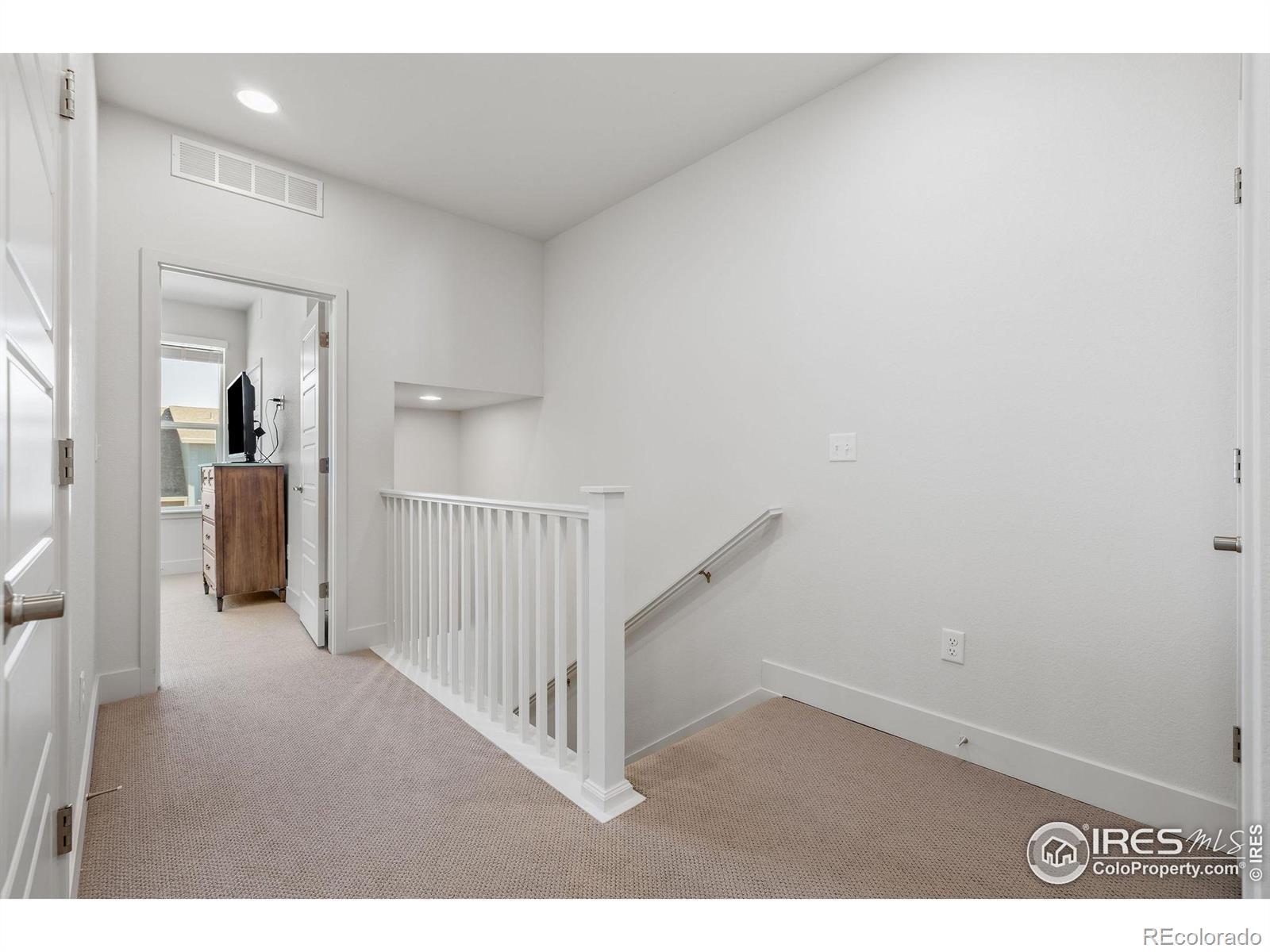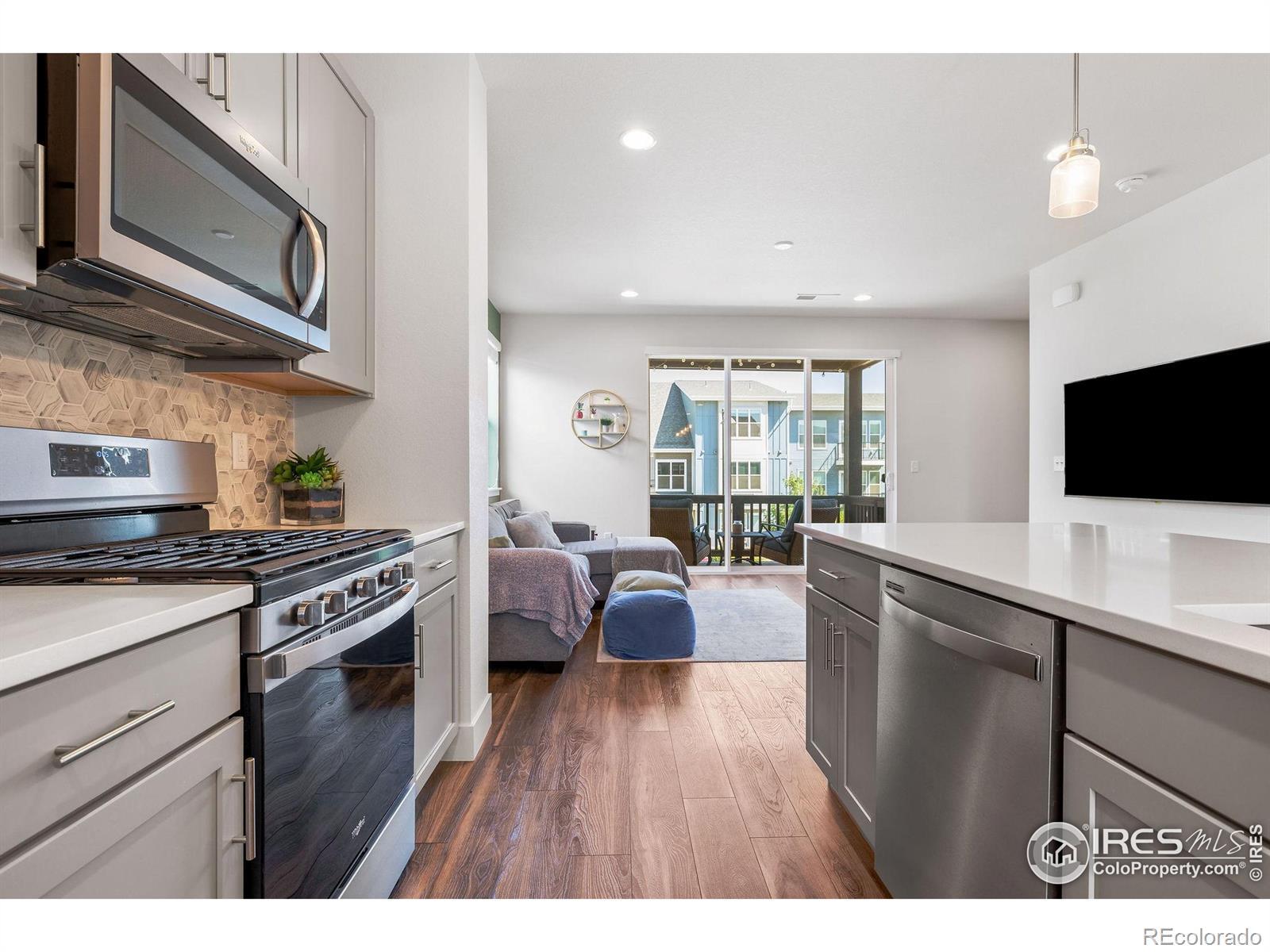 Welcome to exceptional living in the vibrant Baseline community of Broomfield. Built in 2023, this end-unit residence offers an abundance of natural light with sought-after Southern, Western, and Northern exposures, creating a bright and airy atmosphere throughout. This home is as smart and eco-conscious as it is stylish and comfortable, with LEED-certified construction, and energy efficient solar panels that will transfer to the new owner at closing, reducing your carbon footprint on day one!Step inside to discover a thoughtfully designed floor plan that seamlessly blends style and function. The main level greets you with a versatile flex space-- the perfect office space, studio, or home gym with its own adjacent bath. A spacious open layout allows the kitchen, dining, and living areas to flow effortlessly together. The gourmet kitchen comes complete with a large island, stainless steel gas appliances, and premium finishes. The adjacent living room provides a relaxing space with access to a serene balcony, ideal for enjoying a cup of coffee or a breath of fresh Colorado air. The upper level is dedicated to rest and relaxation, featuring two generously sized bedrooms, each with its own full en-suite bathroom for ultimate privacy and convenience. An upper-level laundry room, conveniently located between the bedrooms, adds to the home's practicality. Even more convenience comes from the home's attached two-car garage, complete with 220-volt power capabilities- the perfect additional storage, and space for tools or even an EV charger.This prime location puts you within easy reach of a variety of shops, grocery stores, and restaurants. Popular destinations like Costco, Topgolf, and Home Depot are minutes away, and you'll enjoy effortless access to both Denver and Boulder. Experience the perfect balance of urban energy and outdoor serenity in a community that has it all. Don't miss the opportunity to maximize the essence of modern Colorado living!