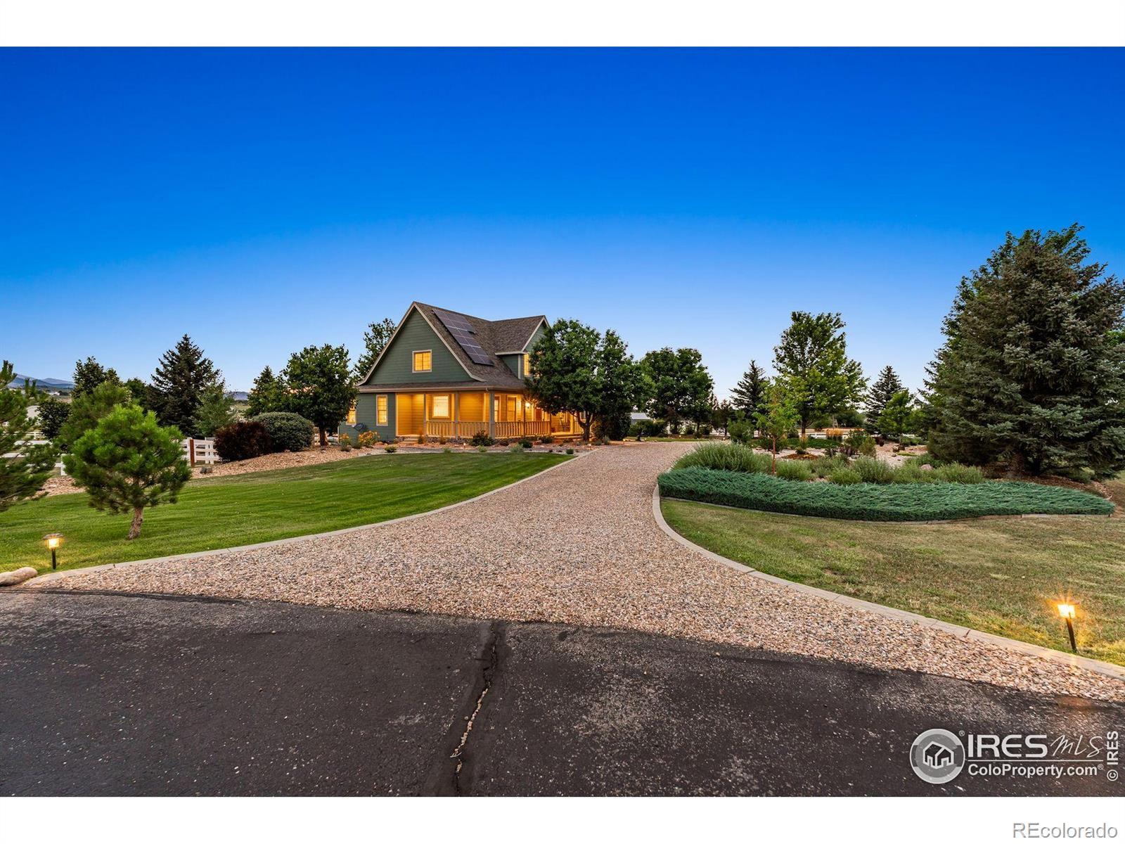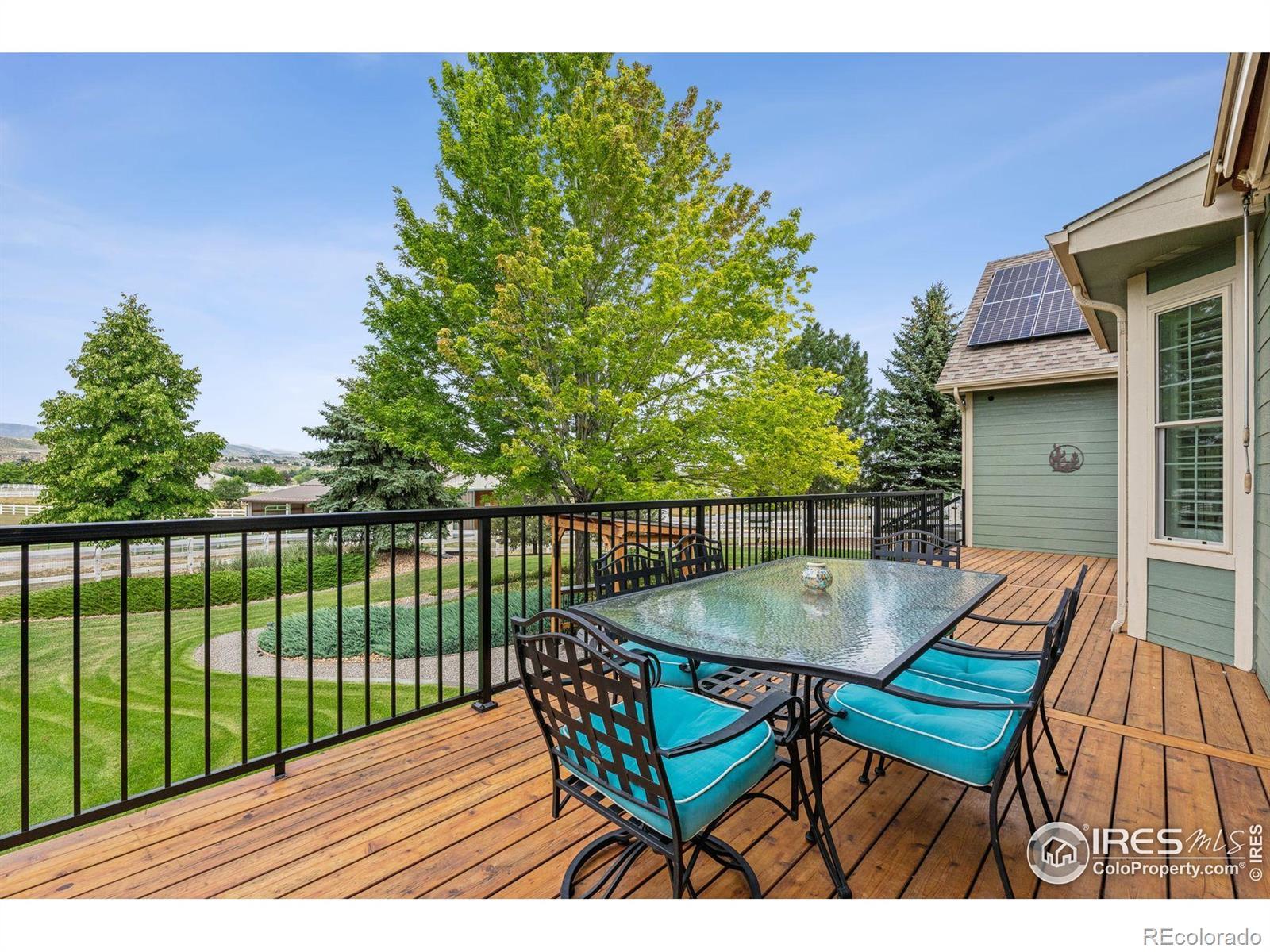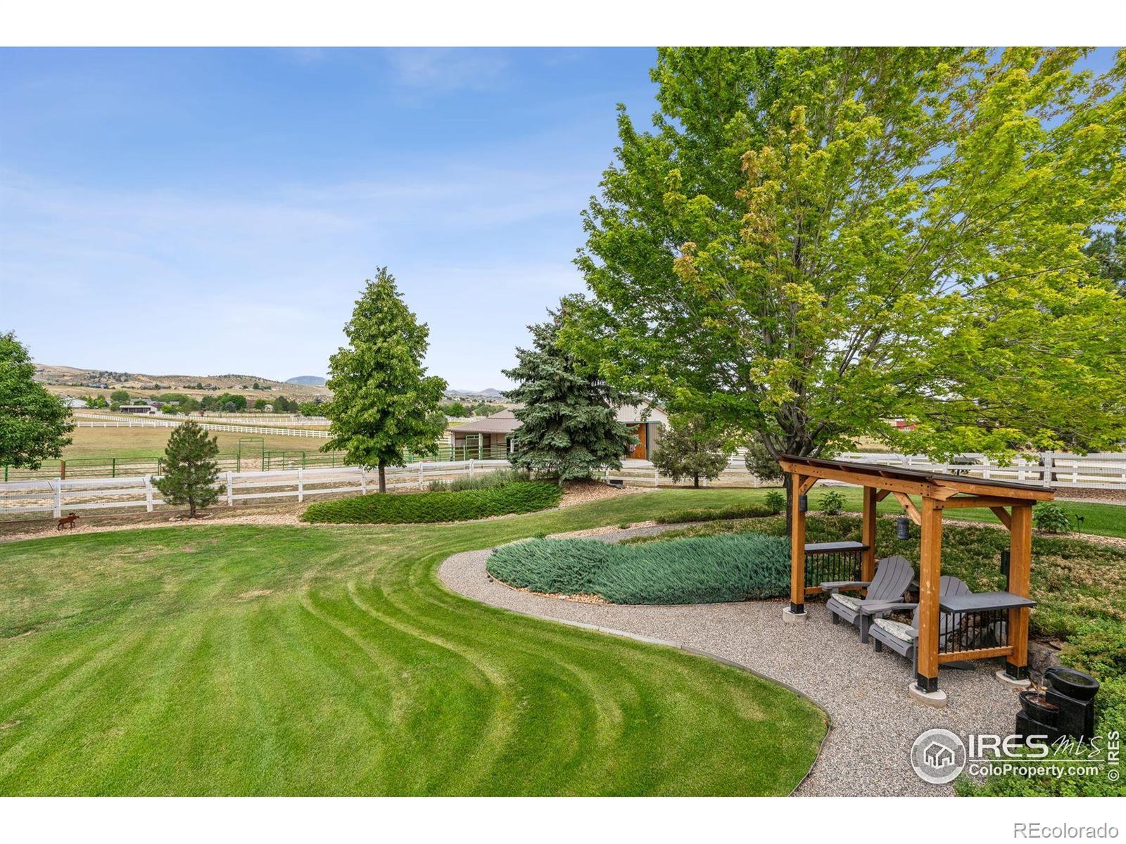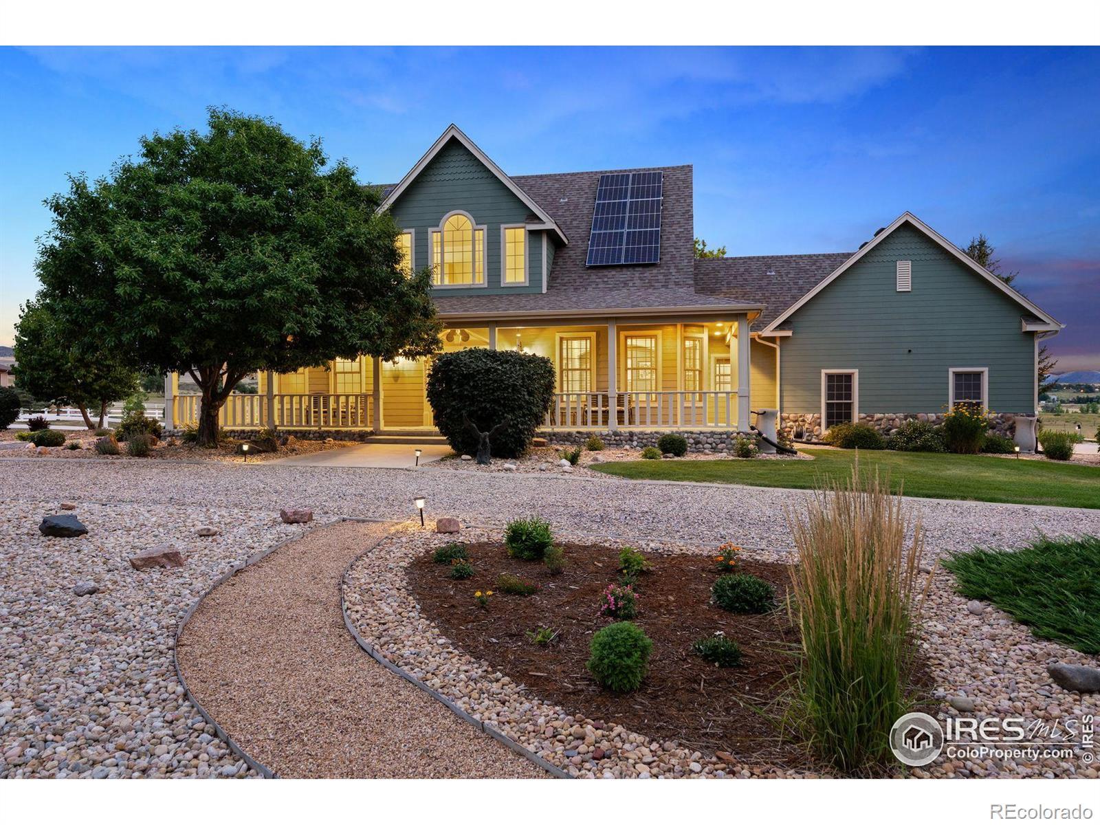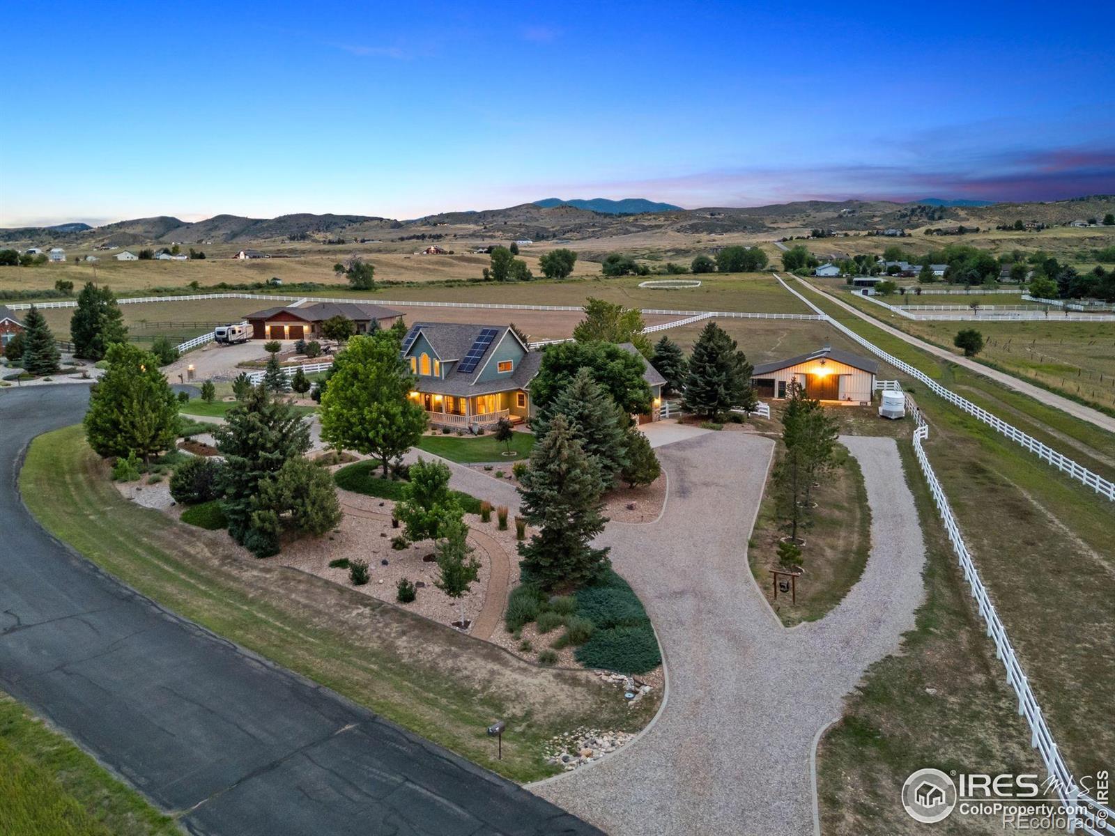 Welcome to your dream retreat on 3.53 pristine acres in the coveted Falcon Pointe community-where luxury living meets equestrian elegance. This beautifully updated 4-bed, 4-bath home showcases custom finishes throughout, including rich hardwood floors on both the main and upper levels, vaulted ceilings, and a spacious primary suite with spa-like comfort. A dedicated study on the main floor offers the perfect work-from-home setup, while the upper level features two generously sized bedrooms and a full bath.The garden-level basement is flooded with natural light and designed for entertaining, complete with a wet bar, expansive rec room, guest bedroom, and abundant storage. Step outside to enjoy lush landscaping, a private front porch, and a large back deck with a powered awning-ideal for soaking in panoramic views of the mountains and foothills.A fully paid-for solar system delivers energy efficiency and long-term savings, making this home as smart as it is stunning.Equestrian enthusiasts will love the newer barn with two horse stalls, tack room, hay storage, and a fully fenced pasture. And with the HOA's private riding arena just steps away, this property lives like 20 acres of open space and opportunity.Location perks? You're just 5 minutes from TPC Colorado at Heron Lakes, 10 minutes to downtown Loveland, and only 35 minutes from Boulder. Plus, you're just minutes from several lakes and scenic trails, offering endless opportunities for hiking, biking, fishing, and paddleboarding.A rare blend of comfort, functionality, and Colorado beauty-this is more than a home, it's a lifestyle.