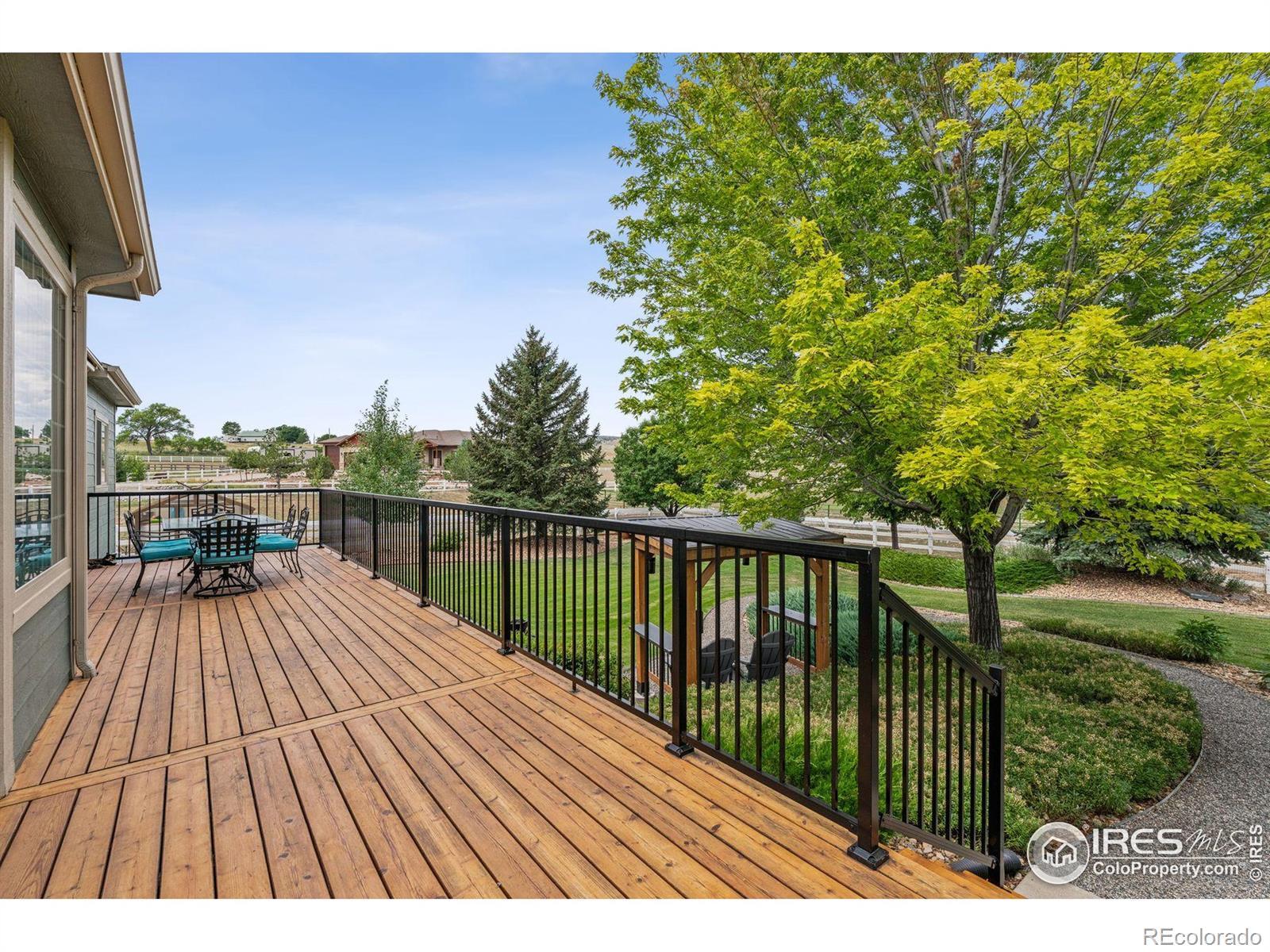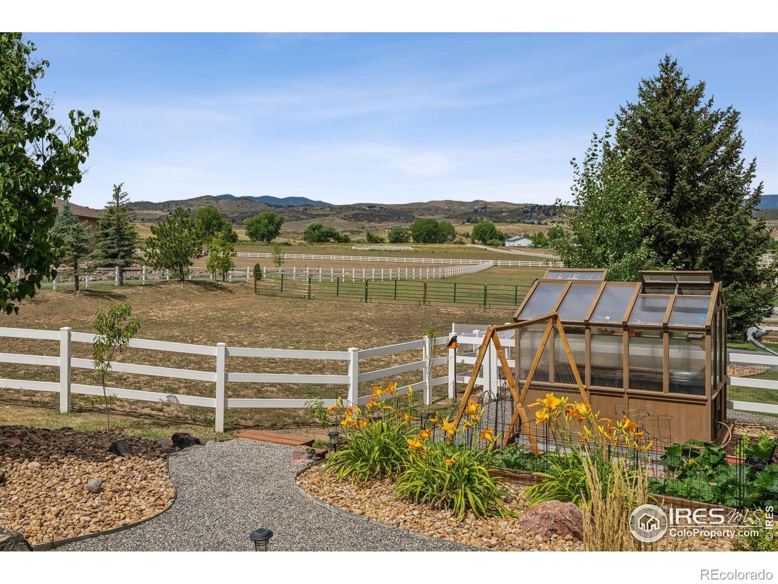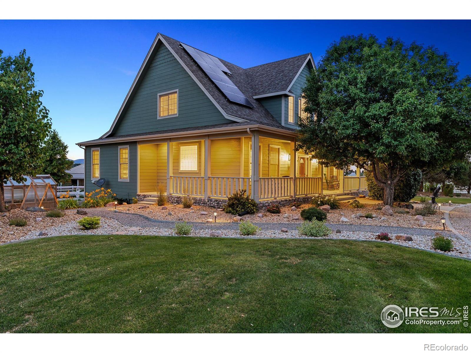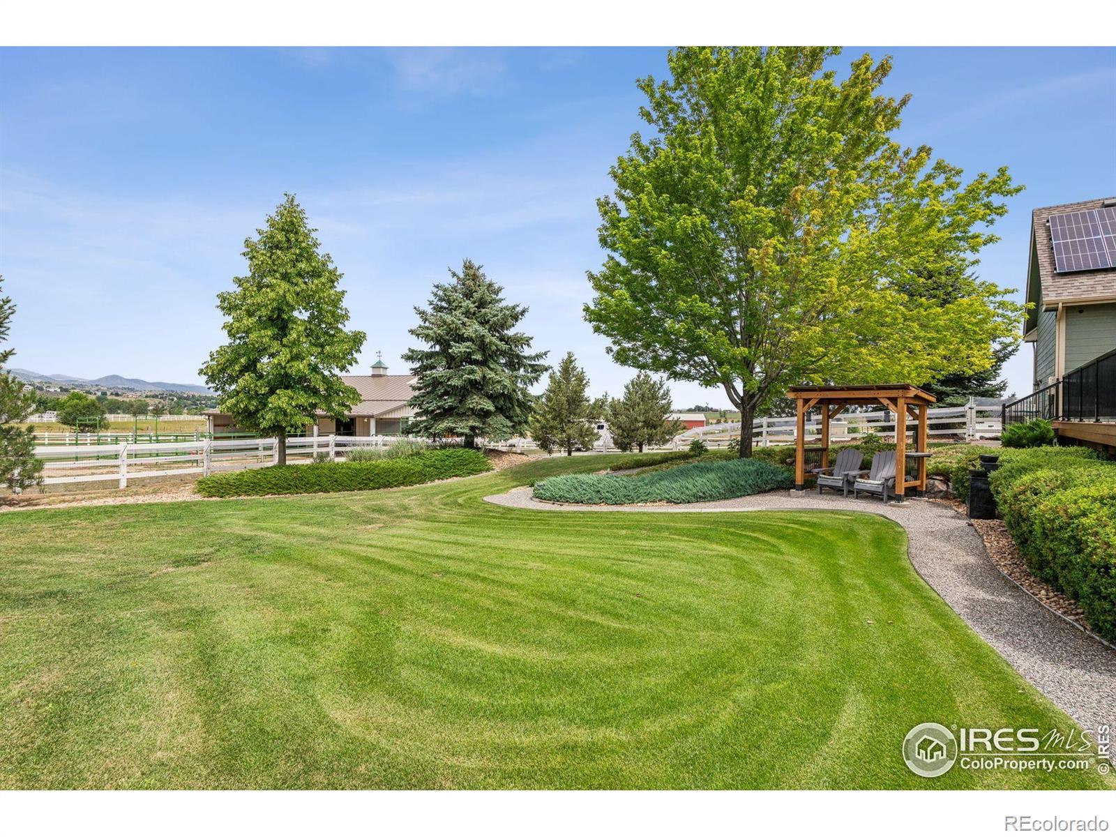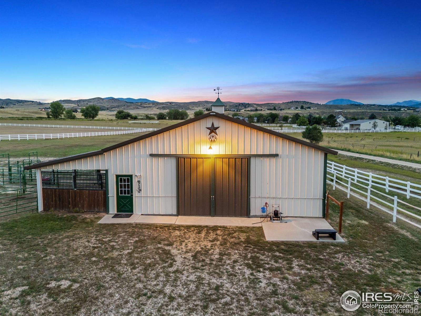 Welcome to your dream retreat on 3.53 pristine acres in the coveted Falcon Pointe community-where luxury living meets equestrian elegance. This beautifully updated 4-bed, 4-bath home showcases custom finishes throughout, including rich hardwood floors on both the main and upper levels, vaulted ceilings, and a spacious primary suite with spa-like comfort. A dedicated study on the main floor offers the perfect work-from-home setup, while the upper level features two generously sized bedrooms and a full bath.The garden-level basement is flooded with natural light and designed for entertaining, complete with a wet bar, expansive rec room, guest bedroom, and abundant storage. Step outside to enjoy lush landscaping, a private front porch, and a large back deck with a powered awning-ideal for soaking in panoramic views of the mountains and foothills.A fully paid-for solar system delivers energy efficiency and long-term savings, making this home as smart as it is stunning.Equestrian enthusiasts will love the newer barn with two horse stalls, tack room, hay storage, and a fully fenced pasture. And with the HOA's private riding arena just steps away, this property lives like 20 acres of open space and opportunity.Location perks? You're just 5 minutes from TPC Colorado at Heron Lakes, 10 minutes to downtown Loveland, and only 35 minutes from Boulder. Plus, you're just minutes from several lakes and scenic trails, offering endless opportunities for hiking, biking, fishing, and paddleboarding.A rare blend of comfort, functionality, and Colorado beauty-this is more than a home, it's a lifestyle.