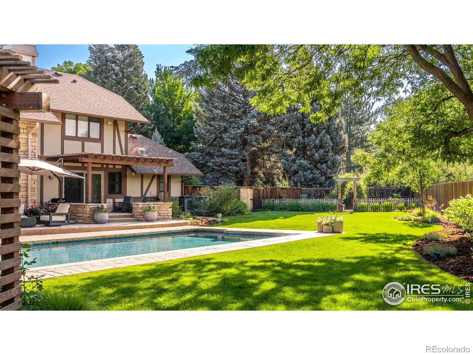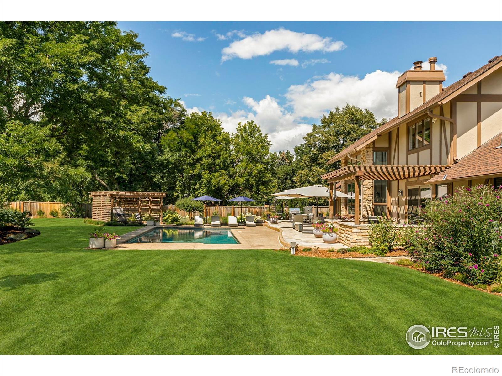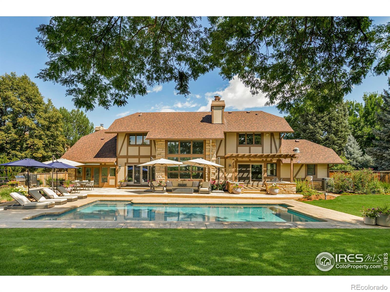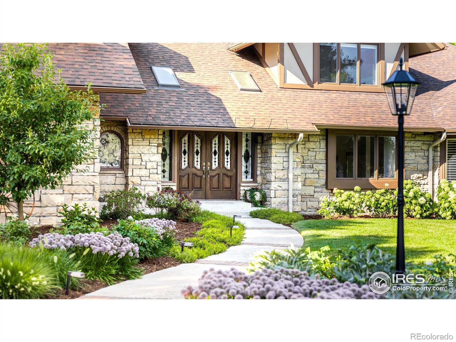 Set on a quiet street in The Reserve at Sombrero Ranch, this Tudor-inspired estate is framed by manicured gardens and timeless curb appeal. Resting on more than a half acre with mature trees, the home blends thoughtful updates and fresh finishes with outdoor spaces that evoke a private resort. Sunlight and serene garden views fill the interiors, creating a lifestyle rarely found in Boulder-elegant, welcoming, and evocative of California living. A double-door stone entry opens to soaring ceilings and light-filled gathering spaces. The family and dining rooms are anchored by a dramatic stone fireplace, while the gourmet kitchen with Wolf and Miele appliances and dual islands connects seamlessly to the backyard. A four-season sunroom with wet bar further extends the living space, opening to an outdoor dining patio. The main-level primary suite opens to a pergola-covered patio with Flatiron views and direct pool access, complemented by a spa-inspired bathroom with dual vanities, soaking tub, steam shower, and custom walk-in closet. Upstairs, the southwest-facing office and a secondary bedroom frame Flatiron views. Two additional bedrooms, including a spacious en suite, are offered along with a well-appointed bathroom. A vaulted bonus wing above the garage provides flexible space for guests or recreation.The backyard is the true showpiece: a sparkling heated saltwater pool surrounded by stone patios, a built-in BBQ and dining area, lounge with outdoor fireplace, and a pergola-covered hot tub. Terraces and winding paths meander through lush gardens of roses, lavender, hydrangea, and a chef's vegetable garden. Designed for privacy and year-round enjoyment, the outdoor spaces invite everything from lively gatherings to peaceful mornings with coffee in the garden, all set against Boulder's stunning mountain backdrop.Residents of The Reserve enjoy a renovated clubhouse, pool, and tennis/pickleball courts, with golf, open space, and Downtown Boulder just minutes away.