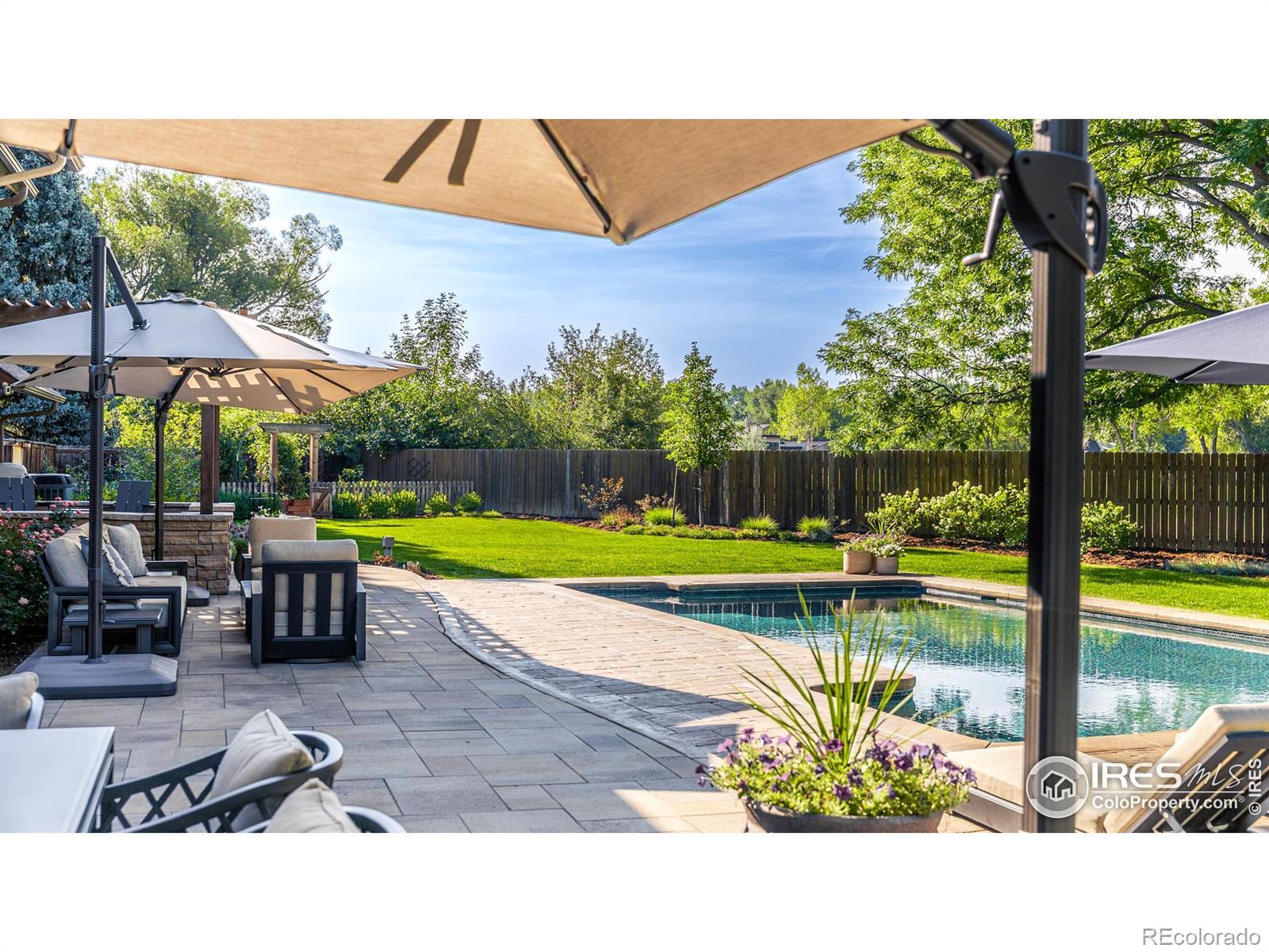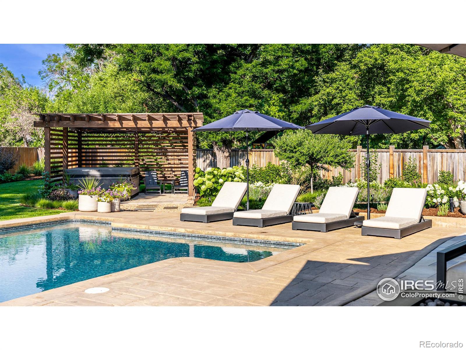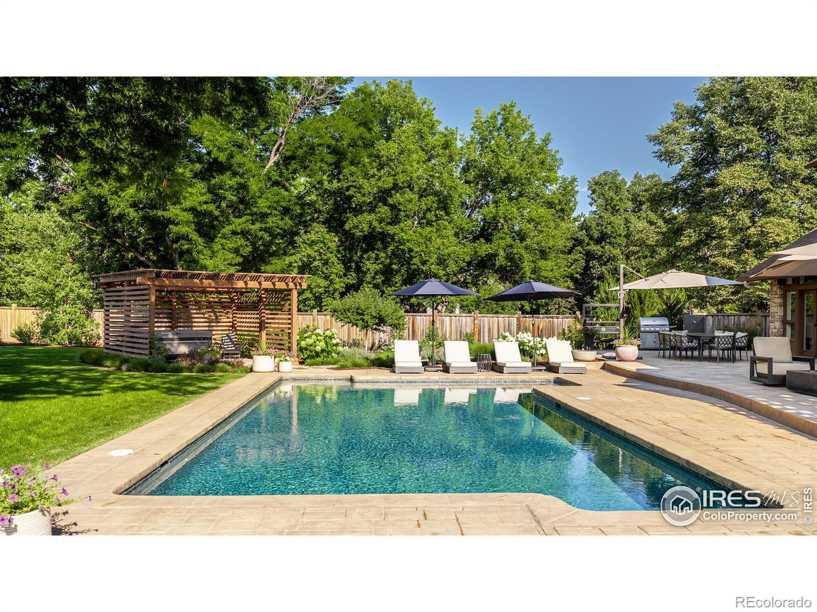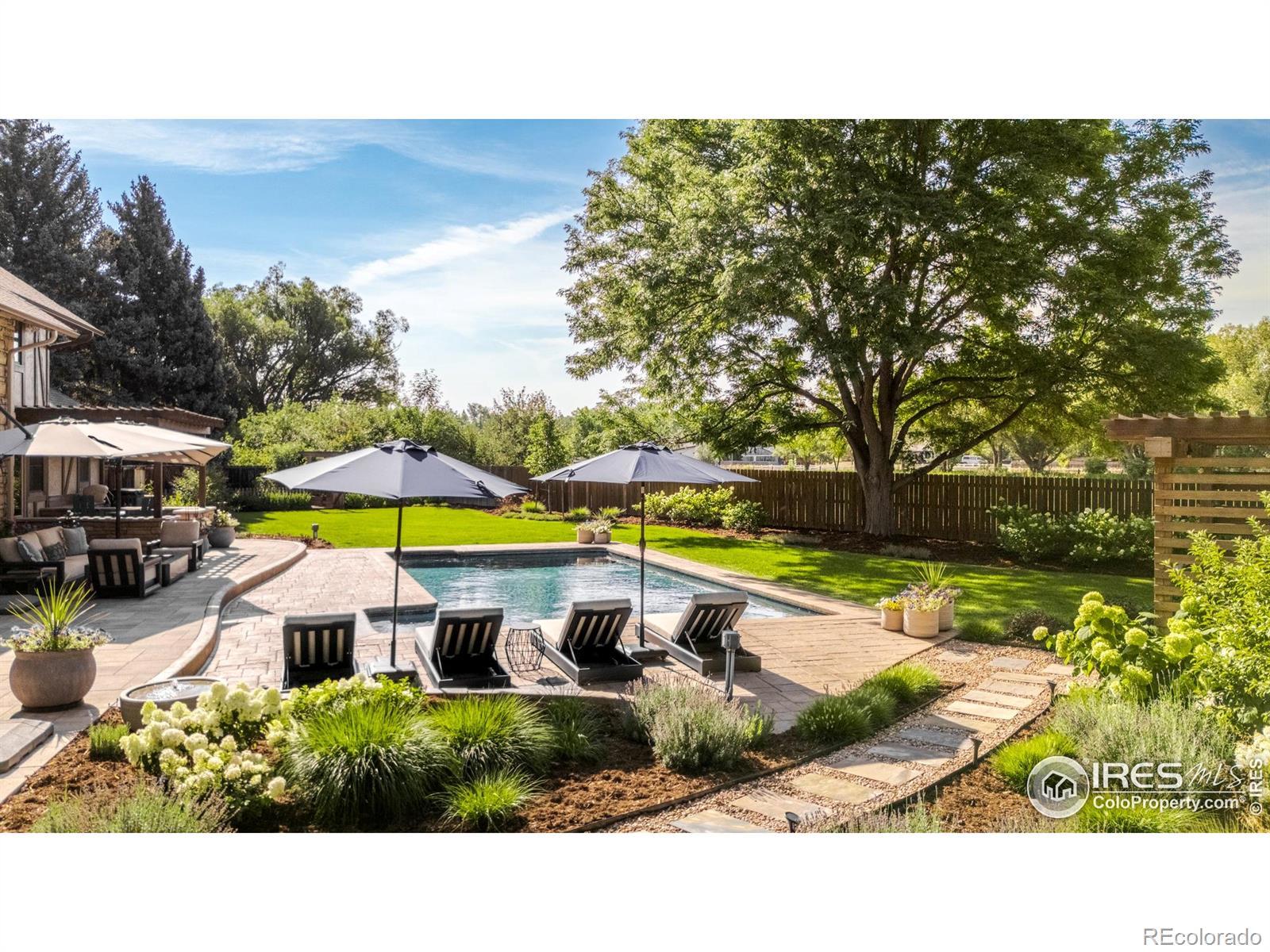 Set on a quiet street in The Reserve at Sombrero Ranch, this Tudor-inspired estate is framed by manicured gardens and timeless curb appeal. Resting on more than a half acre with mature trees, the home blends thoughtful updates and fresh finishes with outdoor spaces that evoke a private resort. Sunlight and serene garden views fill the interiors, creating a lifestyle rarely found in Boulder-elegant, welcoming, and evocative of California living. A double-door stone entry opens to soaring ceilings and light-filled gathering spaces. The family and dining rooms are anchored by a dramatic stone fireplace, while the gourmet kitchen with Wolf and Miele appliances and dual islands connects seamlessly to the backyard. A four-season sunroom with wet bar further extends the living space, opening to an outdoor dining patio. The main-level primary suite opens to a pergola-covered patio with Flatiron views and direct pool access, complemented by a spa-inspired bathroom with dual vanities, soaking tub, steam shower, and custom walk-in closet. Upstairs, the southwest-facing office and a secondary bedroom frame Flatiron views. Two additional bedrooms, including a spacious en suite, are offered along with a well-appointed bathroom. A vaulted bonus wing above the garage provides flexible space for guests or recreation.The backyard is the true showpiece: a sparkling heated saltwater pool surrounded by stone patios, a built-in BBQ and dining area, lounge with outdoor fireplace, and a pergola-covered hot tub. Terraces and winding paths meander through lush gardens of roses, lavender, hydrangea, and a chef's vegetable garden. Designed for privacy and year-round enjoyment, the outdoor spaces invite everything from lively gatherings to peaceful mornings with coffee in the garden, all set against Boulder's stunning mountain backdrop.Residents of The Reserve enjoy a renovated clubhouse, pool, and tennis/pickleball courts, with golf, open space, and Downtown Boulder just minutes away.