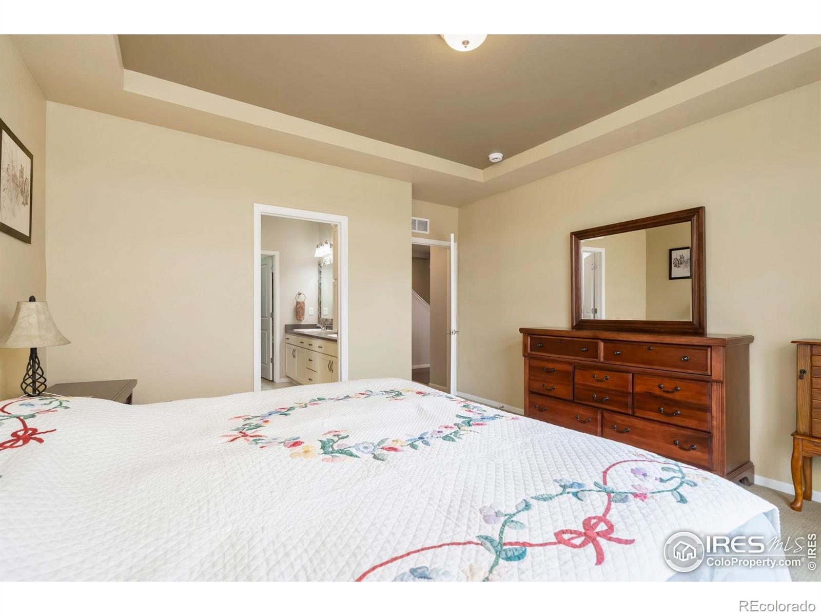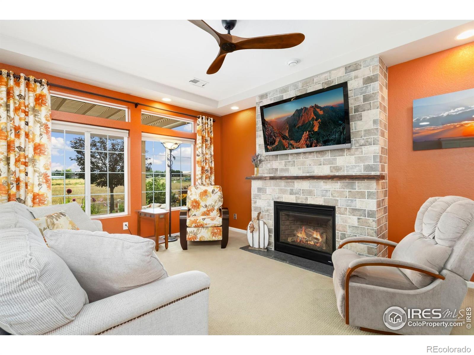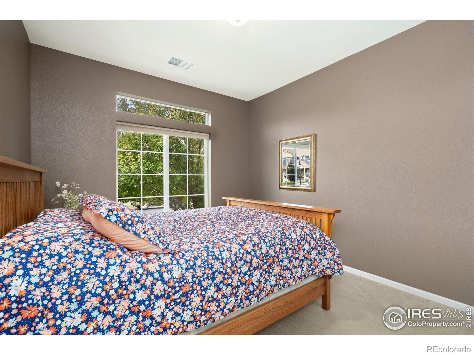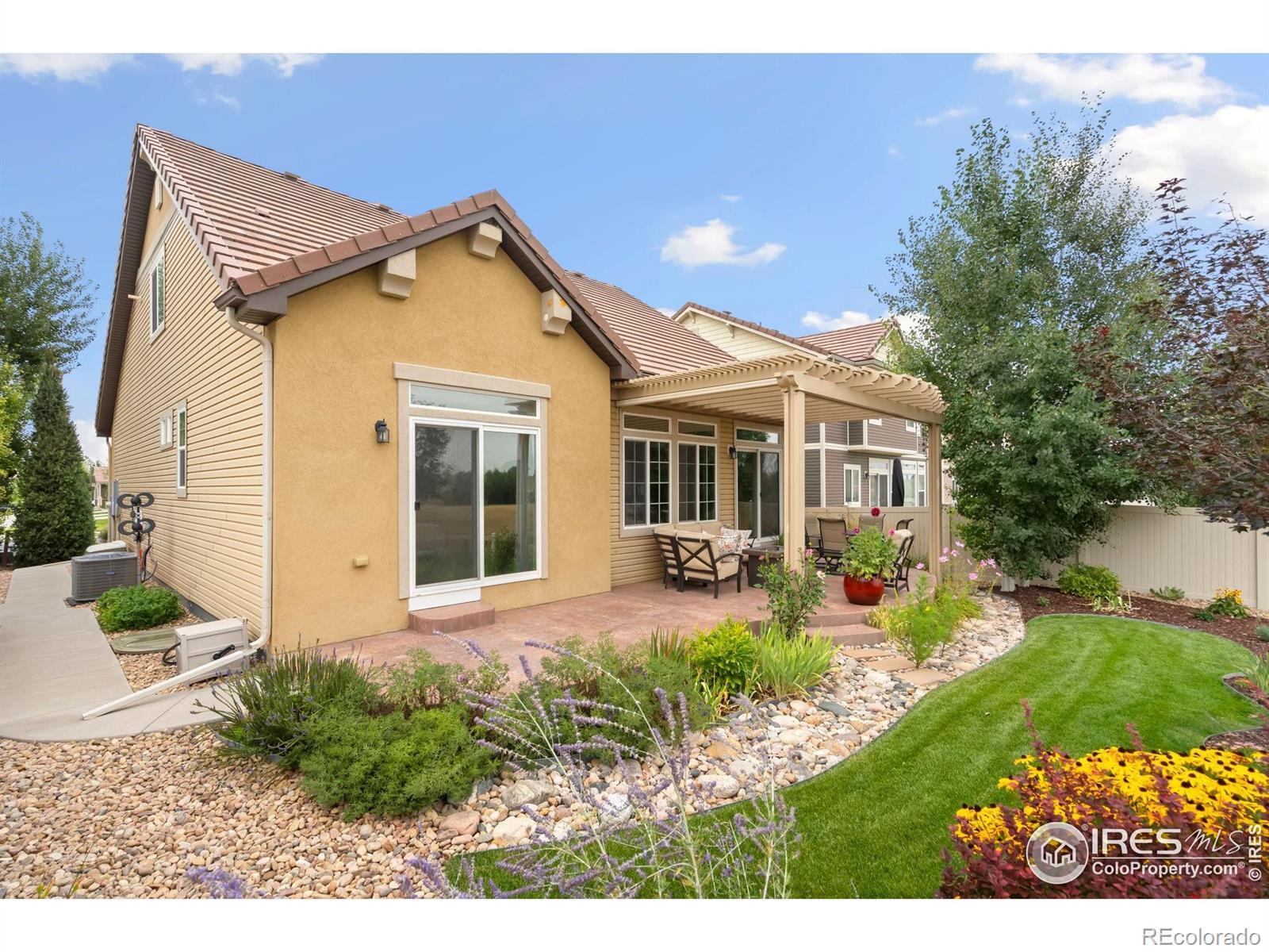 Breathtaking mountain views, main-floor living, and the best of Thompson River Ranch! Welcome to this beautifully designed 1.5-story home offering the perfect blend of comfort, style, and Colorado living. Positioned on a quiet street with a south-facing backyard that backs to open farmland, this home captures unobstructed Rocky Mountain views you'll never get tired of. Step inside to an open-concept floor plan filled with natural light and thoughtful design. The main floor primary suite provides easy living, featuring patio access to a custom-stamped concrete retreat with pergola and colorful landscaping - perfect for morning coffee or sunset gatherings. The gourmet kitchen includes granite countertops, a large island, gas range, and stainless-steel appliances, flowing seamlessly into the dining and living areas with engineered hardwood floors and a cozy gas fireplace. A split-bedroom layout adds privacy, with a secondary bedroom and bath on the main level, and a spacious upper-level rec room and third bedroom - ideal for guests, a home office, or hobby space. Enjoy resort-style neighborhood amenities: two swimming pools, disc golf course, clubhouse with fitness center, trails, and easy access to I-25, shopping, and top-rated schools. Additional features include a tile roof, stucco and vinyl exterior, and an attached two-car garage. This home is ready for new memories - and the view alone makes it a must-see!