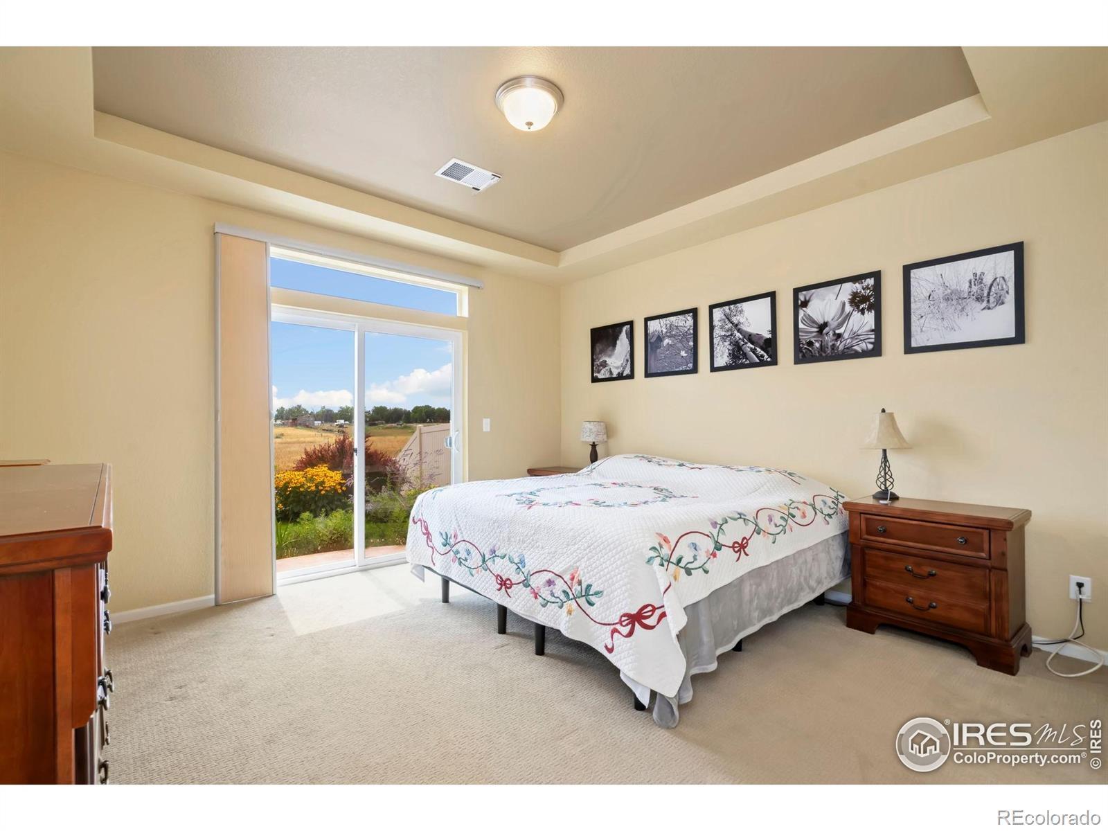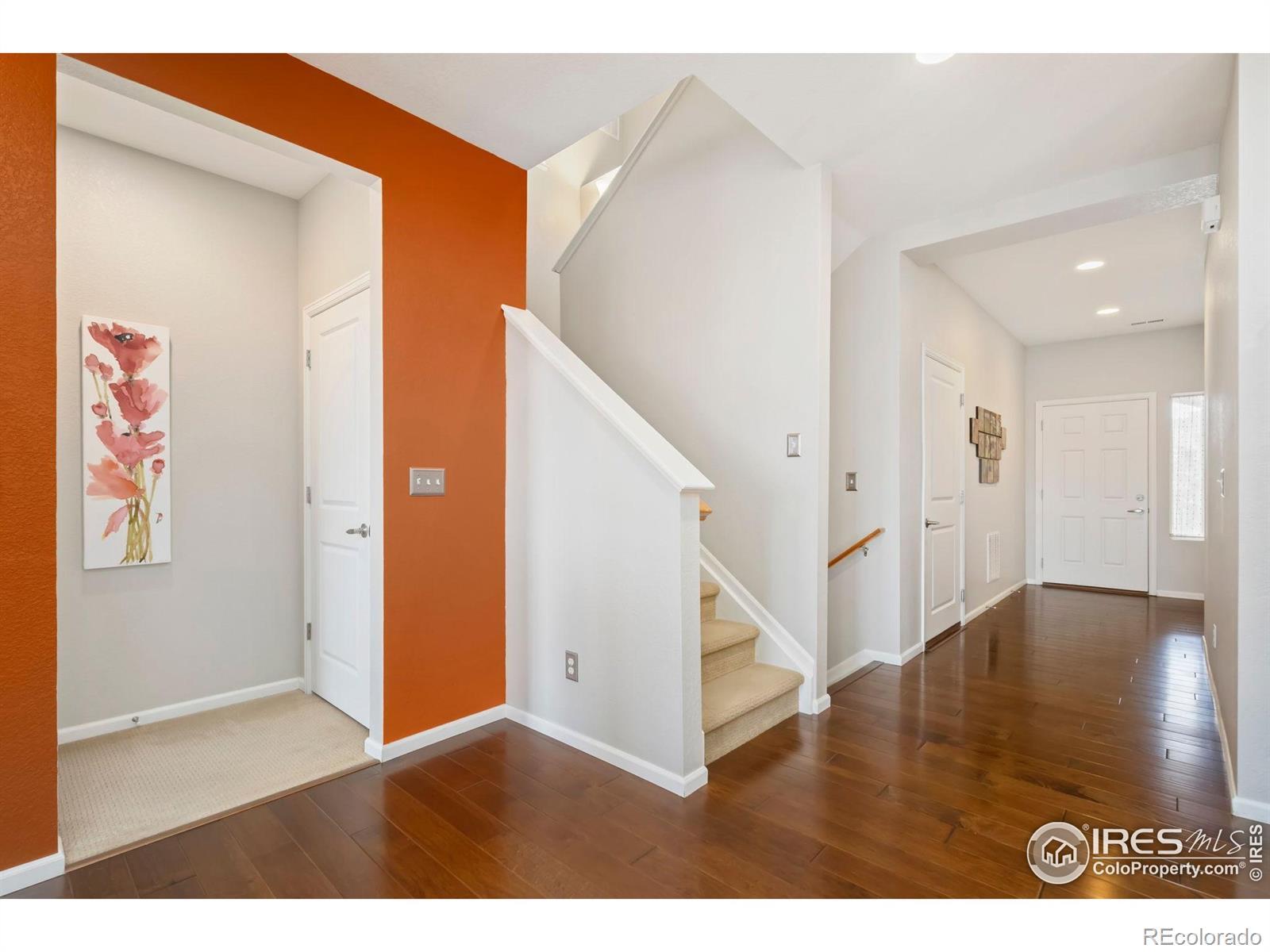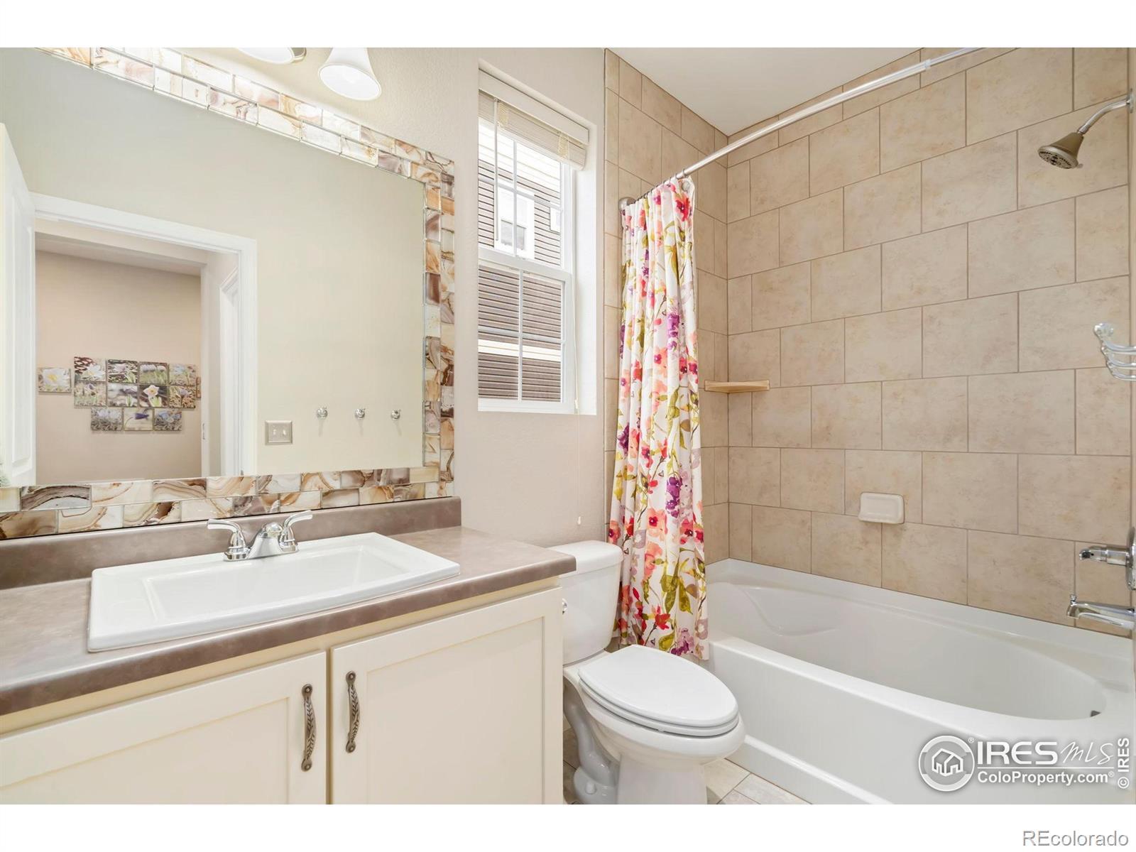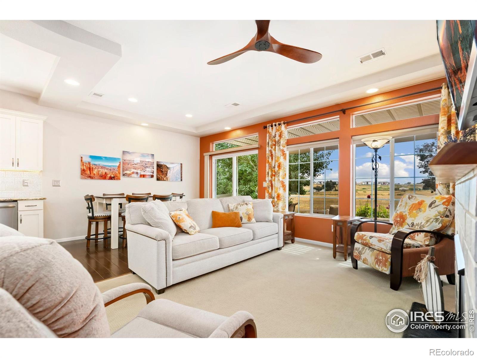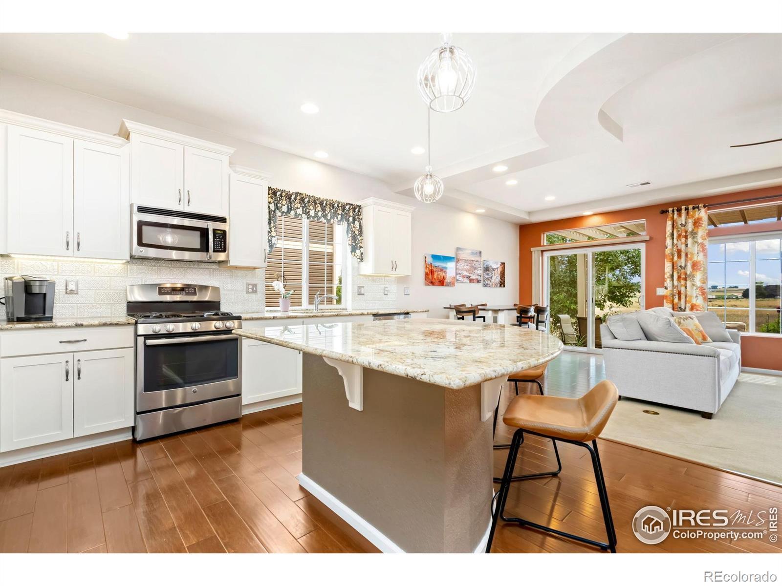 Breathtaking mountain views, main-floor living, and the best of Thompson River Ranch! Welcome to this beautifully designed 1.5-story home offering the perfect blend of comfort, style, and Colorado living. Positioned on a quiet street with a south-facing backyard that backs to open farmland, this home captures unobstructed Rocky Mountain views you'll never get tired of. Step inside to an open-concept floor plan filled with natural light and thoughtful design. The main floor primary suite provides easy living, featuring patio access to a custom-stamped concrete retreat with pergola and colorful landscaping - perfect for morning coffee or sunset gatherings. The gourmet kitchen includes granite countertops, a large island, gas range, and stainless-steel appliances, flowing seamlessly into the dining and living areas with engineered hardwood floors and a cozy gas fireplace. A split-bedroom layout adds privacy, with a secondary bedroom and bath on the main level, and a spacious upper-level rec room and third bedroom - ideal for guests, a home office, or hobby space. Enjoy resort-style neighborhood amenities: two swimming pools, disc golf course, clubhouse with fitness center, trails, and easy access to I-25, shopping, and top-rated schools. Additional features include a tile roof, stucco and vinyl exterior, and an attached two-car garage. This home is ready for new memories - and the view alone makes it a must-see!