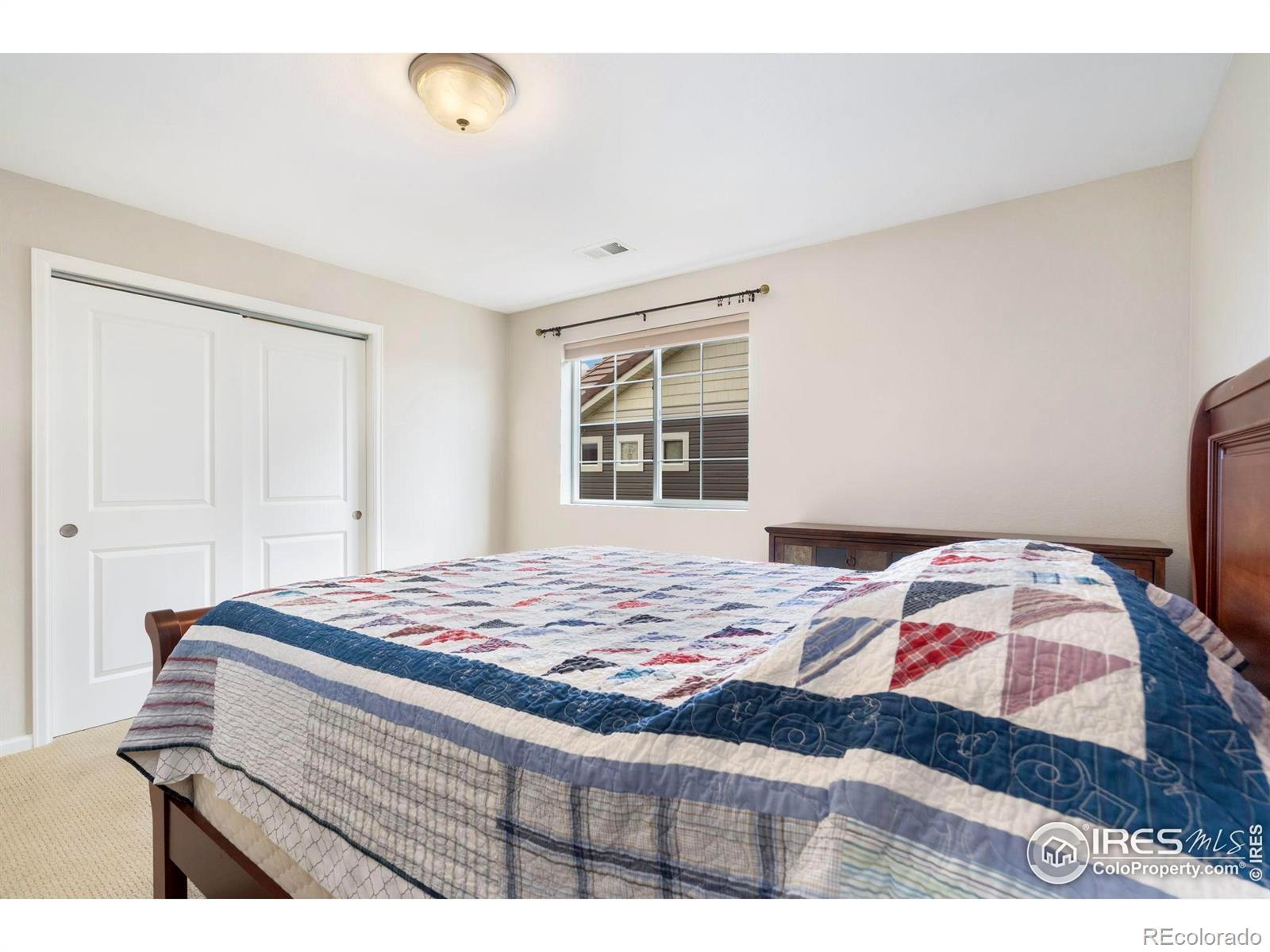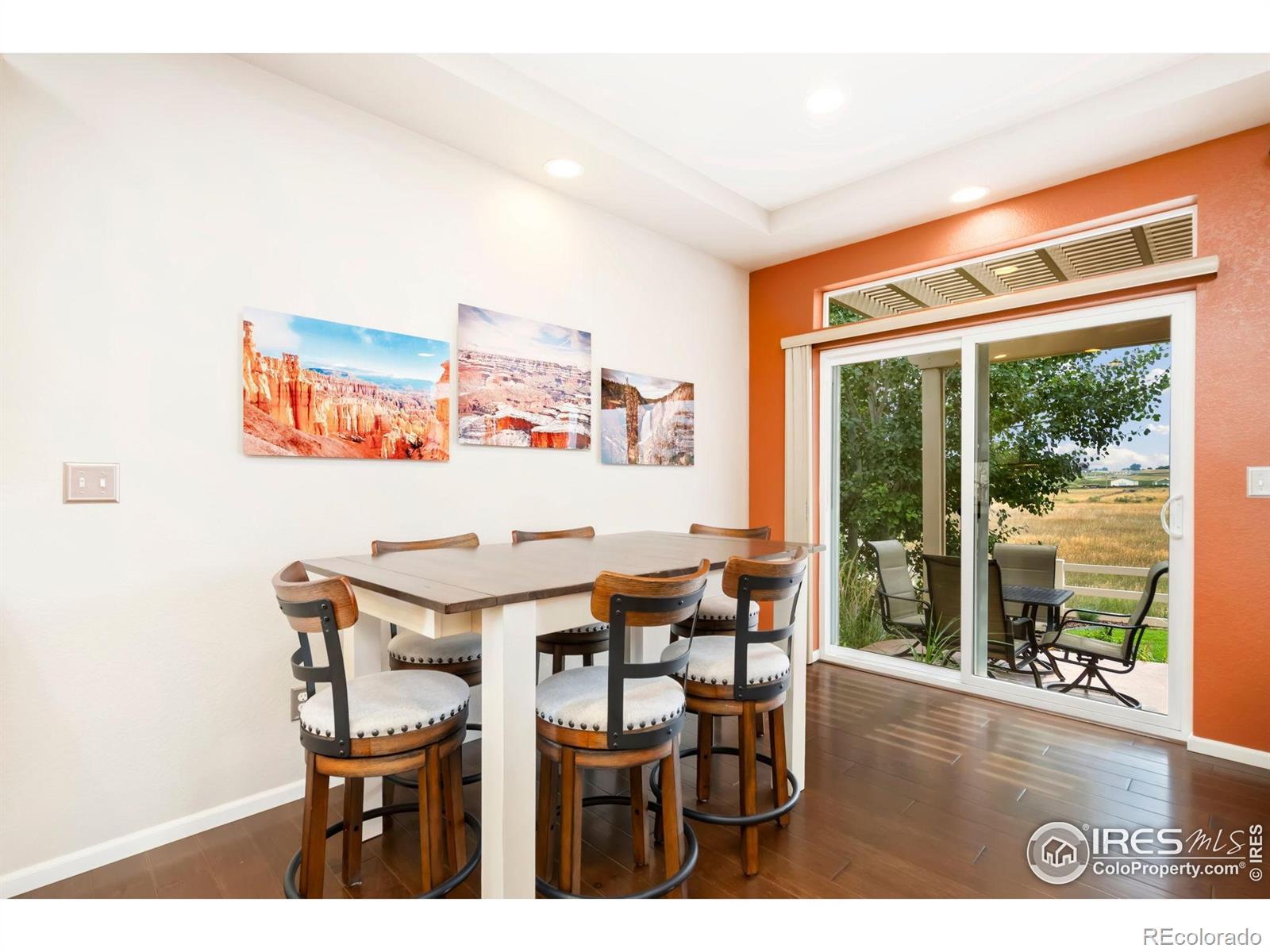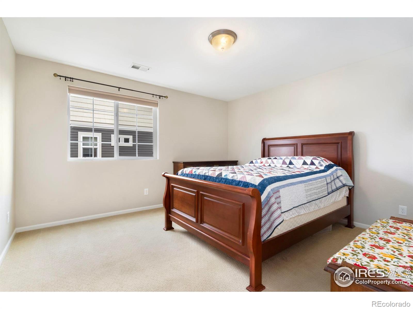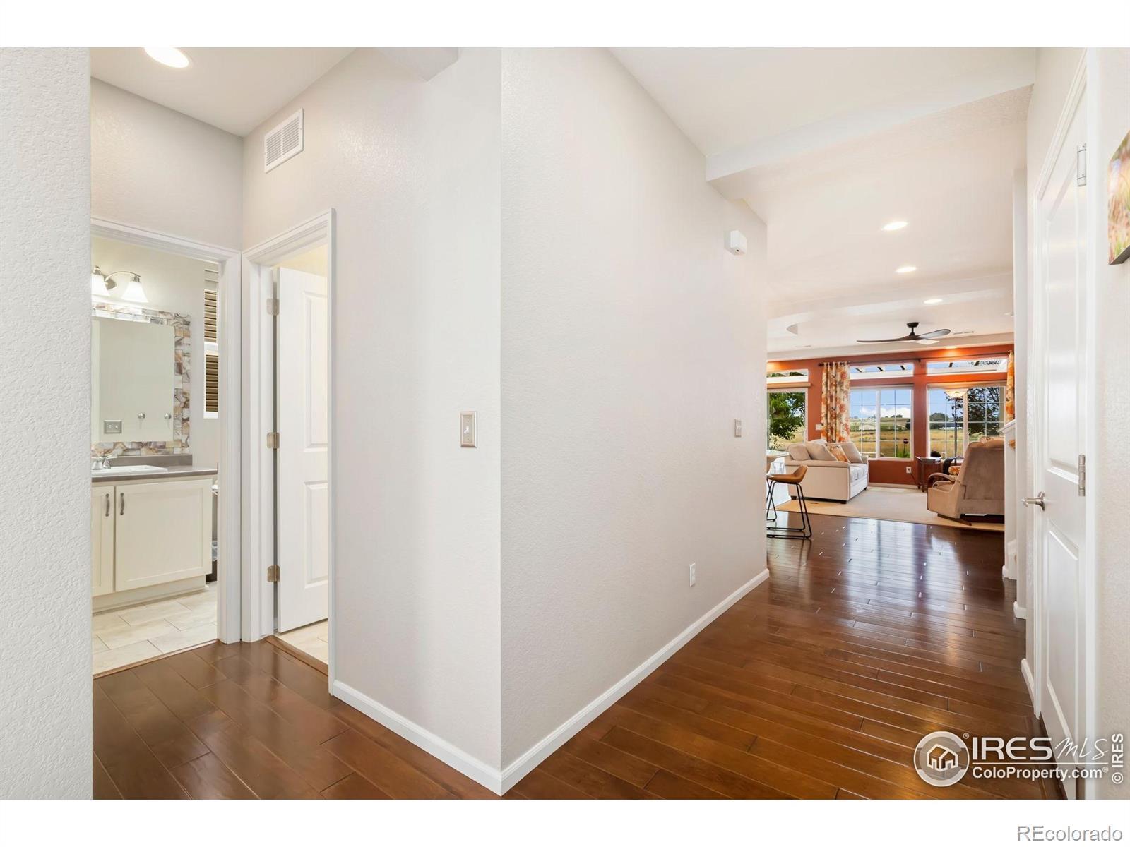 Breathtaking mountain views, main-floor living, and the best of Thompson River Ranch! Welcome to this beautifully designed 1.5-story home offering the perfect blend of comfort, style, and Colorado living. Positioned on a quiet street with a south-facing backyard that backs to open farmland, this home captures unobstructed Rocky Mountain views you'll never get tired of. Step inside to an open-concept floor plan filled with natural light and thoughtful design. The main floor primary suite provides easy living, featuring patio access to a custom-stamped concrete retreat with pergola and colorful landscaping - perfect for morning coffee or sunset gatherings. The gourmet kitchen includes granite countertops, a large island, gas range, and stainless-steel appliances, flowing seamlessly into the dining and living areas with engineered hardwood floors and a cozy gas fireplace. A split-bedroom layout adds privacy, with a secondary bedroom and bath on the main level, and a spacious upper-level rec room and third bedroom - ideal for guests, a home office, or hobby space. Enjoy resort-style neighborhood amenities: two swimming pools, disc golf course, clubhouse with fitness center, trails, and easy access to I-25, shopping, and top-rated schools. Additional features include a tile roof, stucco and vinyl exterior, and an attached two-car garage. This home is ready for new memories - and the view alone makes it a must-see!
