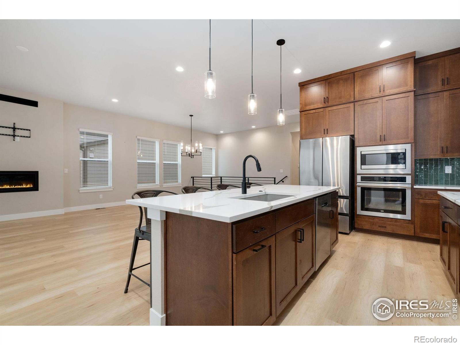 Crisp, modern Kitchel Lake ranch! Tall ceilings & open spaces through the kitchen, living & dining create a great space to gather & entertain! 5 bed, 3.5 bath, main floor office finished bsmt boasts large rec space & additional UF space for future expansion! Kitchen features upgraded cabinetry reaching to the ceiling for ample storage, spacious island, gas cooktop w/range hood & pantry. Spa-like 5pc primary bath w/stand alone tub. Gorgeous LVP flooring, quartz countertops, linear fireplace & modern stair railing. Covered back deck & paved walking trail behind the backyard!