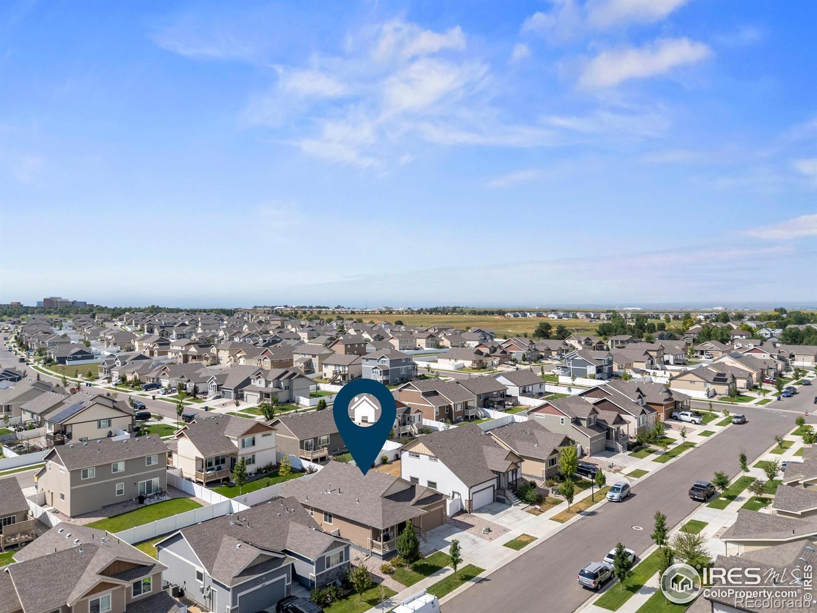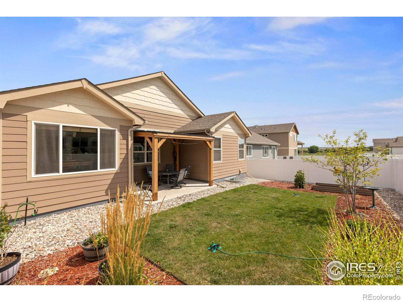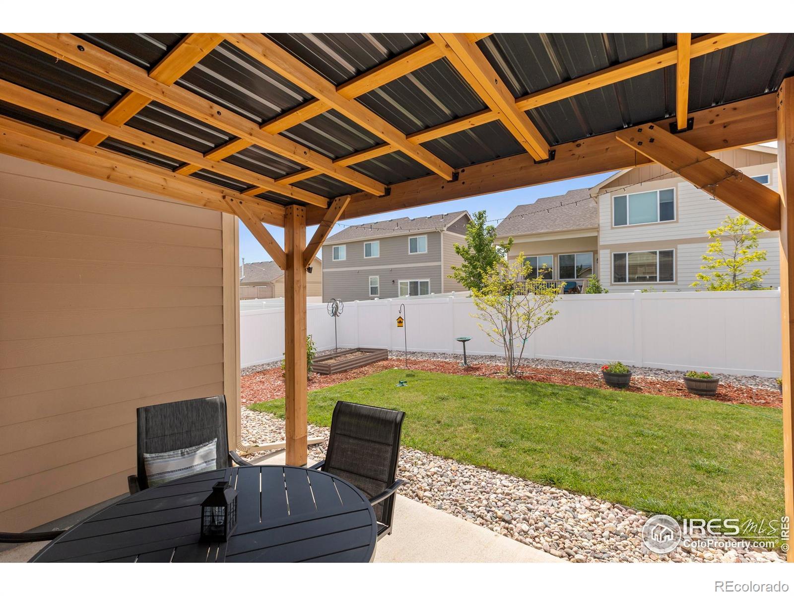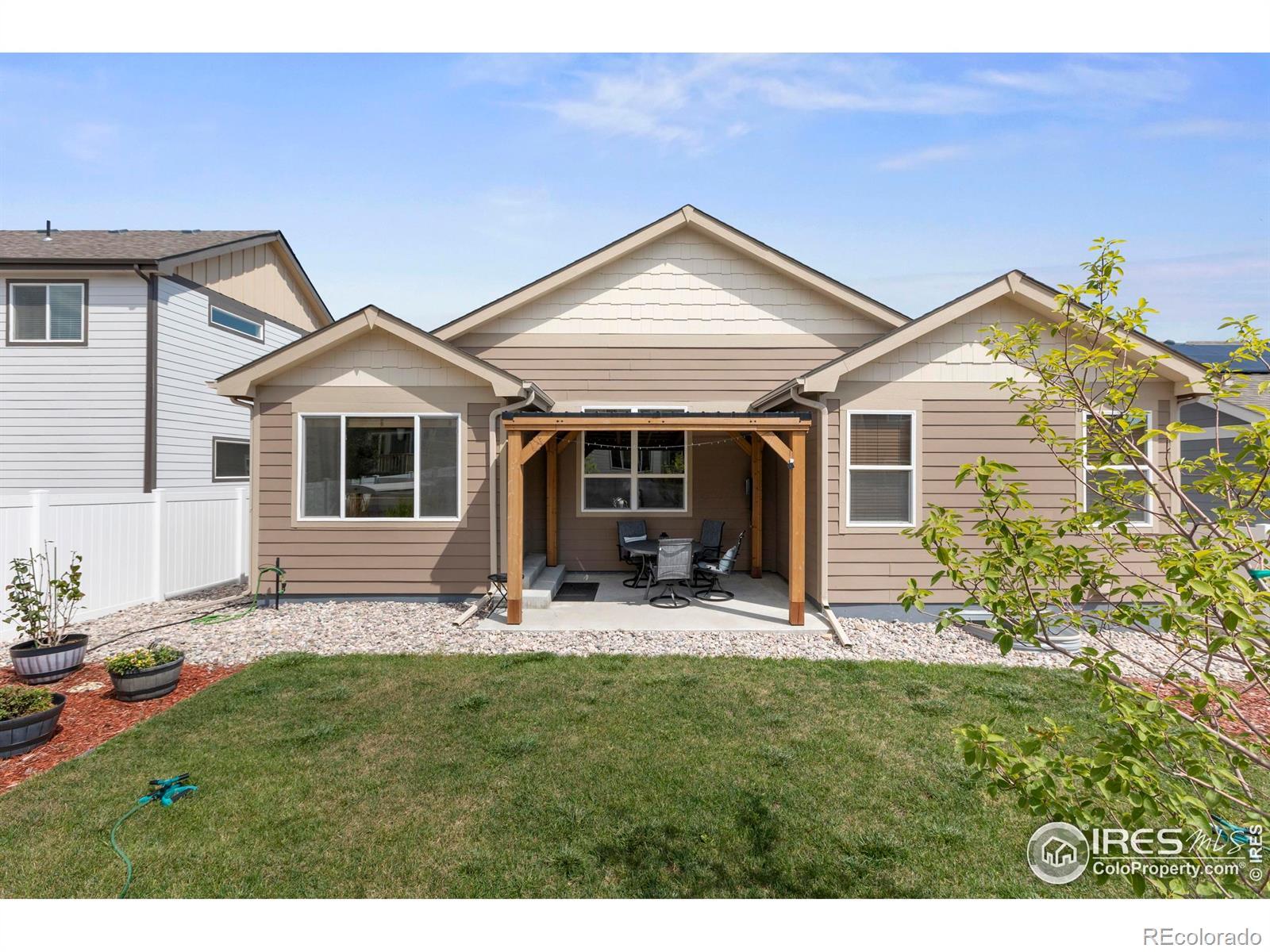 This ranch brings together open indoor living and outdoor space designed to be enjoyed. The main level offers 10-foot ceilings that make the kitchen, dining, and living areas feel even more spacious and connected. Three bedrooms and two full baths, including a primary suite with walk-in closet, keep daily life convenient. A full unfinished basement adds another 1,465 sq. ft. to use for storage now or finish later to suit your needs. A covered front patio welcomes you to the home, giving shaded space to relax. Out back, the fully fenced yard extends your living space with a custom pergola over an expanded patio, neatly landscaped with planters and a raised garden beds. It's a comfortable setting for both quiet evenings and gatherings. The neighborhood adds to the appeal with nearby Promontory Park's walking trails, ponds, and recreation, plus quick access to Windsor and Greeley for shopping, dining, and commuting.