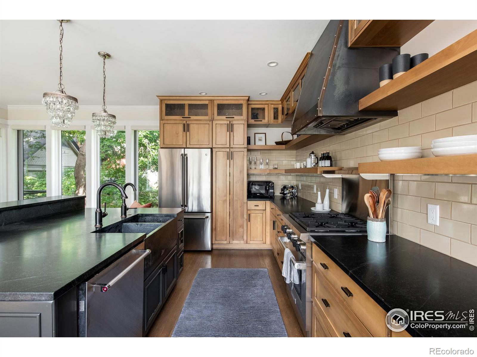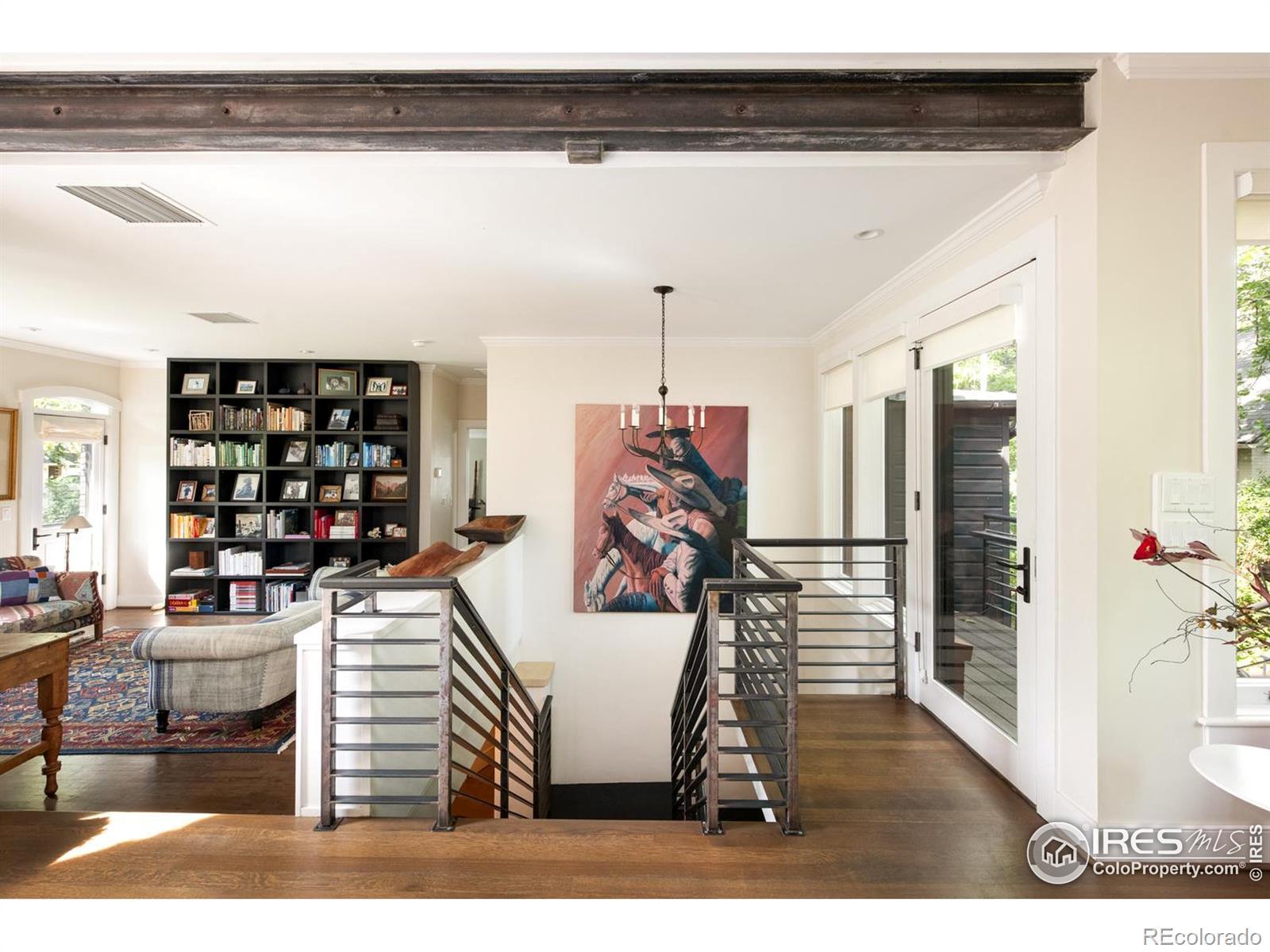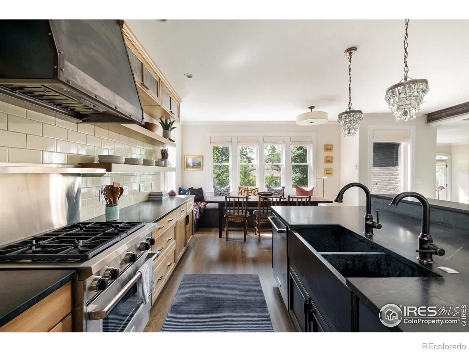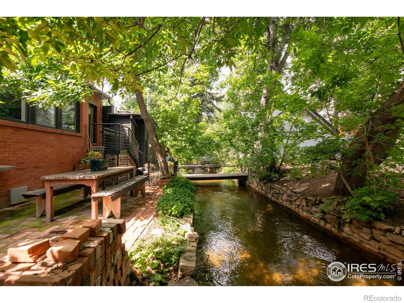 Historic charm meets modern sophistication in this award-worthy Mapleton Hill residence, steps from Pearl Street and Boulder's trail system. Thoughtfully restored inside and out, the home balances timeless architecture with contemporary comforts. The gourmet kitchen is the centerpiece of the main level, featuring custom cabinetry, a Wolf range with a custom steel hood, soapstone countertops, and an oversized island ideal for gathering. Large windows with Southern and Northern exposure, custom built-ins, and a gas fireplace frame Sun-filled living spaces. A striking steel staircase with open wood treads adds architectural interest, while glass doors open to a private streamside patio and lush irrigated gardens. The primary suite features outdoor access, a walk-in closet with custom shelving, and a spa-like bath equipped with a double vanity, steam shower, and a copper soaking tub. The lower level provides two additional bedrooms with adjacent baths, an office, and a mudroom with easy access to storage and mechanicals.Additional features include central AC, radiant heating, a new standing seam metal roof, and valuable water rights. Combining an unbeatable downtown location with elevated design, this property offers a rare opportunity to own a piece of Boulder history, updated for modern living.