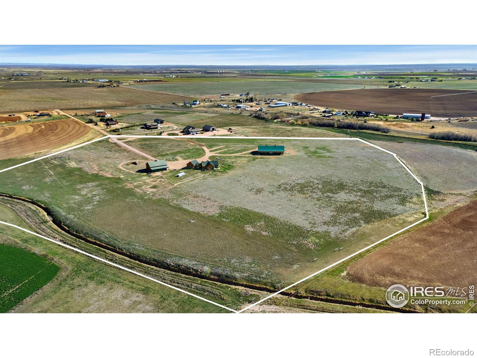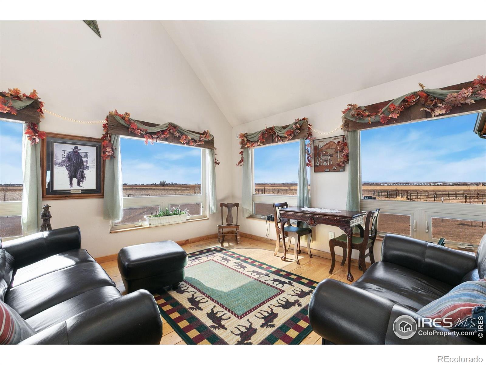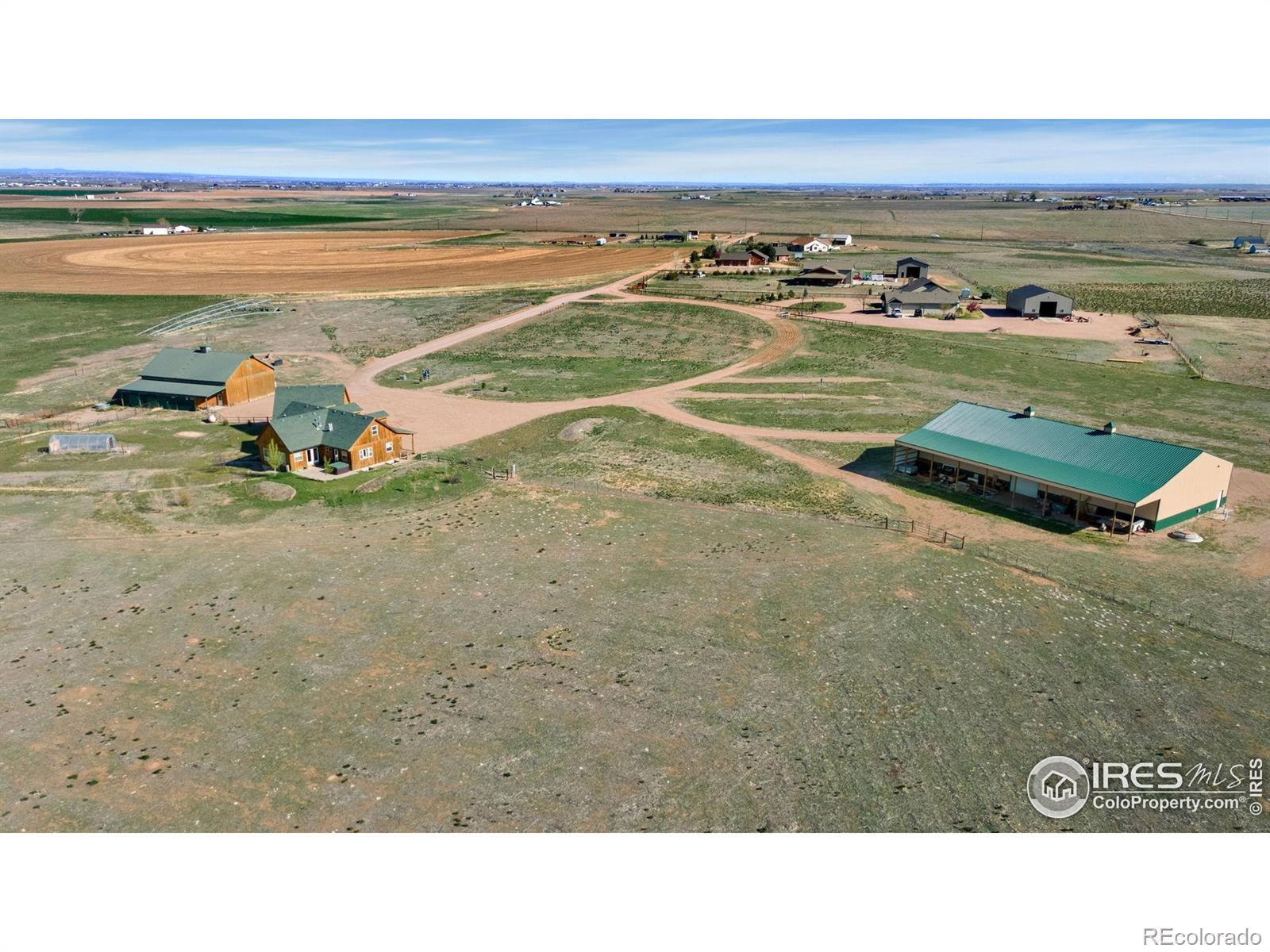 Everything you could possibly look for in a country estate at a brand new price! Only minutes from Eaton & Ault, this property has incredible value with endless possibility. Nestled on 28 acres in Weld County, this is the turn-key country property you've been waiting for. The property features a 4,550 sq. ft. custom ranch-style home with 6 bedrooms, 4.5 bathrooms, 2-car attached garage, 5,000 sq. ft. detached metal outbuilding, 3,016 sq. ft. barn with 2 stalls, 3 RV pads, greenhouse, and more! Inside the home, you'll find an open layout with vaulted ceilings, hardwood and tile flooring, custom cabinetry, and detailed woodwork. The spacious kitchen boasts updated stainless steel appliances, granite countertops, large pantry and ample counter space. The primary suite includes a 3/4 bath and walk-in closet. The home also features a separate dining room and a fully finished basement with an additional kitchen area, bedrooms, and entertainment space. Large windows throughout the home fill the space with natural light and offer beautiful mountain views of the front range. Outside, you will enjoy the expansive, fully covered front porch, perfect for relaxing on summer evenings. The property is equipped with outdoor waterers, strategically placed for gardening, livestock, and landscaping. The barn includes 2 stalls with a large run, tack room, hay storage, and a shop/office with a concrete floor. Water and electricity have been installed to the shop, barn, stalls, and RV pads on the property. RV pads also have septic, adding income potential to the property! Property is equipped with 220 to the barn & 320 amp service in metal outbuilding. With NO HOA, this property is ideal whether you need space for horses and livestock or are simply seeking the tranquility of country living. Opportunity abounds.