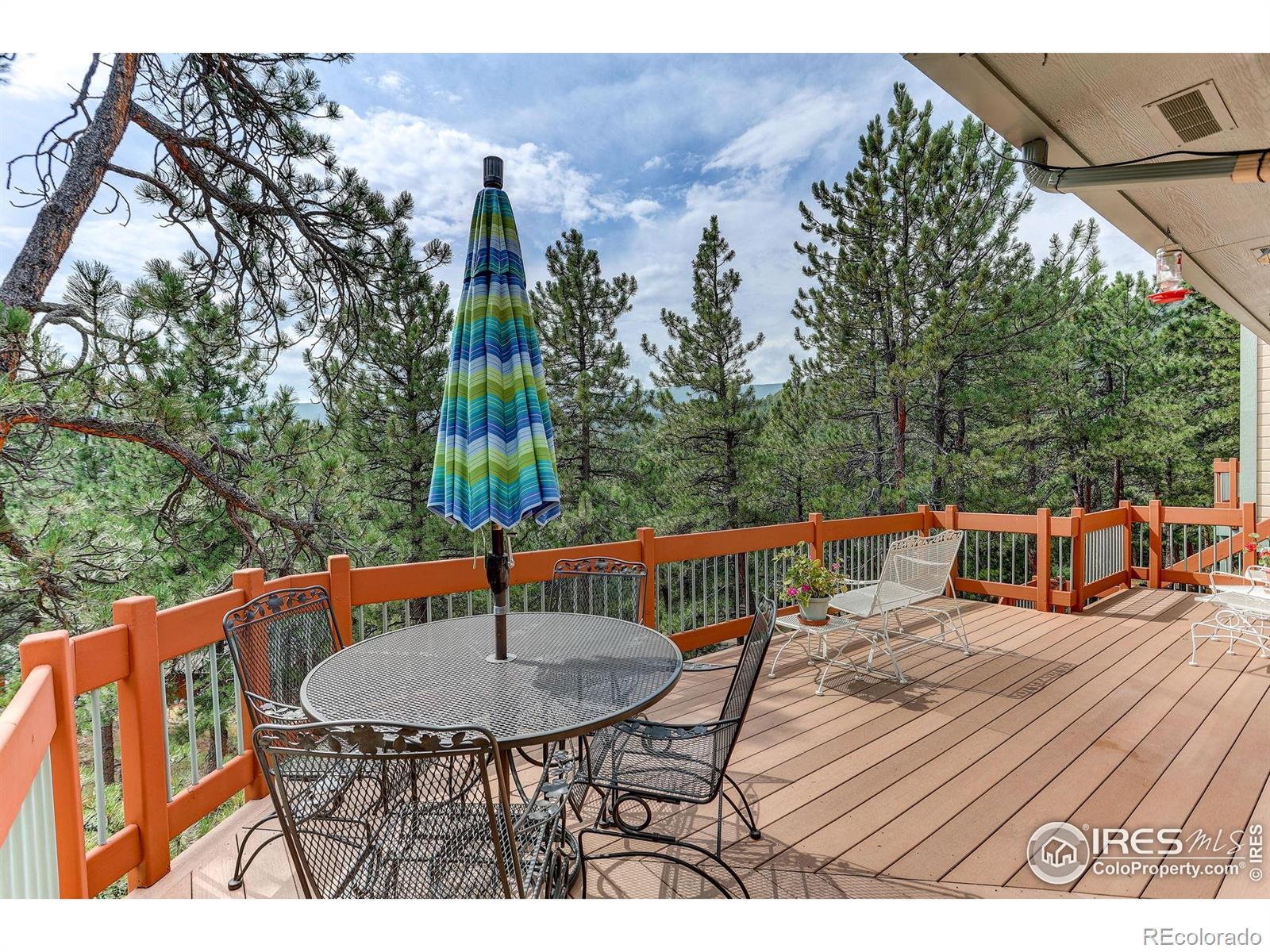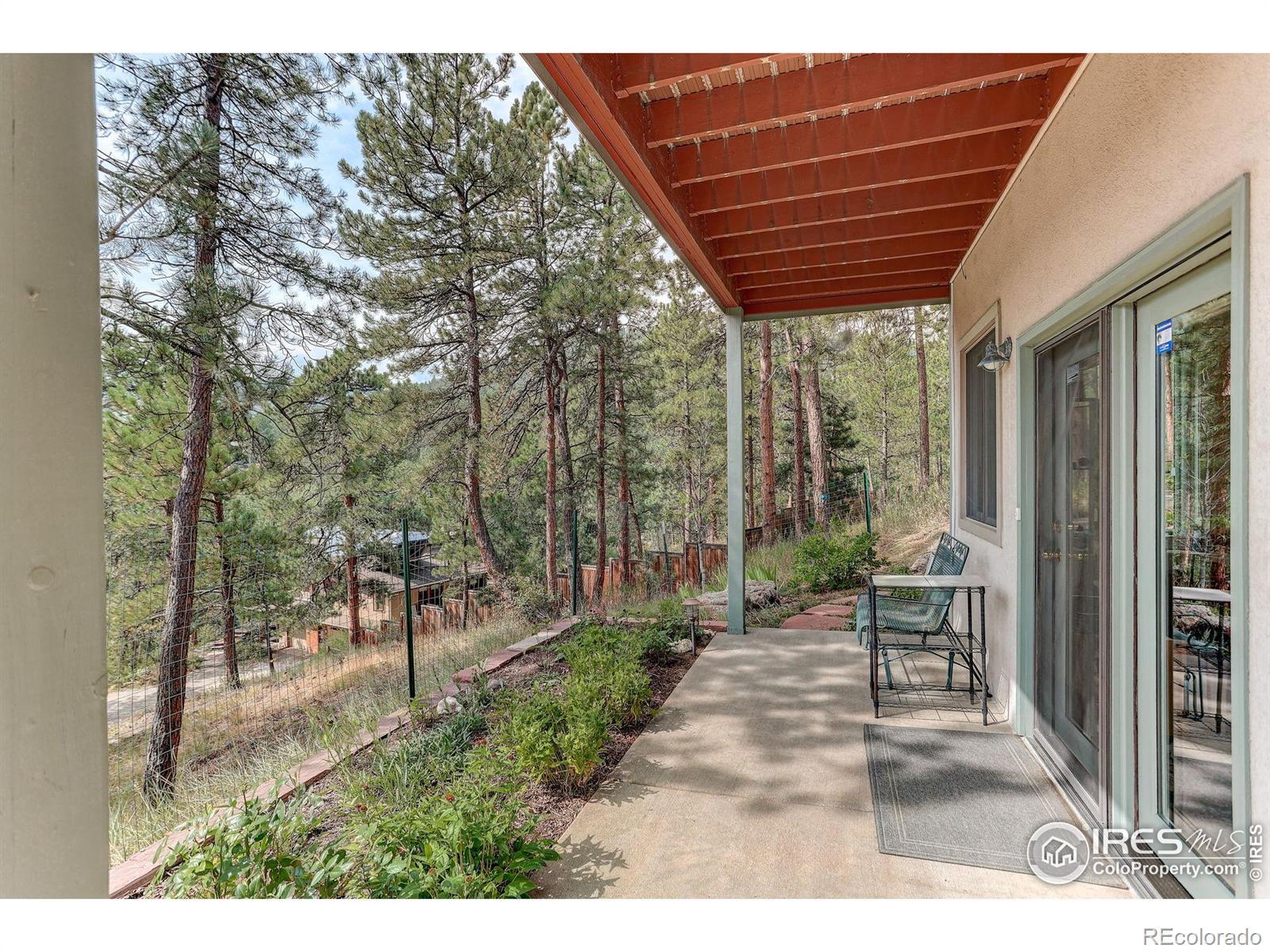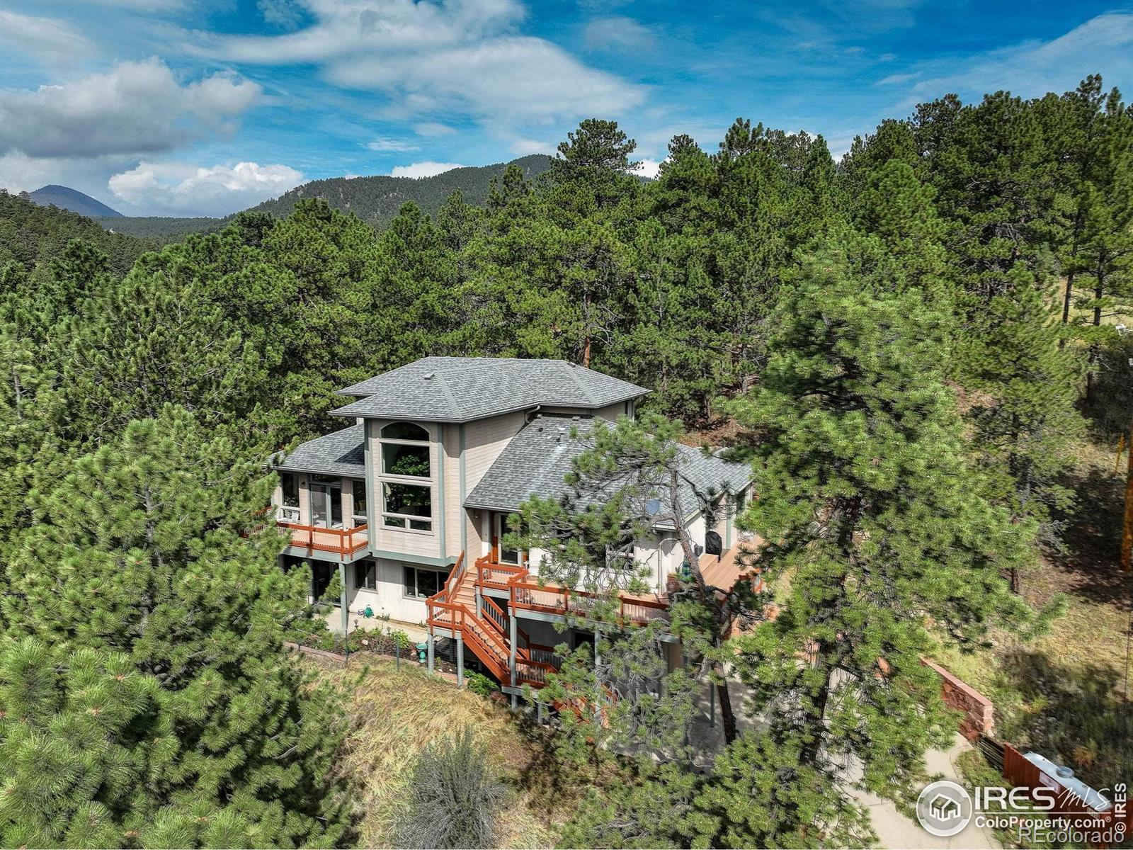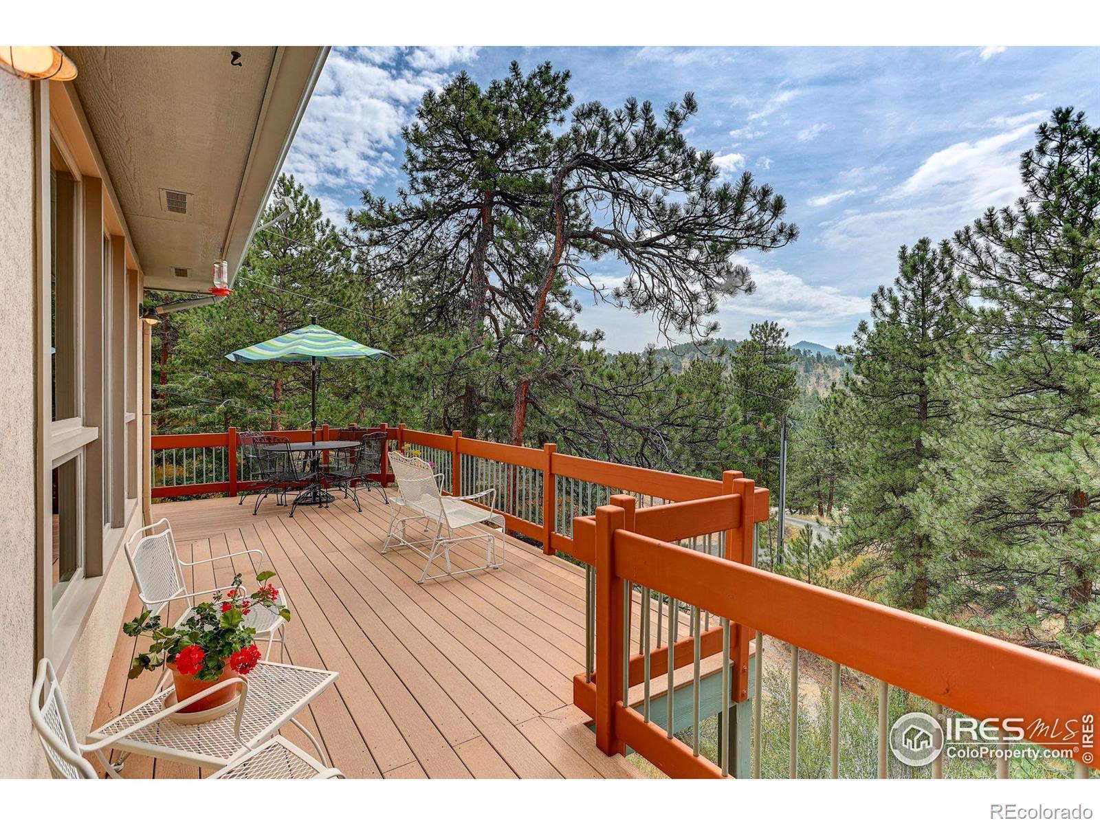 Meticulous Mountain Retreat Offered by the Original Owners. Set on over an acre with dramatic rock outcroppings, this well-cared-for home is surrounded by pink flagstone patios, stone walkways, and a wraparound deck designed for year-round outdoor living and entertaining. Inside, soaring ceilings and new windows with ideal southern exposure create a bright, open atmosphere. The main level features a spacious primary suite with deck access, two closets, including a walk-in, and a 5-piece bath with a jetted tub. The updated kitchen offers natural stone countertops, KitchenAid appliances, a glass tile backsplash, and a sunny breakfast nook flowing into the family room with a gas fireplace and wet bar. Upstairs are two secondary bedrooms that are spacious and bright. The walk-out lower level includes a light-filled office and recreation room. Recent updates include refinished white ash wood floors on the main level, a new furnace, new roof, and whole-house water filtration system. Added conveniences include a paved driveway, a partial-house generator, and easy access to both outdoor adventure and city amenities. With panoramic views, this home is just 10 minutes to Pearl Street Mall and moments from the 800-acre Betasso Preserve with hiking and biking trails-offering the best of mountain living close to town.