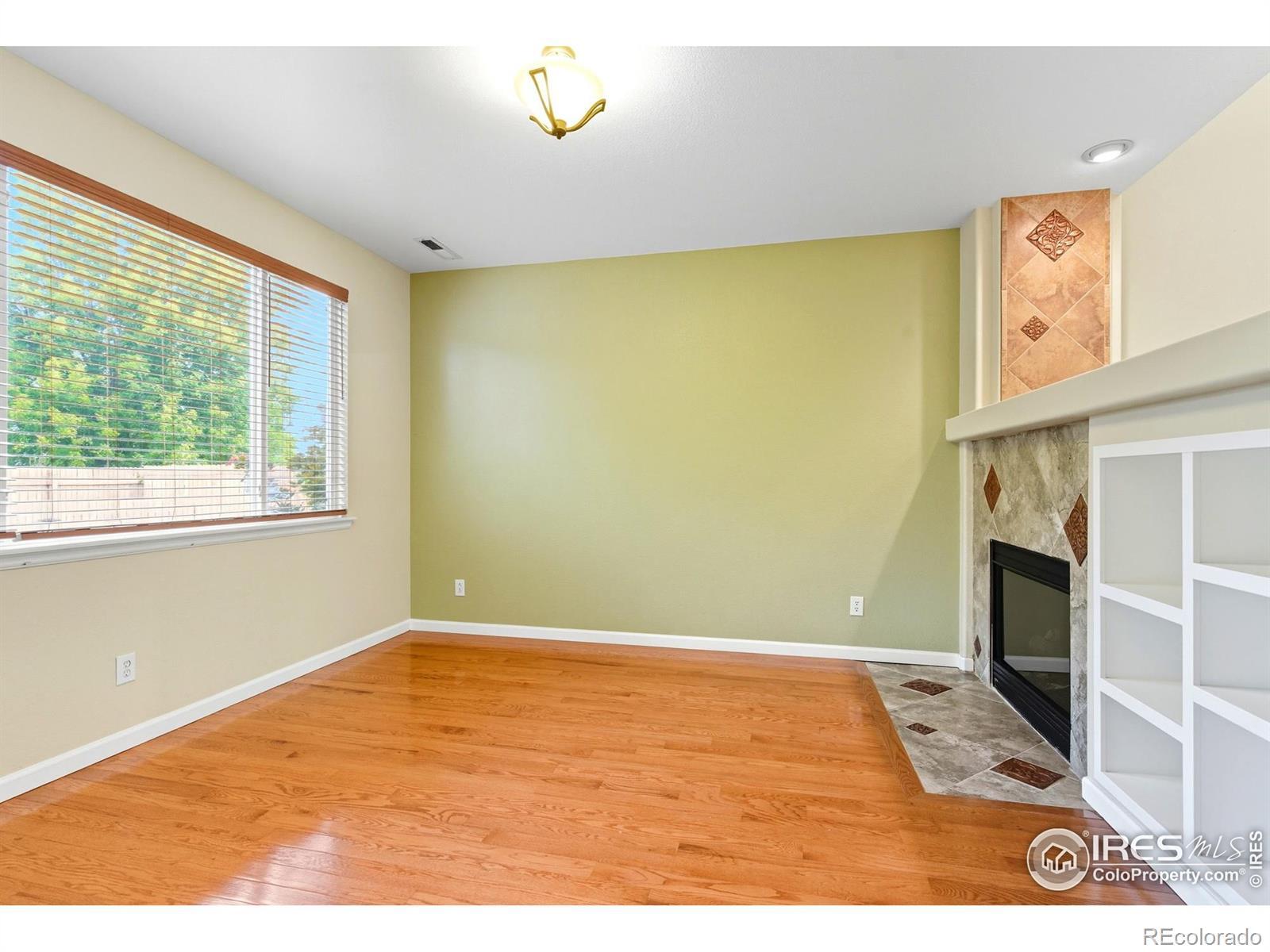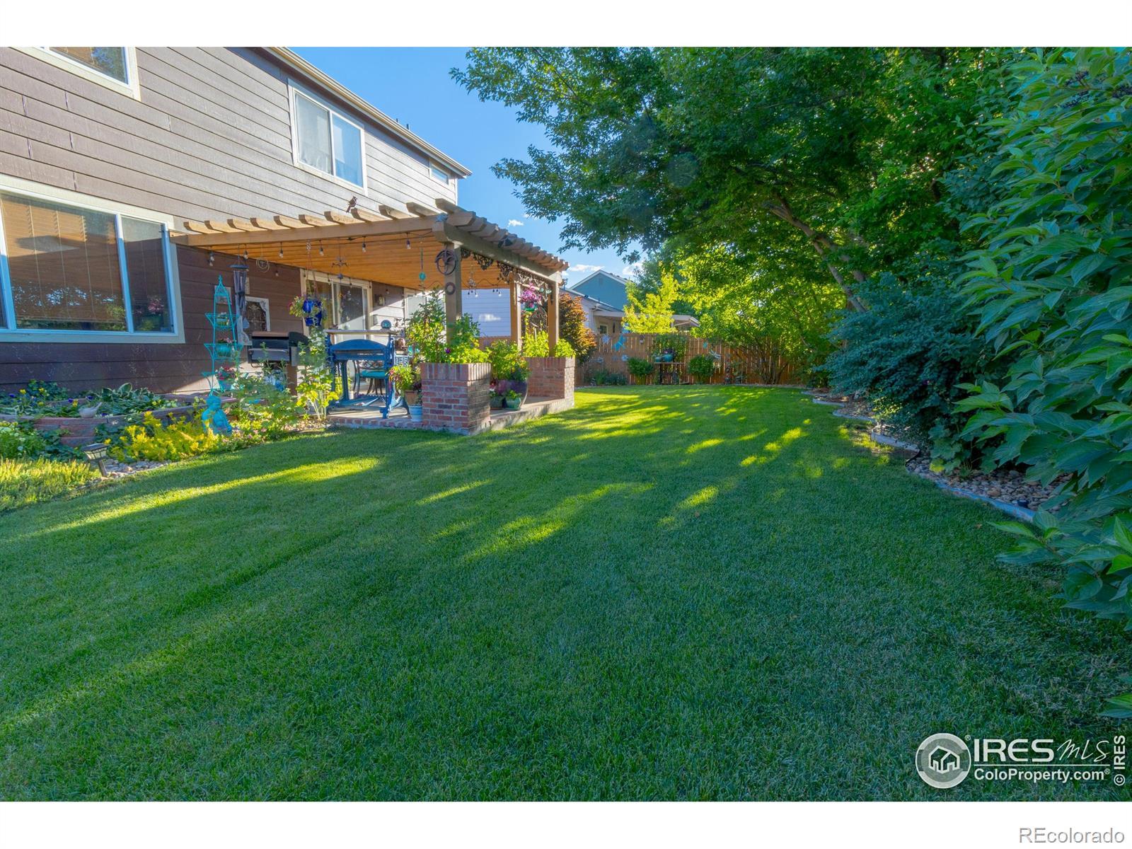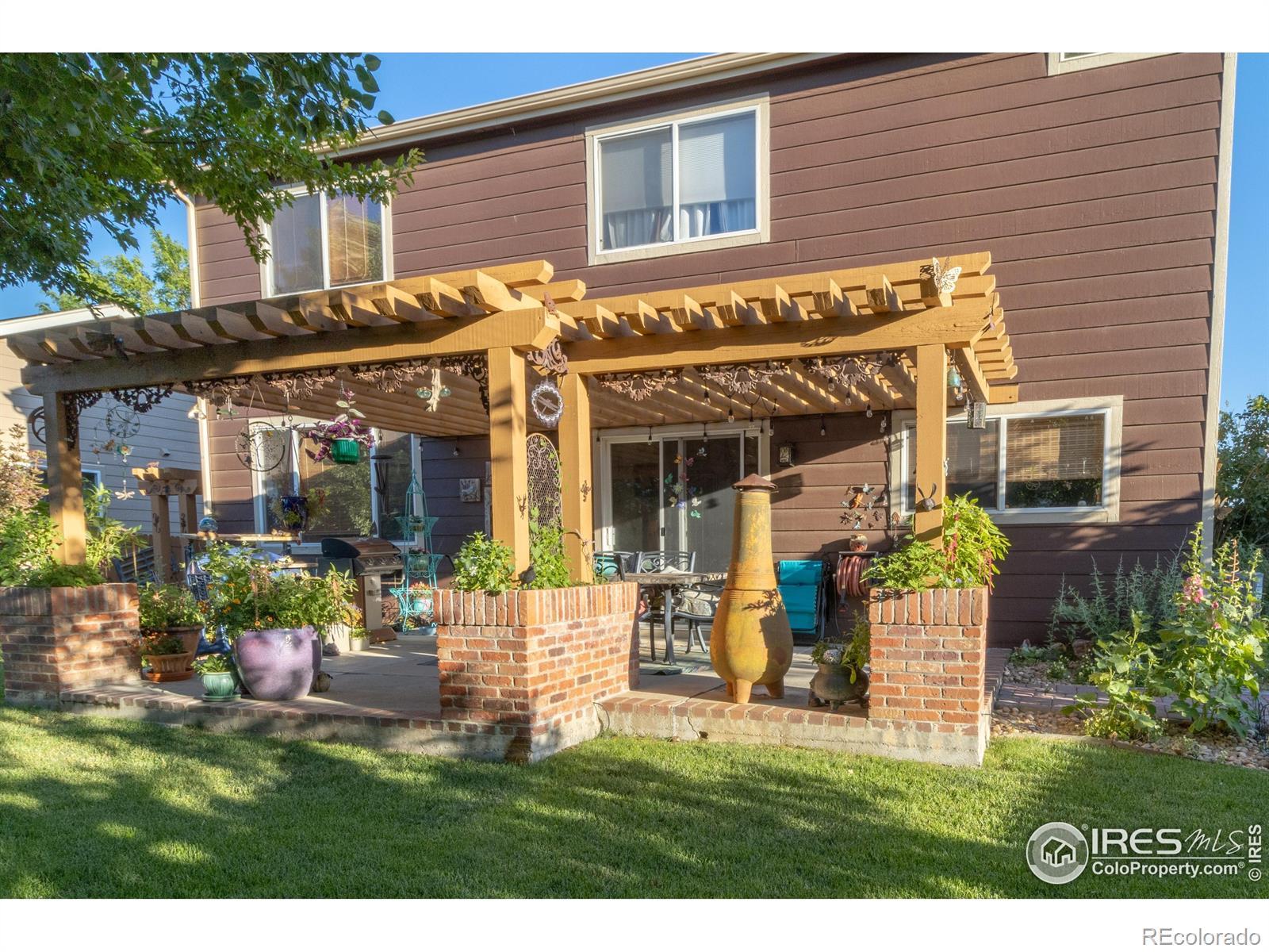 Welcome home! Step inside and see the pride of ownership throughout this 3 bedroom home. Inside you will be met with beautiful hardwood floors and a cozy double sided fireplace. Custom built in shelves give ample room for decor and storage in the family room. The large eat in kitchen features upgraded granite countertops, lots of cabinet space and a large window over the kitchen sink. Upstairs you will find the spacious loft area with more built in shelving! The primary bedroom is equipped with hardwood floors and and attached full bathroom. Another full bathroom and 2 more bedrooms complete the 2nd floor. The backyard is the stuff dreams are made of! Enjoy the private large patio, pergola and large mature trees. Years of thoughtful planning and planting went into this backyard oasis to make it a peaceful relaxing retreat, right outside the back door! With easy access to I-25, and it a lovely community, this home in Sharpe Farms is a must see!!!
