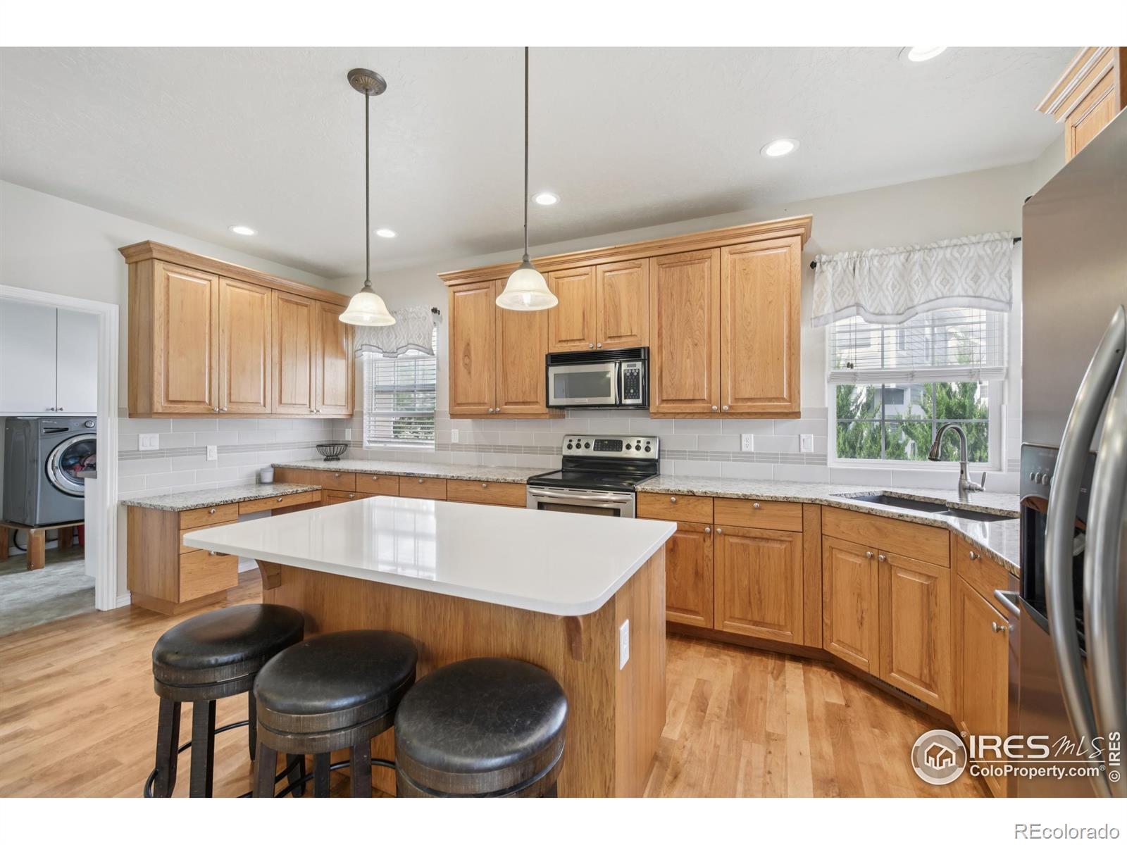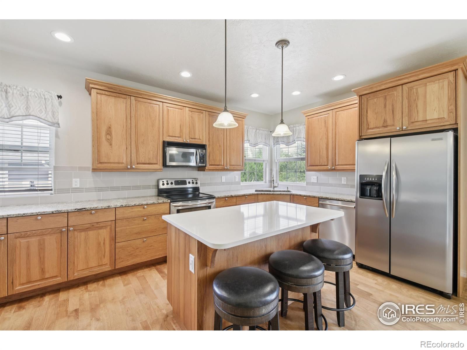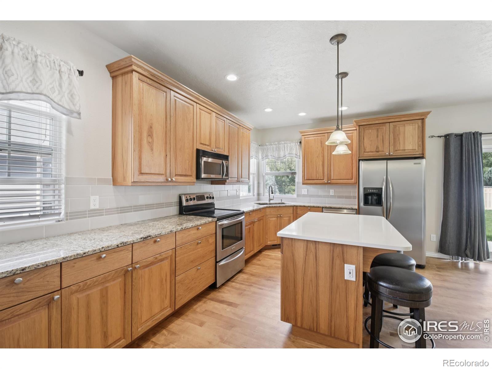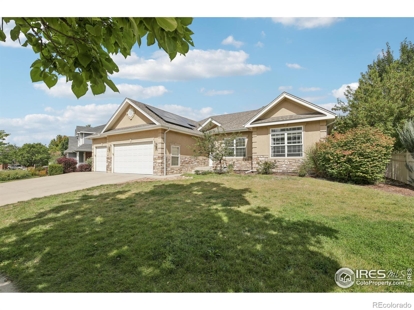 $5000 in seller concessions offered to buyers for closing costs or rate buydown. Welcome to 212 N 54th Ave-an exceptional 5-bedroom, 3-bath ranch-style home in Greeley's desirable Forest Glen at Kelly Farm. With over 3,500 finished square feet on a beautifully landscaped lot, this home offers refined comfort and everyday functionality in one elegant package.The open-concept main level is designed for both connection and relaxation, featuring vaulted ceilings, soft natural light, and a warm blend of newer carpet and hardwood flooring. The living room centers around a gas fireplace, while the spacious kitchen offers generous prep space, an eat-in layout, and easy flow into the dining area-perfect for entertaining or casual nights in. The fully finished basement expands your living space with a large rec room, wet bar, two additional bedrooms, and a gym. An electric fireplace adds ambiance, and upgraded lighting, high-mounted outlets, and a dedicated garage circuit enhance function and flexibility throughout. Step outside to enjoy the thoughtfully designed backyard retreat, complete with a covered patio, custom lighting, and a built-in granite table feature ideal for dining and entertaining under the Colorado sky. The oversized 3-car garage features fresh epoxy flooring and built-in workbenches for hobbyists and gearheads alike. Sustainability meets style with an owner-owned solar panel system-keeping electric bills astonishingly low, around $9/month.Located just minutes from parks, schools, shopping, and Greeley's vibrant cultural scene, this home combines quiet neighborhood living with everyday convenience.